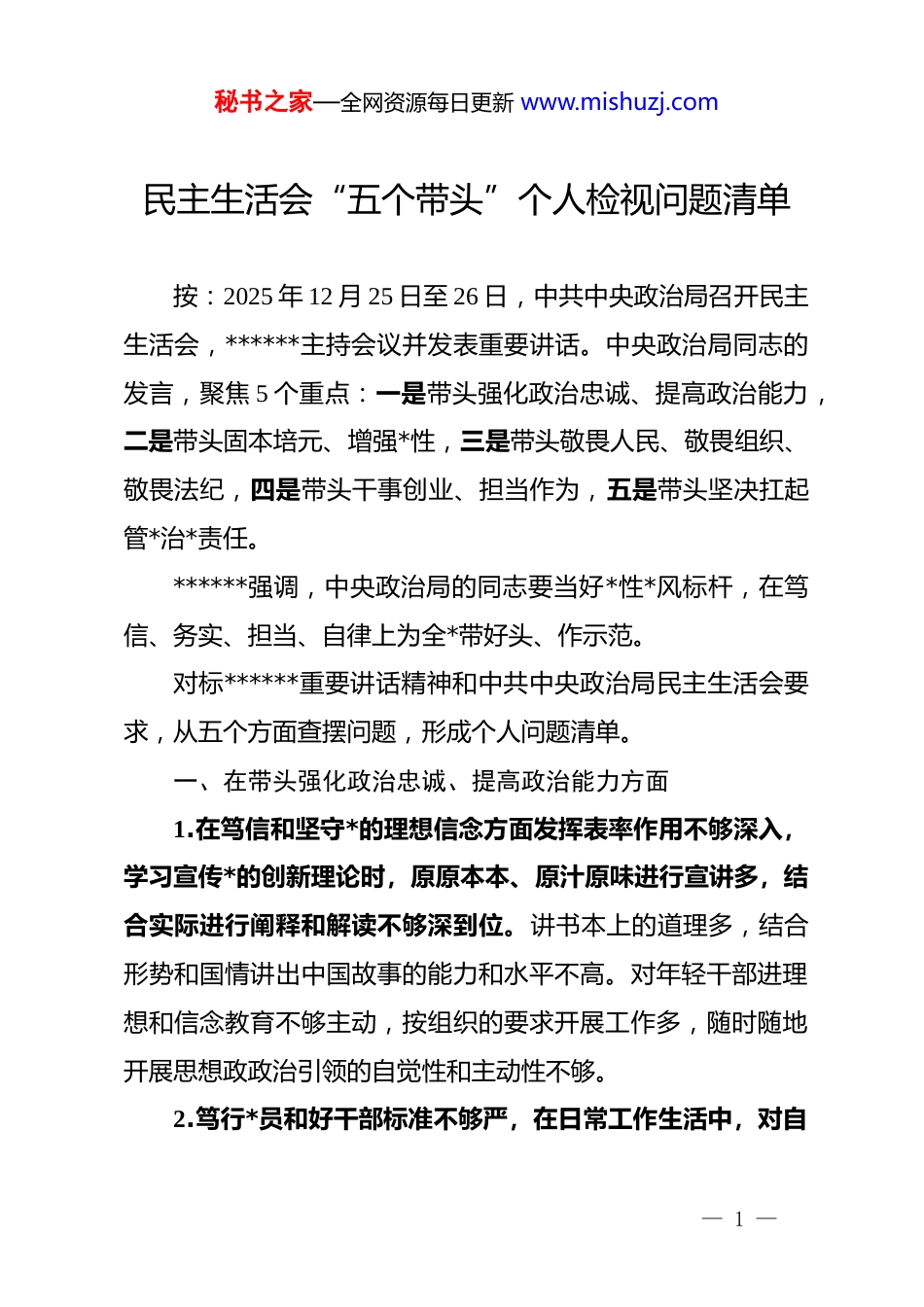 秘书之家—全网资源每日更新 www.mishuzj.com民主生活会“五个带头”个人检视问题清单按:2025 年 12 月 25 日至 26 日,中共中央政治局召开民主生活会,******主持会议并发表重要讲话。中央政治局同志的发言,聚焦 5 个重点:一是带头强化政治忠诚、提高政治能力,二是带头固本培元、增强*性,三是带头敬畏人民、敬畏组织、敬畏法纪,四是带头干事创业、担当作为,五是带头坚决扛起管*治*责任。******强调,中央政治局的同志要当好*性*风标杆,在笃信、务实、担当、自律上为全*带好头、作示范。对标******重要讲话精神和中共中央政治局民主生活会要求,从五个方面查摆问题,形成个人问题清单。一、在带头强化政治忠诚、提高政治能力方面1.在笃信和坚守*的理想信念方面发挥表率作用不够深入,学习宣传*的创新理论时,原原本本、原汁原味进行宣讲多,结合实际进行阐释和解读不够深到位。讲书本上的道理多,结合形势和国情讲出中国故事的能力和水平不高。对年轻干部进理想和信念教育不够主动,按组织的要求开展工作多,随时随地开展思想政政治引领的自觉性和主动性不够。2.笃行*员和好干部标准不够严,在日常工作生活中,对自— 1 —秘书之家—全网资源每日更新 www.mishuzj.com身要求不高,满足于不违规、不逾矩的时候多,对照“高线”从严要求自觉性不够。在践行“两个维护”发挥表率作用不充分,有时觉得只要自己做到了就行,默默坚守的时候多,主动进行宣传和倡导的勇气偶有不足。3.整治错误思潮还不够主动,在日常工作生活中,对错误思潮、不良言论避而远之的时候多,主动进行干预和制止的勇气不足。有时也有事不关己的态度,心想只要自己不参与,别人的言行不用负责,自觉进行抵制、或进行举报的努力不多。4.贯彻落实*中央决策部署不同程度地存在时差、温差、色差和温差,有时觉得应该等上级单位有政策再行动,不同程度地存在“等靠”思想,按上级会议要求抓落实的时候多,主动想办法、出思路的努力不多。在抓落实时,完成“规定动作”多,结合实际推进特色工作不够。二、在带头固本培元、增强*性方面1.理论武装不够深入,学习的形式不够丰富多样,在室内开展政治学习和理论学习的时候多,深入革命教育基地、田间地头、工厂车间进行实践教学不充分。通过主题学习、专题培训等形式开展集中学习的时候多,自觉读原文悟原理的努力还不够,落实“第一议题”制度不够到位。2.锤练道德品行不够自觉。有时存在盲目自信,觉得自己— 2 —秘书之家—全网资源每日更新 www.mishuzj.com能做到老老实做人、干干净净做事,人品不至于太差。在日常工作中,按普通公民或普通公职人员的标准进行自我约束的时候多,对照先进找差距、补短板的主动性不够,在明公德、严私德方面尚有不少差距。3.自我反思的动力不足,满足于做一名尊法守规的*员或平凡的公职人员,在日常工作中,按照组织要求对照检查或反躬自省的时候多,自我加压、对照先进和优秀*员比差距的自觉意识不强,自觉改造思想、自我革命、自我革新的工作做得不扎实、不深入。三、在带头敬畏人民、敬畏组织、敬畏法纪方面1.落实*的群众路线不够深入,到基层推进工作多,深入群众中间进行交流沟通不深入、不充分。在日常工作中,坚持问题导向处置群众纠纷的时候多,主动到群众去征集诉求、收集意见的密度和频度不够多。接受群众监督的自觉意识不够强,有时存在遮丑的想法,按规定公开相关事务多,主动接受批评的意识不够强。2.在相信组织和依靠组织方面的努力不够,有时觉得作为组织的一员,得到组织的关心关怀的时候多,自觉为组织作贡献、为组织增光添彩的意识不强。接受组织监督不够全面和深入,按要求向组织报告个人事项和重要事项的时候多,随时随— 3 —秘书之家—全网资源每日更新 www.mishuzj.com地向*组织报告其他事项的自觉性不够强。3.在推进 dj 学习教育常态化、长效化方面存在差距,按照单位或*组织要进开展纪法知识学习的时候多,自觉钻研纪法知识的努力不够。有时把坚守底线作为目标,把 d 的纪律内化为日用而不觉的习惯方面仍存在不足。法治意识树得不够牢,在日常生活中,有时习惯按一般惯例处理...