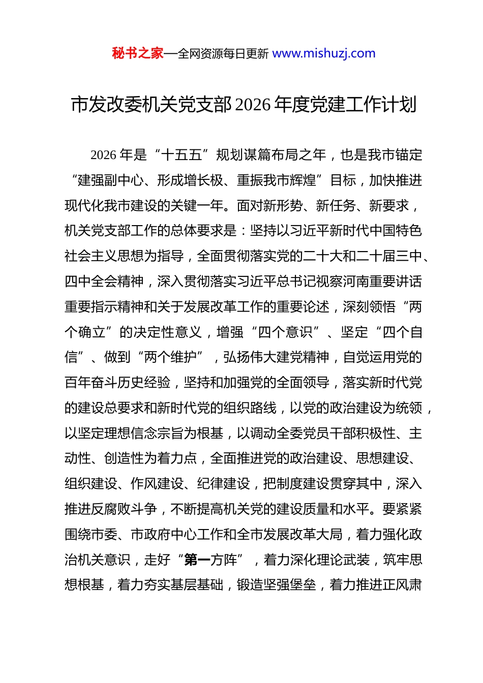 秘书之家—全网资源每日更新 www.mishuzj.com市发改委机关党支部 2026 年度党建工作计划 2026 年是“十五五”规划谋篇布局之年,也是我市锚定“建强副中心、形成增长极、重振我市辉煌”目标,加快推进现代化我市建设的关键一年。面对新形势、新任务、新要求,机关党支部工作的总体要求是:坚持以习近平新时代中国特色社会主义思想为指导,全面贯彻落实党的二十大和二十届三中、四中全会精神,深入贯彻落实习近平总书记视察河南重要讲话重要指示精神和关于发展改革工作的重要论述,深刻领悟“两个确立”的决定性意义,增强“四个意识”、坚定“四个自信”、做到“两个维护”,弘扬伟大建党精神,自觉运用党的百年奋斗历史经验,坚持和加强党的全面领导,落实新时代党的建设总要求和新时代党的组织路线,以党的政治建设为统领,以坚定理想信念宗旨为根基,以调动全委党员干部积极性、主动性、创造性为着力点,全面推进党的政治建设、思想建设、组织建设、作风建设、纪律建设,把制度建设贯穿其中,深入推进反腐败斗争,不断提高机关党的建设质量和水平。要紧紧围绕市委、市政府中心工作和全市发展改革大局,着力强化政治机关意识,走好“第一方阵”,着力深化理论武装,筑牢思想根基,着力夯实基层基础,锻造坚强堡垒,着力推进正风肃秘书之家—全网资源每日更新 www.mishuzj.com纪,涵养政治生态,着力推动党建与业务深度融合、相互促进,以高质量机关党建引领保障发展改革事业高质量发展,为奋力谱写新时代中原更加出彩的我市绚丽篇章提供坚强政治保证。一、突出政治引领,坚决做到“两个维护”,建设对党绝对忠诚的政治机关始终把党的政治建设摆在首位,教育引导全体党员干部深刻领悟“两个确立”的决定性意义,不断提高政治判断力、政治领悟力、政治执行力,确保在政治立场、政治方向、政治原则、政治道路上同以习近平同志为核心的党中央保持高度一致。1.严明政治纪律和政治规矩。把学习贯彻和维护党章作为基础性经常性工作来抓,引导党员干部自觉用党章规范言行。严格执行《关于新形势下党内政治生活的若干准则》,增强党内政治生活的政治性、时代性、原则性、战斗性。深入开展政治纪律和政治规矩教育,坚决反对“七个有之”,切实做到“五个必须”,引导党员干部做政治上的“明白人”“老实人”。严格执行重大事项请示报告制度,该请示的必须请示,该报告的必须报告,决不允许擅作主张、先斩后奏。2.强化政治机关意识教育。持续开展“让党中央放心、让人民群众满意的模范机关”创建工作,深化政治机关意识教育,引导党员干部深刻认识市发改委首先是政治机关,第一属性是秘书之家—全网资源每日更新 www.mishuzj.com政治属性,第一要求是旗帜鲜明讲政治。结合部门职责,开展“我是发改人,我为市发展作贡献”主题实践活动,把讲政治的要求内化于心、外化于行,落实到谋划重大战略、制定重大政策、推进重大项目的全过程各方面。3.抓好党中央决策部署和习近平总书记重要指示批示精神的贯彻落实。坚持“第一议题”制度,第一时间传达学习习近平总书记最新重要讲话、重要指示批示精神和党中央重要会议精神、重大决策部署。建立贯彻落实台账,实行清单化管理、项目化推进,明确责任分工、完成时限,定期对账销号,加强跟踪督办和“回头看”,确保习近平总书记重要指示批示精神和党中央的决策部署在市发改委条条落实、件件落地、事事见效。特别是要聚焦习近平总书记赋予河南“在中部地区崛起中奋勇争先,谱写新时代中原更加出彩的绚丽篇章”的使命任务和对我市工作的重要要求,结合发展改革职能,找准切入点、着力点,创造性地抓好落实。二、深化理论武装,持续筑牢思想根基,用党的创新理论凝心聚魂坚持把学习贯彻习近平新时代中国特色社会主义思想作为首要政治任务和长期战略任务,在学懂弄通做实上下功夫,推动理论学习往深里走、往实里走、往心里走,自觉做党的创新秘书之家—全网资源每日更新 www.mishuzj.com理论的坚定信仰者和忠实实践者。1.健全常态化长效化学习机制。巩固拓展主题教育成果,坚持集中教育和经常性教育相结合,完善以党组理论学习中心组学习为龙头、党...