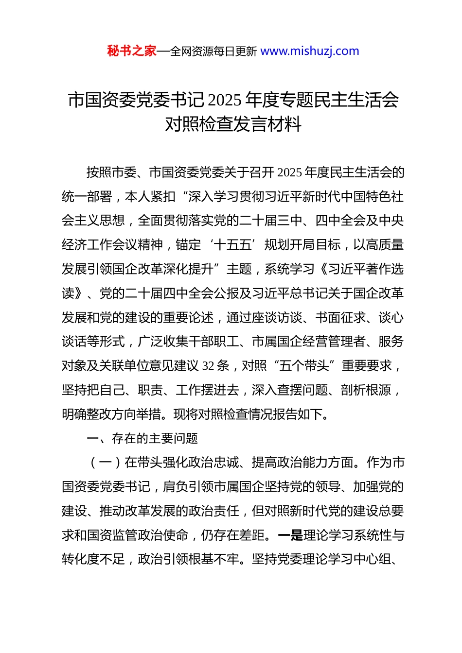 秘书之家—全网资源每日更新 www.mishuzj.com市国资委党委书记 2025 年度专题民主生活会对照检查发言材料 按照市委、市国资委党委关于召开 2025 年度民主生活会的统一部署,本人紧扣“深入学习贯彻习近平新时代中国特色社会主义思想,全面贯彻落实党的二十届三中、四中全会及中央经济工作会议精神,锚定‘十五五’规划开局目标,以高质量发展引领国企改革深化提升”主题,系统学习《习近平著作选读》、党的二十届四中全会公报及习近平总书记关于国企改革发展和党的建设的重要论述,通过座谈访谈、书面征求、谈心谈话等形式,广泛收集干部职工、市属国企经营管理者、服务对象及关联单位意见建议 32 条,对照“五个带头”重要要求,坚持把自己、职责、工作摆进去,深入查摆问题、剖析根源,明确整改方向举措。现将对照检查情况报告如下。一、存在的主要问题(一)在带头强化政治忠诚、提高政治能力方面。作为市国资委党委书记,肩负引领市属国企坚持党的领导、加强党的建设、推动改革发展的政治责任,但对照新时代党的建设总要求和国资监管政治使命,仍存在差距。一是理论学习系统性与转化度不足,政治引领根基不牢。坚持党委理论学习中心组、秘书之家—全网资源每日更新 www.mishuzj.com“第一议题”等学习制度,对党的二十届四中全会“深化国资国企改革”“发展新质生产力”等部署有初步理解,但存在“浅尝辄止”“学用脱节”问题。一方面,系统性把握不深,对习近平新时代中国特色社会主义思想的世界观、方法论及“两个结合”“六个必须坚持”实践要求缺乏体系化把握,满足于完成学习“硬指标”,对总书记关于国资国企改革发展重要论述的整体性、关联性研读不足,未完全把握核心要义与实践路径。另一方面,针对性转化不力,结合监管职责研究将“建设现代化产业体系”“推动制造业高端化智能化绿色化发展”等政策转化为市属国企高质量发展举措不够深入。如谋划2025 年市属国企技术改造和产业升级时,未充分用新发展理念统筹绿色低碳转型与产能提升,战略性新兴产业培育顶层设计不完善,导致部分企业新兴产业布局滞后;对“国企要筑牢产业链供应链安全屏障”要求仅停留在会议传达、文件转发层面,破解核心技术“卡脖子”、供应链协同效率低等问题缺乏理论指导实践的有效举措,政策红利未充分转化为发展实效。二是“政治三力”锤炼不扎实,驾驭复杂局面能力有待提升。日常工作中存在“业务思维重于政治思维”倾向,对国资监管政治内涵和影响把握不精准。政治判断力方面,面对 2025 年原材料价格波动、供应链中断及地方经济下行压力,更多关注企业成秘书之家—全网资源每日更新 www.mishuzj.com本控制、产能调整等业务应对,对背后可能引发的职工稳定、国有资产保值增值压力、地方产业安全等政治风险预判不足,缺乏前瞻思考和系统预案。政治领悟力方面,对“国企要服务国家战略、融入区域发展大局”理解不深,推进市属国企跨区域合作、重大项目投资时,过分强调企业经济效益,对项目的产业协同、就业带动、民生改善等政治社会效益统筹考量不够,未充分彰显国企战略使命。政治执行力方面,对上级“数字化转型三年行动计划”“安全生产专项整治提升行动”“国企改革深化提升行动”等重点任务,虽能分解落实,但遇部门协同不畅、企业推进困难、历史遗留问题制约时,缺乏“一抓到底”韧劲和攻坚魄力,部分任务滞后。如推动市属国企智能化监管平台建设,因调研不充分、协调不力、企业配合积极性不足,推迟 2 个月上线;推进“两非”“两资”处置时,因担心触及历史问题、引发矛盾,“求稳怕乱”导致部分低效无效资产处置缓慢,资源未及时向主责主业集中。三是重大决策部署落实存在“温差”“落差”,政策执行效能有待提高。对总书记关于国企改革发展重大方针政策和上级部署思想上高度认同,但执行中存在“打折扣、搞变通”“上热中温下冷”情况。推动混合所有制改革方面,面对市属子公司股权优化、引入战略投资者等攻坚任务,顾虑改革风险和信访问题,主动对接市场秘书之家—全网资源每日更新 www.mishuzj.com资源、洽谈合作积极性不足,缺乏市场化思维和创新举措,混改进...