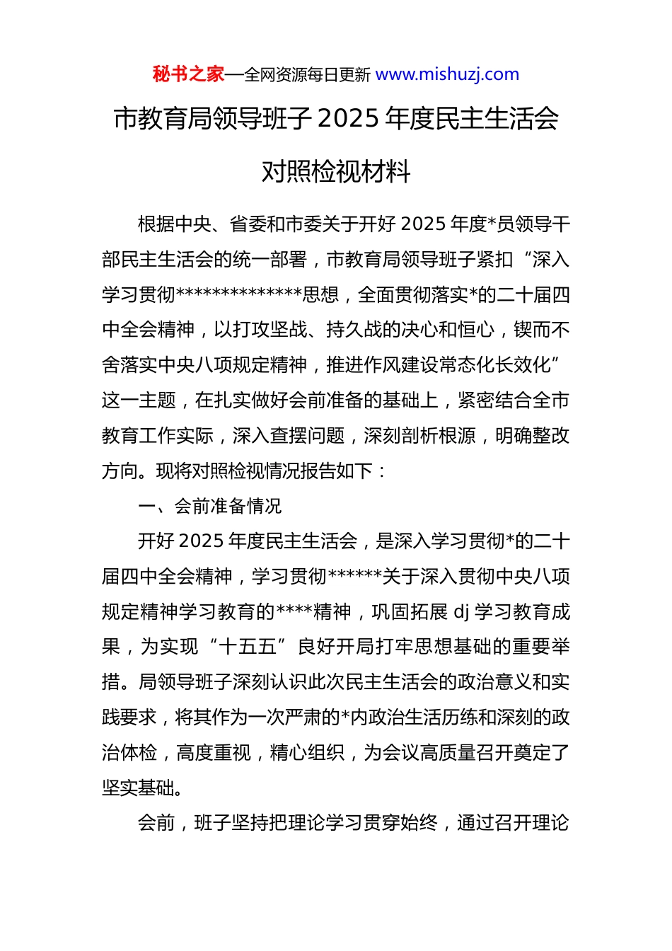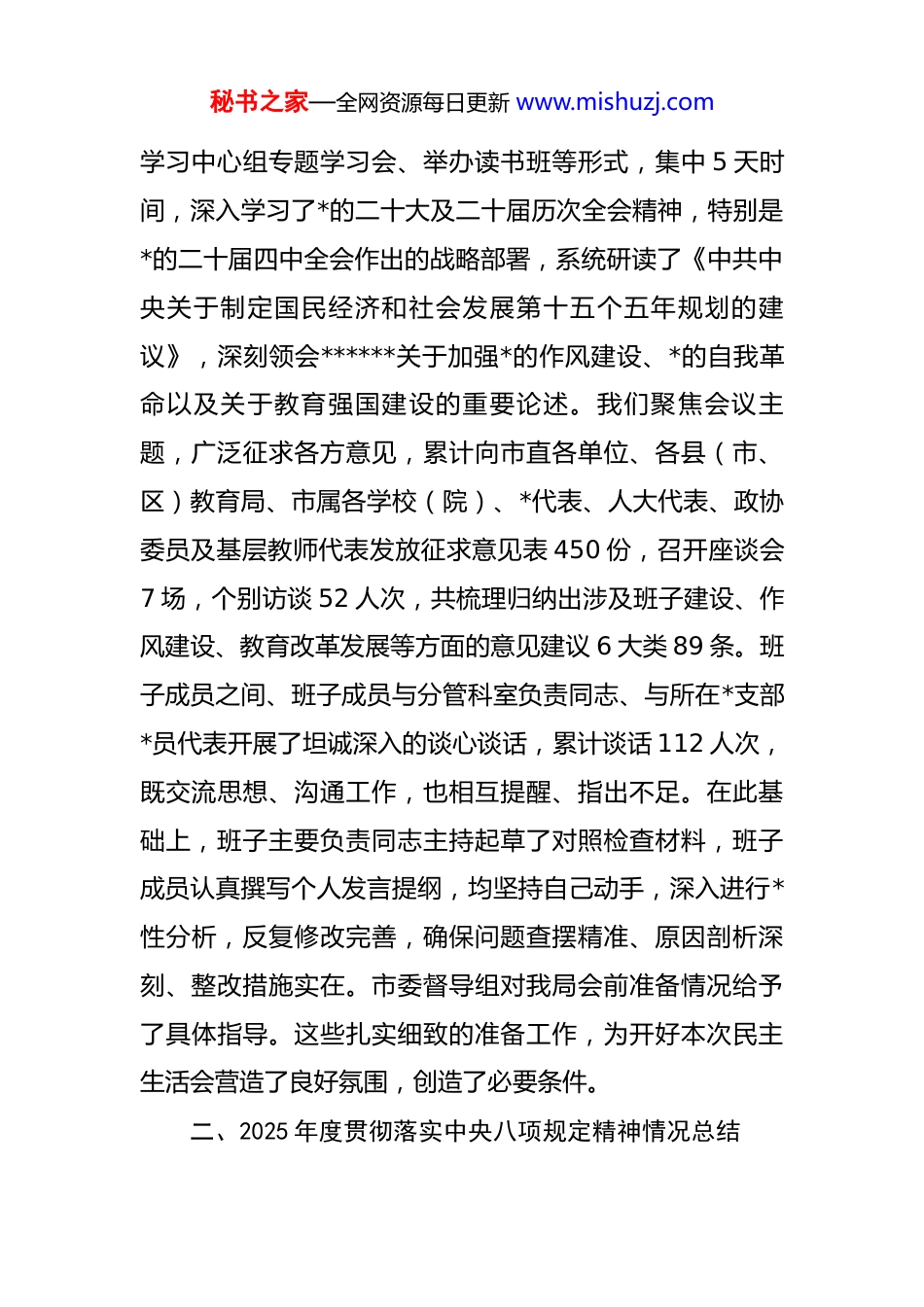 秘书之家—全网资源每日更新 www.mishuzj.com市教育局领导班子 2025 年度民主生活会对照检视材料根据中央、省委和市委关于开好 2025 年度*员领导干部民主生活会的统一部署,市教育局领导班子紧扣“深入学习贯彻**************思想,全面贯彻落实*的二十届四中全会精神,以打攻坚战、持久战的决心和恒心,锲而不舍落实中央八项规定精神,推进作风建设常态化长效化”这一主题,在扎实做好会前准备的基础上,紧密结合全市教育工作实际,深入查摆问题,深刻剖析根源,明确整改方向。现将对照检视情况报告如下:一、会前准备情况开好 2025 年度民主生活会,是深入学习贯彻*的二十届四中全会精神,学习贯彻******关于深入贯彻中央八项规定精神学习教育的****精神,巩固拓展 dj 学习教育成果,为实现“十五五”良好开局打牢思想基础的重要举措。局领导班子深刻认识此次民主生活会的政治意义和实践要求,将其作为一次严肃的*内政治生活历练和深刻的政治体检,高度重视,精心组织,为会议高质量召开奠定了坚实基础。会前,班子坚持把理论学习贯穿始终,通过召开理论秘书之家—全网资源每日更新 www.mishuzj.com学习中心组专题学习会、举办读书班等形式,集中 5 天时间,深入学习了*的二十大及二十届历次全会精神,特别是*的二十届四中全会作出的战略部署,系统研读了《中共中央关于制定国民经济和社会发展第十五个五年规划的建议》,深刻领会******关于加强*的作风建设、*的自我革命以及关于教育强国建设的重要论述。我们聚焦会议主题,广泛征求各方意见,累计向市直各单位、各县(市、区)教育局、市属各学校(院)、*代表、人大代表、政协委员及基层教师代表发放征求意见表 450 份,召开座谈会7 场,个别访谈 52 人次,共梳理归纳出涉及班子建设、作风建设、教育改革发展等方面的意见建议 6 大类 89 条。班子成员之间、班子成员与分管科室负责同志、与所在*支部*员代表开展了坦诚深入的谈心谈话,累计谈话 112 人次,既交流思想、沟通工作,也相互提醒、指出不足。在此基础上,班子主要负责同志主持起草了对照检查材料,班子成员认真撰写个人发言提纲,均坚持自己动手,深入进行*性分析,反复修改完善,确保问题查摆精准、原因剖析深刻、整改措施实在。市委督导组对我局会前准备情况给予了具体指导。这些扎实细致的准备工作,为开好本次民主生活会营造了良好氛围,创造了必要条件。二、2025 年度贯彻落实中央八项规定精神情况总结秘书之家—全网资源每日更新 www.mishuzj.com2025 年,市教育局领导班子坚决扛起作风建设政治责任,将贯彻落实中央八项规定及其实施细则精神作为重大政治任务常抓不懈,围绕“学、查、改、立”四个关键环节,扎实开展“深入贯彻中央八项规定精神学习教育”,推动作风建设向纵深发展、向基层延伸,为全市教育事业发展提供了坚强的作风保障。(一)深化理论武装,筑牢思想根基。我们坚持将学习贯彻中央八项规定精神作为政治理论学习的核心内容,严格落实“第一议题”制度,全年组织召开局*组理论学习中心组学习会 18 次,其中专题学习研讨中央八项规定精神及作风建设相关内容 6 次。通过“学”,我们深刻认识到中央八项规定是长期有效的铁规矩、硬杠杠,是新时代*的自我革命伟大实践的重要标志。班子成员带头深入学习******关于*的作风建设的重要论述,特别是关于深入贯彻中央八项规定精神学习教育的****精神,引导全市教育系统广大*员干部从思想上正本清源、固本培元。我们结合教育行业特点,将纪律教育与师德师风建设深度融合,组织全市 3.2 万名教职工开展专题学习和警示教育,编印《教育系统违纪违法典型案例警示录》,举办“廉洁从教”主题演讲比赛等活动,不断夯实廉洁从教、规范用权的思想基础。通过持续深入的学习教育,领导班子成员的政治判断秘书之家—全网资源每日更新 www.mishuzj.com力、政治领悟力、政治执行力得到有效提升,落实中央八项规定精神的政治自觉、思想自觉和行动自觉显著增强。(二)坚持问题导向, 从严自查自纠。我们聚焦“查”的环节,刀刃向内,全面检视。对照中央八项规定精神及省委、市委实...