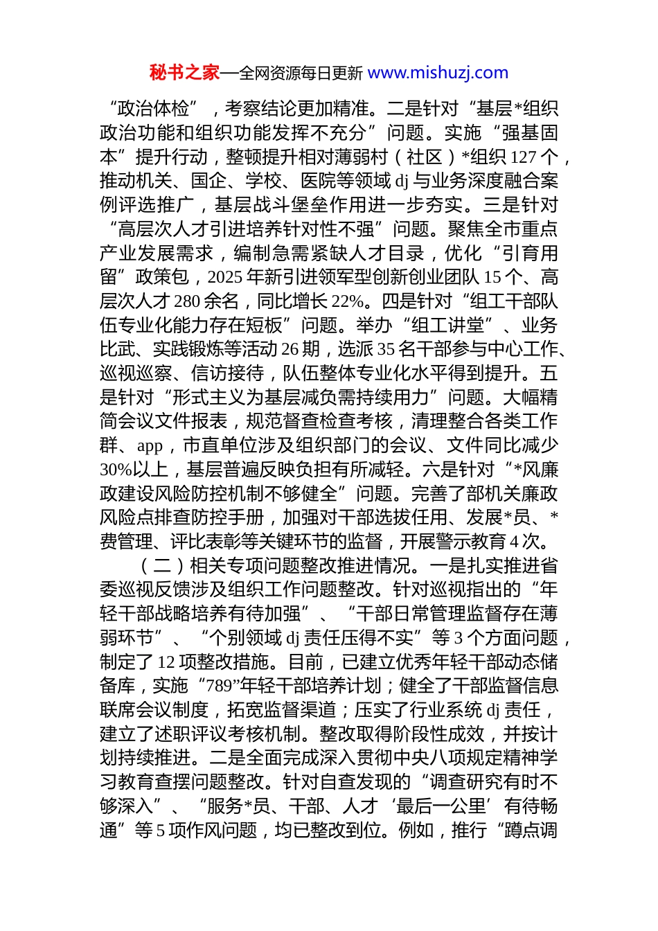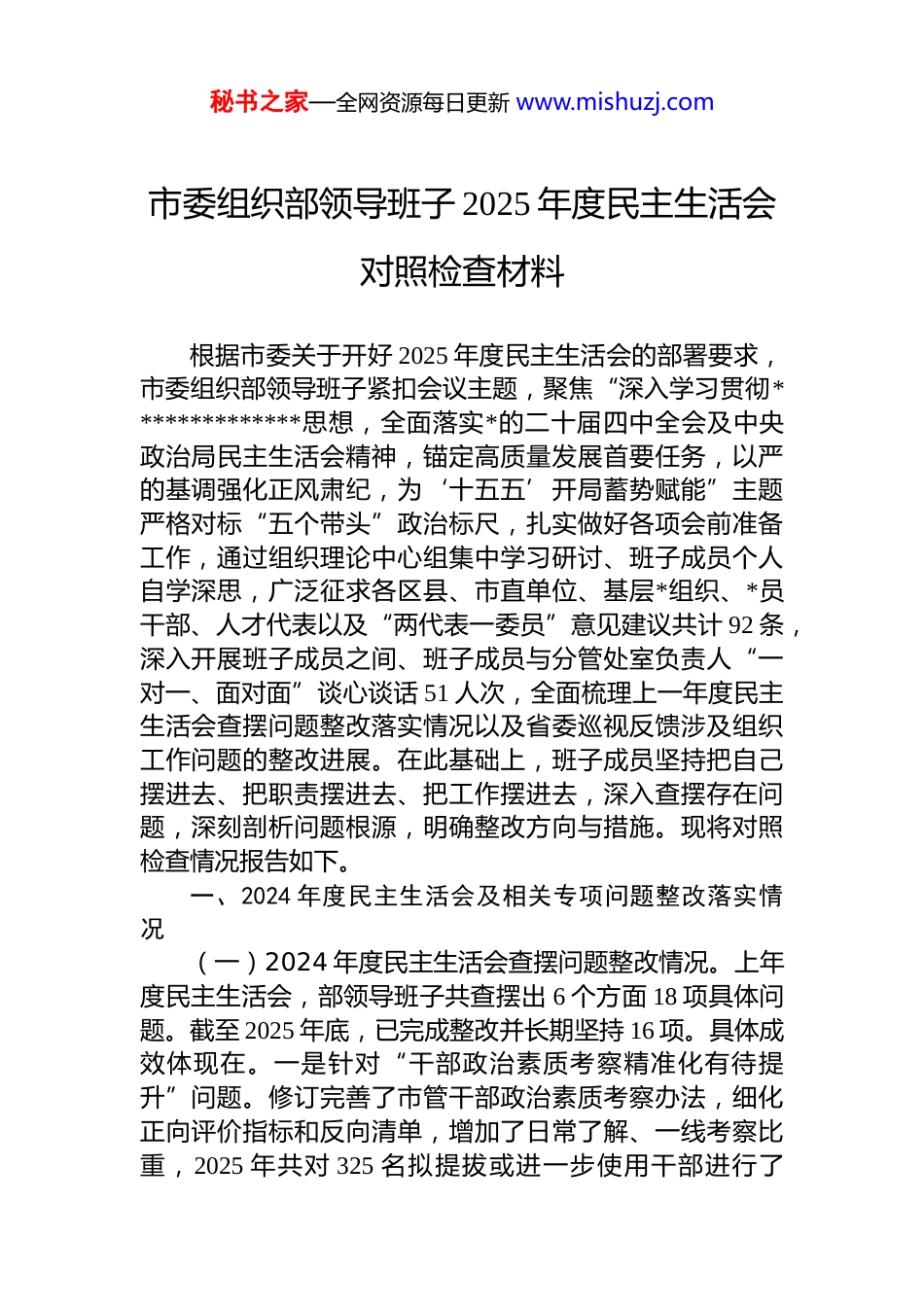 秘书之家—全网资源每日更新 www.mishuzj.com市委组织部领导班子 2025 年度民主生活会对照检查材料根据市委关于开好 2025 年度民主生活会的部署要求,市委组织部领导班子紧扣会议主题,聚焦“深入学习贯彻**************思想,全面落实*的二十届四中全会及中央政治局民主生活会精神,锚定高质量发展首要任务,以严的基调强化正风肃纪,为‘十五五’开局蓄势赋能”主题严格对标“五个带头”政治标尺,扎实做好各项会前准备工作,通过组织理论中心组集中学习研讨、班子成员个人自学深思,广泛征求各区县、市直单位、基层*组织、*员干部、人才代表以及“两代表一委员”意见建议共计 92 条,深入开展班子成员之间、班子成员与分管处室负责人“一对一、面对面”谈心谈话 51 人次,全面梳理上一年度民主生活会查摆问题整改落实情况以及省委巡视反馈涉及组织工作问题的整改进展。在此基础上,班子成员坚持把自己摆进去、把职责摆进去、把工作摆进去,深入查摆存在问题,深刻剖析问题根源,明确整改方向与措施。现将对照检查情况报告如下。一、2024 年度民主生活会及相关专项问题整改落实情况(一)2024 年度民主生活会查摆问题整改情况。上年度民主生活会,部领导班子共查摆出 6 个方面 18 项具体问题。截至 2025 年底,已完成整改并长期坚持 16 项。具体成效体现在。一是针对“干部政治素质考察精准化有待提升”问题。修订完善了市管干部政治素质考察办法,细化正向评价指标和反向清单,增加了日常了解、一线考察比重,2025 年共对 325 名拟提拔或进一步使用干部进行了秘书之家—全网资源每日更新 www.mishuzj.com“政治体检”,考察结论更加精准。二是针对“基层*组织政治功能和组织功能发挥不充分”问题。实施“强基固本”提升行动,整顿提升相对薄弱村(社区)*组织 127 个,推动机关、国企、学校、医院等领域 dj 与业务深度融合案例评选推广,基层战斗堡垒作用进一步夯实。三是针对“高层次人才引进培养针对性不强”问题。聚焦全市重点产业发展需求,编制急需紧缺人才目录,优化“引育用留”政策包,2025 年新引进领军型创新创业团队 15 个、高层次人才 280 余名,同比增长 22%。四是针对“组工干部队伍专业化能力存在短板”问题。举办“组工讲堂”、业务比武、实践锻炼等活动 26 期,选派 35 名干部参与中心工作、巡视巡察、信访接待,队伍整体专业化水平得到提升。五是针对“形式主义为基层减负需持续用力”问题。大幅精简会议文件报表,规范督查检查考核,清理整合各类工作群、app,市直单位涉及组织部门的会议、文件同比减少30%以上,基层普遍反映负担有所减轻。六是针对“*风廉政建设风险防控机制不够健全”问题。完善了部机关廉政风险点排查防控手册,加强对干部选拔任用、发展*员、*费管理、评比表彰等关键环节的监督,开展警示教育 4 次。(二)相关专项问题整改推进情况。一是扎实推进省委巡视反馈涉及组织工作问题整改。针对巡视指出的“年轻干部战略培养有待加强”、“干部日常管理监督存在薄弱环节”、“个别领域 dj 责任压得不实”等 3 个方面问题,制定了 12 项整改措施。目前,已建立优秀年轻干部动态储备库,实施“789”年轻干部培养计划;健全了干部监督信息联席会议制度,拓宽监督渠道;压实了行业系统 dj 责任,建立了述职评议考核机制。整改取得阶段性成效,并按计划持续推进。二是全面完成深入贯彻中央八项规定精神学习教育查摆问题整改。针对自查发现的“调查研究有时不够深入”、“服务*员、干部、人才‘最后一公里’有待畅通”等 5 项作风问题,均已整改到位。例如,推行“蹲点调秘书之家—全网资源每日更新 www.mishuzj.com研+解剖麻雀”模式,班子成员全年累计下基层调研超过120 天,形成高质量调研报告 15 篇;优化*员组织关系转接、人才政策申报等流程,线上办理比例提升至 90%。二、对照“五个带头”查摆的主要问题(一)在带头强化政治忠诚、提高政治能力方面,存在政治建设“穿透力”不足、组织路线服务政治路线“贴合度”不够的问题。一是理论武装“转化运用”的效能有待提升。对*的创新理论...