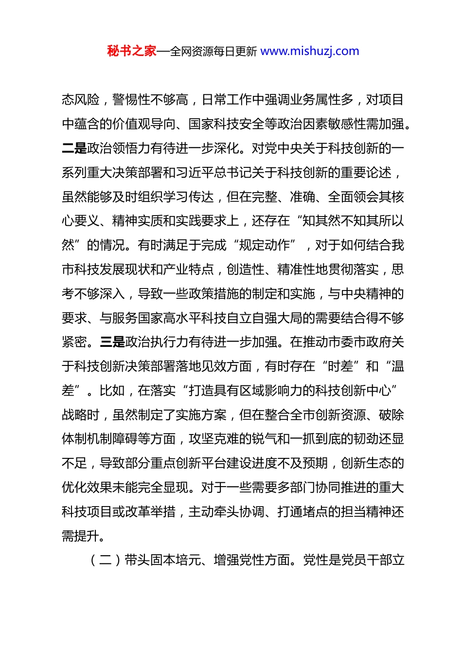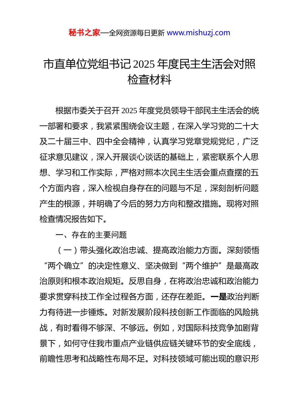 秘书之家—全网资源每日更新 www.mishuzj.com市直单位党组书记 2025 年度民主生活会对照检查材料 根据市委关于召开 2025 年度党员领导干部民主生活会的统一部署和要求,我紧紧围绕会议主题,在深入学习党的二十大及二十届三中、四中全会精神,认真学习党章党规党纪,广泛征求意见建议,深入开展谈心谈话的基础上,紧密联系个人思想、学习和工作实际,严格对照本次民主生活会重点查摆的五个方面内容,深入检视自身存在的问题与不足,深刻剖析问题产生的根源,并明确了今后的努力方向和整改措施。现将对照检查情况报告如下。一、存在的主要问题(一)带头强化政治忠诚、提高政治能力方面。深刻领悟“两个确立”的决定性意义、坚决做到“两个维护”是最高政治原则和根本政治规矩。反思自身,在将政治忠诚和政治能力要求贯穿科技工作全过程各方面,还存在差距。一是政治判断力有待进一步锤炼。对新发展阶段科技创新工作面临的风险挑战,有时看得不够深、不够远。例如,对国际科技竞争加剧背景下,如何守住我市重点产业链供应链关键环节的安全底线,前瞻性思考和战略性布局不足。对科技领域可能出现的意识形秘书之家—全网资源每日更新 www.mishuzj.com态风险,警惕性不够高,日常工作中强调业务属性多,对项目中蕴含的价值观导向、国家科技安全等政治因素敏感性需加强。二是政治领悟力有待进一步深化。对党中央关于科技创新的一系列重大决策部署和习近平总书记关于科技创新的重要论述,虽然能够及时组织学习传达,但在完整、准确、全面领会其核心要义、精神实质和实践要求上,还存在“知其然不知其所以然”的情况。有时满足于完成“规定动作”,对于如何结合我市科技发展现状和产业特点,创造性、精准性地贯彻落实,思考不够深入,导致一些政策措施的制定和实施,与中央精神的要求、与服务国家高水平科技自立自强大局的需要结合得不够紧密。三是政治执行力有待进一步加强。在推动市委市政府关于科技创新决策部署落地见效方面,有时存在“时差”和“温差”。比如,在落实“打造具有区域影响力的科技创新中心”战略时,虽然制定了实施方案,但在整合全市创新资源、破除体制机制障碍等方面,攻坚克难的锐气和一抓到底的韧劲还显不足,导致部分重点创新平台建设进度不及预期,创新生态的优化效果未能完全显现。对于一些需要多部门协同推进的重大科技项目或改革举措,主动牵头协调、打通堵点的担当精神还需提升。(二)带头固本培元、增强党性方面。党性是党员干部立秘书之家—全网资源每日更新 www.mishuzj.com身、立业、立言、立德的基石。反思自身,在持续加强党性修养、筑牢信仰之基方面,还存在薄弱环节。一是理论学习系统性、深入性不足。虽然坚持参加理论学习中心组学习和“第一议题”学习,但个人自学的主动性、系统性有待加强。对党的创新理论,特别是关于发展新质生产力、完善科技创新体系等最新重要论述,往往停留在通读层面,缺乏“钻进去”的韧劲和“跳出来”的思考,未能完全做到融会贯通。理论学习的成果向谋划科技工作思路、破解发展难题的实际能力转化不够顺畅,存在“学归学、用归用”的现象。例如,在运用新发展理念指导科技资源配置优化时,思路还不够开阔,办法还不够多。二是理想信念教育融入日常不够。作为党组书记,对班子成员和党员干部的理想信念教育,有时习惯于通过会议、文件进行部署,形式相对单一,触及灵魂、入脑入心的效果有待提升。结合科技领域特点和党员思想实际,开展有针对性的、形式鲜活的党性锻炼活动不多,未能充分利用我市红色科技资源开展现场教学、情景党课,教育活动的吸引力和感染力不足。三是党内政治生活“炉火”温度不够。虽然能按规定参加民主生活会、组织生活会,但有时存在“好人主义”思想,开展批评与自我批评不够直接、不够深入,特别是对班子成员的批评,多以工作建议代替思想交锋,“辣味”不足。在自我批评时,有秘书之家—全网资源每日更新 www.mishuzj.com时对深层次思想根源挖掘不够,满足于谈具体工作问题。对支部组织生活的指导不够具体,对“三会一课”、主题党日等活动的政治性和庄重性感召力强调不够,存在一定...