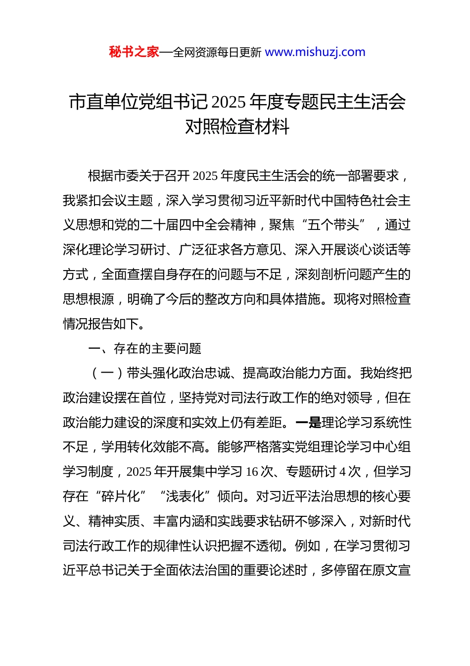 秘书之家—全网资源每日更新 www.mishuzj.com市直单位党组书记 2025 年度专题民主生活会对照检查材料 根据市委关于召开 2025 年度民主生活会的统一部署要求,我紧扣会议主题,深入学习贯彻习近平新时代中国特色社会主义思想和党的二十届四中全会精神,聚焦“五个带头”,通过深化理论学习研讨、广泛征求各方意见、深入开展谈心谈话等方式,全面查摆自身存在的问题与不足,深刻剖析问题产生的思想根源,明确了今后的整改方向和具体措施。现将对照检查情况报告如下。一、存在的主要问题(一)带头强化政治忠诚、提高政治能力方面。我始终把政治建设摆在首位,坚持党对司法行政工作的绝对领导,但在政治能力建设的深度和实效上仍有差距。一是理论学习系统性不足,学用转化效能不高。能够严格落实党组理论学习中心组学习制度,2025 年开展集中学习 16 次、专题研讨 4 次,但学习存在“碎片化”“浅表化”倾向。对习近平法治思想的核心要义、精神实质、丰富内涵和实践要求钻研不够深入,对新时代司法行政工作的规律性认识把握不透彻。例如,在学习贯彻习近平总书记关于全面依法治国的重要论述时,多停留在原文宣秘书之家—全网资源每日更新 www.mishuzj.com读、要点梳理层面,未能结合我市法治建设实际深入研讨贯彻落实路径,导致在推进法治政府示范创建、基层依法治理等重点工作中,理论指导实践的作用发挥不充分,部分工作举措针对性不强,2025 年我市法治建设考核排名较上年提升不明显,仅前进 2 个位次。二是政治敏锐性不强,风险防范化解能力薄弱。在大是大非问题上能够保持清醒头脑,但面对司法行政领域潜在的政治风险和意识形态挑战,敏锐性和预见性不足。例如,在社区矫正对象教育管理工作中,更多关注监管安全等显性风险,对部分矫正对象的思想动态掌握不及时、不全面,未能有效联动相关部门开展思想引导和风险排查,2025 年发生 1起社区矫正对象因思想波动引发的轻微违规事件;在法治宣传舆论引导中,对网络上涉及司法行政工作的不实信息回应不够迅速,主动发声、正向引导的意识和能力有待提升。三是政治引领力度不足,队伍思想建设成效不佳。工作中存在“重业务、轻思想”的倾向,对干部职工的思想政治教育投入精力不足。教育方式方法较为单一,多以集中授课、传达文件为主,缺乏互动式、体验式教育载体,导致教育内容吸引力不强。例如,2025 年开展的政治理论教育培训中,有 35%的干部反映课程内容枯燥、与实际工作结合不紧密;对年轻干部的政治历练不够系统,部分年轻干部政治判断力、政治领悟力有待提升,在应秘书之家—全网资源每日更新 www.mishuzj.com对复杂矛盾纠纷调解时,未能始终从政治高度把握工作方向。(二)带头固本培元、增强党性方面。我始终坚持以党性立身、以党性履职,但在党性修养锤炼的常态化、制度化上仍存在短板。一是党性锻炼不够经常,党内政治生活质量不高。能够按要求召开“三会一课”、组织生活会等,但部分党内政治生活存在“走过场”现象。例如,在专题组织生活会上,自我批评多以工作问题代替思想问题,批评他人多以委婉提醒代替直戳要害,“辣味”不足;民主评议党员工作中,存在重形式、轻实效的情况,对评议出的问题整改跟踪问效不够到位,未能充分发挥党内政治生活锤炼党性的作用。二是宗旨意识树得不牢,服务群众主动性不足。践行“以人民为中心”的发展思想不够彻底,在司法行政服务群众工作中,存在“坐等服务”“被动响应”的情况。例如,在公共法律服务体系建设中,对偏远乡镇群众的法律服务需求调研不够深入,导致部分乡镇公共法律服务工作站服务项目与群众需求匹配度不高,2025 年偏远乡镇群众法律服务满意度较城区低 8 个百分点;在法律援助工作中,对老年人、残疾人等特殊群体的上门服务覆盖面不足,全年上门服务仅 52 次,未能完全满足特殊群体的法律服务需求。三是作风建设不够扎实,实干担当精神有待强化。在工作推进中,存在重部署、轻落实的问题。例如,在推进基层司秘书之家—全网资源每日更新 www.mishuzj.com法所规范化建设工作中,虽然制定了详细的实施方案和标准,但在后续督导检查中,存...