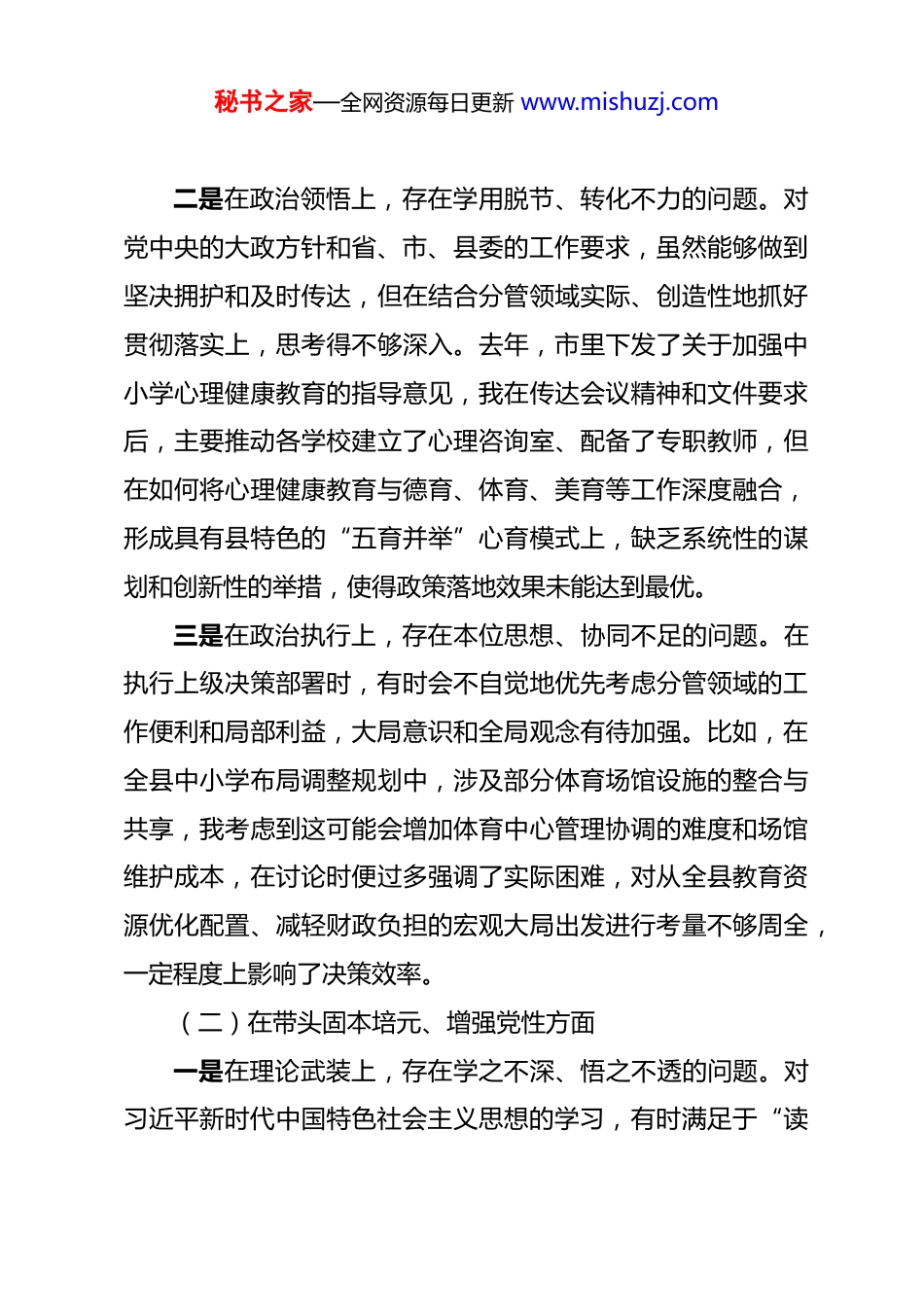 秘书之家—全网资源每日更新 www.mishuzj.com县局副局长 2025 年度民主生活会个人对照检查材料 根据县委关于召开 2025 年度民主生活会的统一部署,本人紧扣会议主题,深入学习了习近平新时代中国特色社会主义思想、党的二十届三中、四中全会精神以及习近平总书记系列重要讲话和指示批示精神。通过深入开展中央八项规定精神学习教育,并结合谈心谈话、征求意见等多种形式,我进行了深刻的党性分析和自我剖析,现将个人对照检查情况报告如下。一、存在的主要问题(一)在带头强化政治忠诚、提高政治能力方面一是在政治判断上,存在站位不高、看齐不快的问题。对“两个确立”决定性意义的领悟,有时还停留在理论认同层面,转化为政治行动的敏锐性和果决性尚有欠缺。例如,在推进我县创建“全国体教融合示范县”工作中,初期我更多地从提升本地体育竞技水平和学生身体素质的业务角度去思考和部署,对这一举措在服务国家人才强国战略、筑牢青少年理想信念根基方面的深远政治意涵,领会不够及时和深刻,导致在向上级部门汇报工作进展时,未能充分展现出我县教育体育工作服务国家大局的政治站位。秘书之家—全网资源每日更新 www.mishuzj.com二是在政治领悟上,存在学用脱节、转化不力的问题。对党中央的大政方针和省、市、县委的工作要求,虽然能够做到坚决拥护和及时传达,但在结合分管领域实际、创造性地抓好贯彻落实上,思考得不够深入。去年,市里下发了关于加强中小学心理健康教育的指导意见,我在传达会议精神和文件要求后,主要推动各学校建立了心理咨询室、配备了专职教师,但在如何将心理健康教育与德育、体育、美育等工作深度融合,形成具有县特色的“五育并举”心育模式上,缺乏系统性的谋划和创新性的举措,使得政策落地效果未能达到最优。三是在政治执行上,存在本位思想、协同不足的问题。在执行上级决策部署时,有时会不自觉地优先考虑分管领域的工作便利和局部利益,大局意识和全局观念有待加强。比如,在全县中小学布局调整规划中,涉及部分体育场馆设施的整合与共享,我考虑到这可能会增加体育中心管理协调的难度和场馆维护成本,在讨论时便过多强调了实际困难,对从全县教育资源优化配置、减轻财政负担的宏观大局出发进行考量不够周全,一定程度上影响了决策效率。(二)在带头固本培元、增强党性方面一是在理论武装上,存在学之不深、悟之不透的问题。对习近平新时代中国特色社会主义思想的学习,有时满足于“读秘书之家—全网资源每日更新 www.mishuzj.com过了”“学过了”,但距离“学懂”“弄通”“做实”还有差距,特别是运用其世界观和方法论解决实际问题的能力不足。在参加理论学习中心组学习时,我有时把重点放在了完成学习笔记和撰写心得体会等“规定动作”上,对一些重大理论问题的钻研不够刻苦,习惯于接受现成的解读和辅导材料,缺乏“挤”和“钻”的精神,导致对理论的理解和把握未能达到应有的高度和深度。二是在党性锤炼上,存在标准不高、自我要求不严的问题。随着工作年限的增长,有时产生了“歇歇脚”的念头,艰苦奋斗、攻坚克难的锐气有所消减。在开展批评和自我批评时,有时存在“老好人”思想,对于同事的一些非原则性问题,倾向于点到为止,不愿意“红脸出汗”,担心影响班子团结与和谐氛围;对于自身存在的问题,有时也缺乏“向我开炮”的勇气和“刮骨疗毒”的决心,剖析问题不够深入,触及灵魂不够深刻。三是在精神追求上,存在政绩观偏差、价值坐标偏移的问题。虽然能够坚守共产党人的精神家园,但在具体的政绩观上,有时还存在重显绩、轻潜绩的倾向。例如,在分管的学校基础设施建设项目中,我对能够迅速改善办学条件、产生直观效果的教学楼、运动场等“硬件”建设投入了大量精力,而对于需秘书之家—全网资源每日更新 www.mishuzj.com要长期投入、不易显现成效的校园文化建设、教师精神风貌提升等“软件”工程,则关注和投入相对不足,这反映出我的政绩观还不够全面和科学。(三)在带头敬畏人民、敬畏组织、敬畏法纪方面一是在践行群众路线上,存在深入基层不够、服务师生不实的问题。落实“四下基层”制度有时还不够扎实,下基...