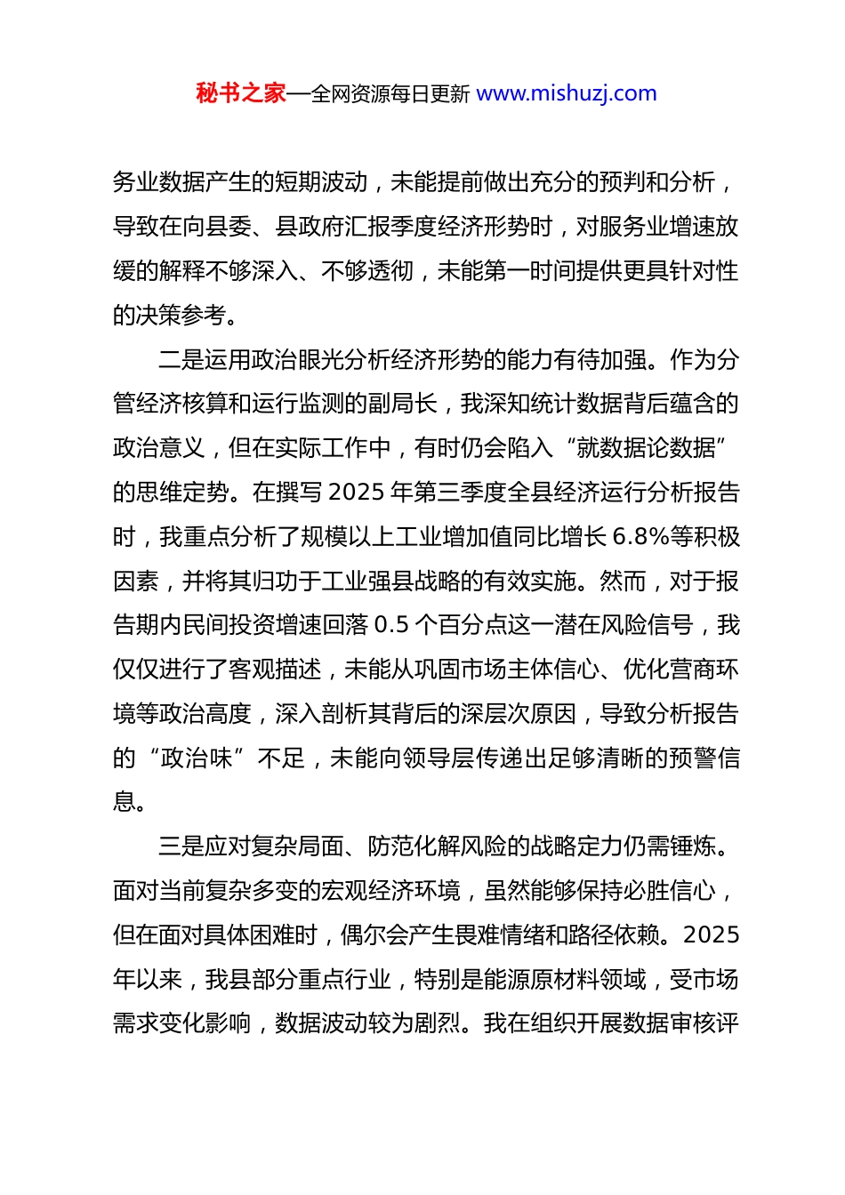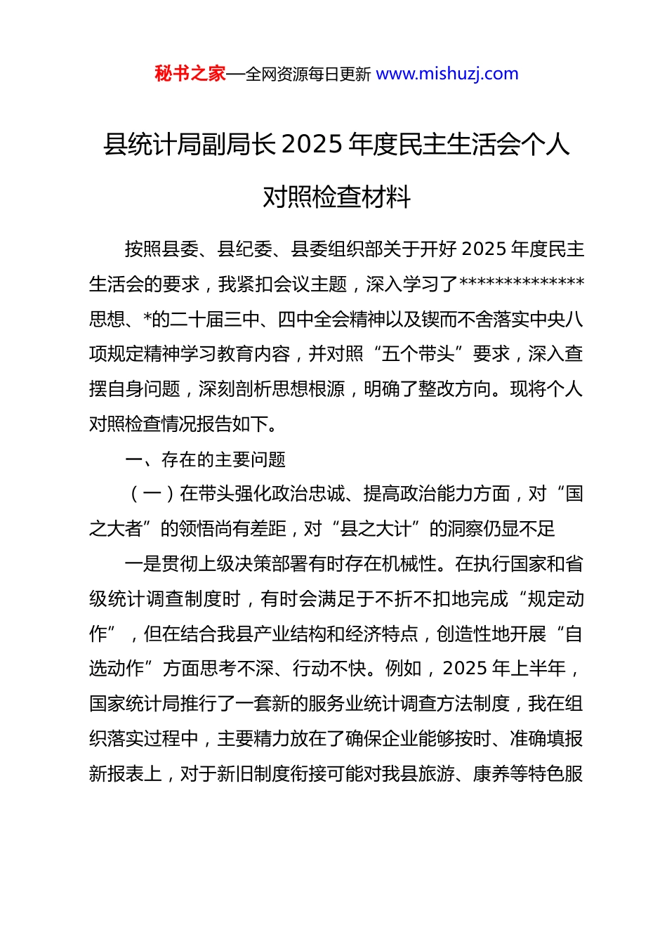 秘书之家—全网资源每日更新 www.mishuzj.com县统计局副局长 2025 年度民主生活会个人对照检查材料按照县委、县纪委、县委组织部关于开好 2025 年度民主生活会的要求,我紧扣会议主题,深入学习了**************思想、*的二十届三中、四中全会精神以及锲而不舍落实中央八项规定精神学习教育内容,并对照“五个带头”要求,深入查摆自身问题,深刻剖析思想根源,明确了整改方向。现将个人对照检查情况报告如下。一、存在的主要问题(一)在带头强化政治忠诚、提高政治能力方面,对“国之大者”的领悟尚有差距,对“县之大计”的洞察仍显不足一是贯彻上级决策部署有时存在机械性。在执行国家和省级统计调查制度时,有时会满足于不折不扣地完成“规定动作”,但在结合我县产业结构和经济特点,创造性地开展“自选动作”方面思考不深、行动不快。例如,2025 年上半年,国家统计局推行了一套新的服务业统计调查方法制度,我在组织落实过程中,主要精力放在了确保企业能够按时、准确填报新报表上,对于新旧制度衔接可能对我县旅游、康养等特色服秘书之家—全网资源每日更新 www.mishuzj.com务业数据产生的短期波动,未能提前做出充分的预判和分析,导致在向县委、县政府汇报季度经济形势时,对服务业增速放缓的解释不够深入、不够透彻,未能第一时间提供更具针对性的决策参考。二是运用政治眼光分析经济形势的能力有待加强。作为分管经济核算和运行监测的副局长,我深知统计数据背后蕴含的政治意义,但在实际工作中,有时仍会陷入“就数据论数据”的思维定势。在撰写 2025 年第三季度全县经济运行分析报告时,我重点分析了规模以上工业增加值同比增长 6.8%等积极因素,并将其归功于工业强县战略的有效实施。然而,对于报告期内民间投资增速回落 0.5 个百分点这一潜在风险信号,我仅仅进行了客观描述,未能从巩固市场主体信心、优化营商环境等政治高度,深入剖析其背后的深层次原因,导致分析报告的“政治味”不足,未能向领导层传递出足够清晰的预警信息。三是应对复杂局面、防范化解风险的战略定力仍需锤炼。面对当前复杂多变的宏观经济环境,虽然能够保持必胜信心,但在面对具体困难时,偶尔会产生畏难情绪和路径依赖。2025年以来,我县部分重点行业,特别是能源原材料领域,受市场需求变化影响,数据波动较为剧烈。我在组织开展数据审核评秘书之家—全网资源每日更新 www.mishuzj.com估时,更多地依赖历史数据和常规模型进行推算,对于组织力量深入企业一线,与企业家面对面交流,精准掌握企业真实生产经营状况和未来预期的主动性不强,一定程度上影响了统计监测的敏锐性和前瞻性,未能完全做到“透过现象看本质”,以历史主动精神有效应对风险挑战。(二)在带头固本培元、增强*性方面,理论武装的“转化率”有待提升,*性锤炼的“自觉性”仍需加强一是理论学习与统计实践结合不够紧密。对于**************思想和*的二十届三中、四中全会精神的学习,多数时候能够通过*组中心组学习、个人自学等方式完成,但学思用贯通、知信行统一上还存在差距。特别是在学习*的二十届四中全会关于“完善中国特色社会主义制度、推进国家治理体系和治理能力现代化”的论述时,我能认识到统计工作在其中的重要基础性作用,但在如何将这些宏大理论转化为具体可操作的统计改革举措上,思考得还不够系统。比如,在谋划我县“十五五”统计事业发展规划时,对于如何构建更加适应基层治理现代化需求的统计指标体系,我提出的初步想法还比较宏观,缺乏足够具体、可落地的创新性设计。二是*性分析和自我革命的深度有所欠缺。在参加组织生活会或日常谈心谈话时,虽然也能进行批评和自我批评,但有时秘书之家—全网资源每日更新 www.mishuzj.com存在“怕出丑、爱面子”的思想,对自己的缺点和错误,往往是点到为止,未能真正做到“红脸出汗、排毒治病”。在一次*小组会上,我谈到自己存在深入基层不够的问题,但只是笼统地表示要加强调研,没有具体剖析是因为日常事务性工作牵扯精力,还是主观上存在怕麻烦、图省事的思想,未能从世界观、人生观、价值观这个“总开关”上深挖根源,导致自我批评的...