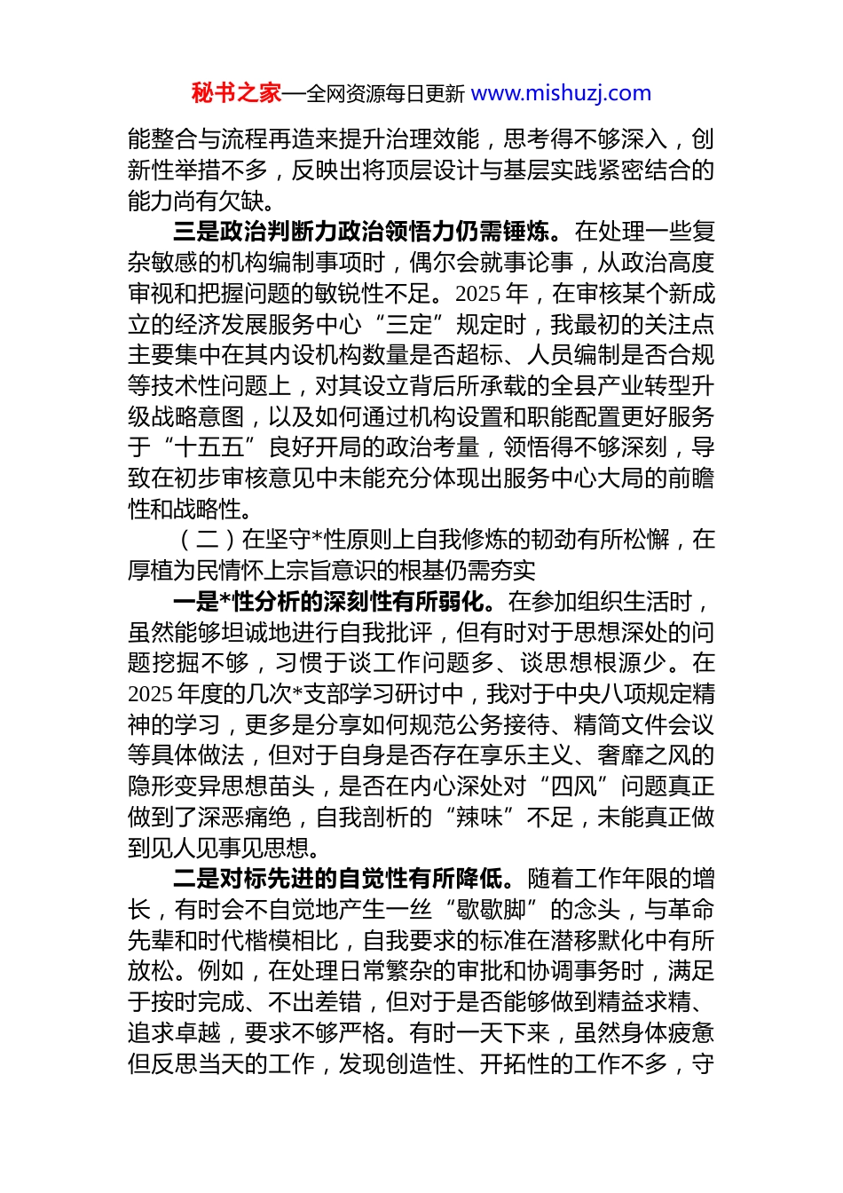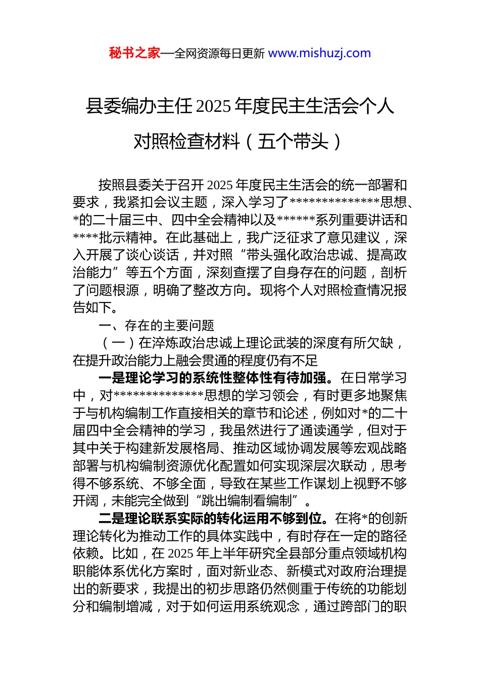 秘书之家—全网资源每日更新 www.mishuzj.com县委编办主任 2025 年度民主生活会个人对照检查材料(五个带头)按照县委关于召开 2025 年度民主生活会的统一部署和要求,我紧扣会议主题,深入学习了**************思想、*的二十届三中、四中全会精神以及******系列重要讲话和****批示精神。在此基础上,我广泛征求了意见建议,深入开展了谈心谈话,并对照“带头强化政治忠诚、提高政治能力”等五个方面,深刻查摆了自身存在的问题,剖析了问题根源,明确了整改方向。现将个人对照检查情况报告如下。一、存在的主要问题(一)在淬炼政治忠诚上理论武装的深度有所欠缺,在提升政治能力上融会贯通的程度仍有不足一是理论学习的系统性整体性有待加强。在日常学习中,对**************思想的学习领会,有时更多地聚焦于与机构编制工作直接相关的章节和论述,例如对*的二十届四中全会精神的学习,我虽然进行了通读通学,但对于其中关于构建新发展格局、推动区域协调发展等宏观战略部署与机构编制资源优化配置如何实现深层次联动,思考得不够系统、不够全面,导致在某些工作谋划上视野不够开阔,未能完全做到“跳出编制看编制”。二是理论联系实际的转化运用不够到位。在将*的创新理论转化为推动工作的具体实践中,有时存在一定的路径依赖。比如,在 2025 年上半年研究全县部分重点领域机构职能体系优化方案时,面对新业态、新模式对政府治理提出的新要求,我提出的初步思路仍然侧重于传统的功能划分和编制增减,对于如何运用系统观念,通过跨部门的职秘书之家—全网资源每日更新 www.mishuzj.com能整合与流程再造来提升治理效能,思考得不够深入,创新性举措不多,反映出将顶层设计与基层实践紧密结合的能力尚有欠缺。三是政治判断力政治领悟力仍需锤炼。在处理一些复杂敏感的机构编制事项时,偶尔会就事论事,从政治高度审视和把握问题的敏锐性不足。2025 年,在审核某个新成立的经济发展服务中心“三定”规定时,我最初的关注点主要集中在其内设机构数量是否超标、人员编制是否合规等技术性问题上,对其设立背后所承载的全县产业转型升级战略意图,以及如何通过机构设置和职能配置更好服务于“十五五”良好开局的政治考量,领悟得不够深刻,导致在初步审核意见中未能充分体现出服务中心大局的前瞻性和战略性。(二)在坚守*性原则上自我修炼的韧劲有所松懈,在厚植为民情怀上宗旨意识的根基仍需夯实一是*性分析的深刻性有所弱化。在参加组织生活时,虽然能够坦诚地进行自我批评,但有时对于思想深处的问题挖掘不够,习惯于谈工作问题多、谈思想根源少。在2025 年度的几次*支部学习研讨中,我对于中央八项规定精神的学习,更多是分享如何规范公务接待、精简文件会议等具体做法,但对于自身是否存在享乐主义、奢靡之风的隐形变异思想苗头,是否在内心深处对“四风”问题真正做到了深恶痛绝,自我剖析的“辣味”不足,未能真正做到见人见事见思想。二是对标先进的自觉性有所降低。随着工作年限的增长,有时会不自觉地产生一丝“歇歇脚”的念头,与革命先辈和时代楷模相比,自我要求的标准在潜移默化中有所放松。例如,在处理日常繁杂的审批和协调事务时,满足于按时完成、不出差错,但对于是否能够做到精益求精、追求卓越,要求不够严格。有时一天下来,虽然身体疲惫但反思当天的工作,发现创造性、开拓性的工作不多,守秘书之家—全网资源每日更新 www.mishuzj.com成思想有所抬头,缺乏了“时时放心不下”的责任感和“事事落实到位”的执行力。三是深入基层服务群众的实效性有待提升。虽然能够坚持落实“四下基层”制度,但调研的深度和广度仍有不足。2025 年下半年,为推进乡镇综合行政执法改革“后半篇文章”,我带队到几个乡镇进行了调研。现在反思,调研过程中听取乡镇领导班子汇报、召开座谈会的时间较多但随机走访一线执法人员、与办事群众面对面交流的时间较少,导致收集到的问题和建议更多集中在编制划转、人员配备等宏观层面,对于改革后基层执法实践中遇到的具体困难、群众对执法效能的真实感受,掌握得不够鲜活、不够精准,使得后续出台的配套措施针对性不够强。(...