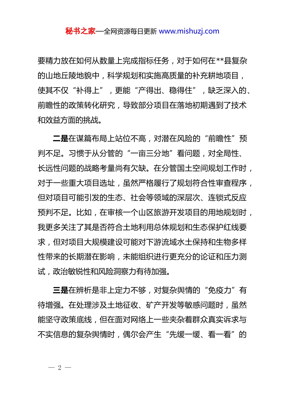 秘书之家—全网资源每日更新 www.mishuzj.com县自然资源局副局长 2025 年度民主生活会个人对照检查材料(五个带头)根据县委关于召开 2025 年度民主生活会的统一部署和要求,本人在深入学习领会*的二十届三中、四中全会精神,特别是近期关于深入贯彻中央八项规定精神学习教育的基础上,紧扣会议主题,通过群众提、自己找、上级点、互相帮等多种方式,广泛征求意见建议,并与班子成员深入开展谈心谈话。在此基础上,我围绕“五个带头”要求,深入查摆自身存在的差距和不足,深刻剖析问题根源,明确了今后的努力方向和整改措施。现将个人对照检查情况报告如下。一、存在的主要问题(一)在带头强化政治忠诚、提高政治能力方面一是在融会贯通上存在差距,对上级精神的“本土化”研究不深。面对中央关于自然资源管理的新理念、新战略,有时满足于学习原文、领会要义,但在如何将其与**县山地多、平地少、生态脆弱的县情相结合方面,思考得不够系统、研究得不够透彻。例如,在推进耕地“进出平衡”工作中,初期我主— 1 —秘书之家—全网资源每日更新 www.mishuzj.com要精力放在如何从数量上完成指标任务,对于如何在**县复杂的山地丘陵地貌中,科学规划和实施高质量的补充耕地项目,使其不仅“补得上”,更能“产得出、稳得住”,缺乏深入的、前瞻性的政策转化研究,导致部分项目在落地初期遇到了技术和效益方面的挑战。二是在谋篇布局上站位不高,对潜在风险的“前瞻性”预判不足。习惯于从分管的“一亩三分地”看问题,对全局性、长远性问题的战略考量尚有欠缺。在分管国土空间规划工作时,对于一些重大项目选址,虽然严格履行了规划符合性审查程序,但对项目可能引发的生态、社会等领域的深层次、连锁式反应预判不足。比如,在审核一个山区旅游开发项目的用地规划时,我更多关注了其是否符合土地利用总体规划和生态保护红线要求,但对项目大规模建设可能对下游流域水土保持和生物多样性带来的长期潜在影响,未能组织进行更充分的论证和压力测试,政治敏锐性和风险洞察力有待加强。三是在辨析是非上定力不够,对复杂舆情的“免疫力”有待增强。在处理涉及土地征收、矿产开发等敏感问题时,虽然能坚守政策底线,但在面对网络上一些夹杂着群众真实诉求与不实信息的复杂舆情时,偶尔会产生“先缓一缓、看一看”的— 2 —秘书之家—全网资源每日更新 www.mishuzj.com迟疑心态。去年在处理一起关于某历史遗留矿区环境修复的群众网络反映时,面对部分网民的过激言论和片面解读,我第一时间想的是如何尽快平息事态,而不是立即组织力量,以最清晰的事实、最权威的数据、最诚恳的态度进行正面回应和引导,反映出在复杂斗争面前,政治定力仍需锤炼。(二)在带头固本培元、增强*性方面一是理论学习“深”度不足,存在以干代学的现象。作为业务分管领导,日常工作中事务性会议多、文件审批多、现场检查多,个人学习时间被严重挤压。对于**************思想,特别是其中关于生态文明建设和自然资源管理的重要论述,虽然能够通过*组中心组学习等方式进行跟进,但静下心来读原著、学原文、悟原理的时间偏少。学习笔记往往变成了工作要点的记录,未能真正做到入脑入心、学思践悟,有时不自觉地把抓好具体工作等同于加强理论修养,存在“重干轻学”的倾向。二是知行合一“转”化不畅,存在学用脱节的现象。虽然在理论学习中深刻认识到“绿水青山就是金山银山”的辩证关系,但在实际工作中,偶尔还存在“重发展、轻保护”的惯性思维。例如,在面对一些能够带来显著短期经济效益但对生态环境有一定影响的产业项目时,内心深处有时会不自觉地在环— 3 —秘书之家—全网资源每日更新 www.mishuzj.com保标准上寻求“变通”的可能性,而不是坚决地用生态优先、绿色发展的理念去审视和引导项目。这说明理论认知和实践行为之间还存在一道“隔膜”,未能将*的创新理论完全转化为指导实践、推动工作的强大思想武器。三是*性锤炼“严”格不够,存在自我要求的松懈。随着工作年限和职务的提升,艰苦奋斗、严格自律的意识偶有淡化。虽然能够严格遵守 dj 国法,但在一些“小节”上对自己的要求有所...