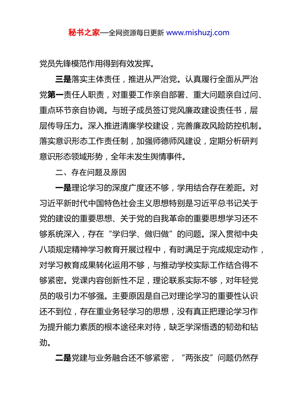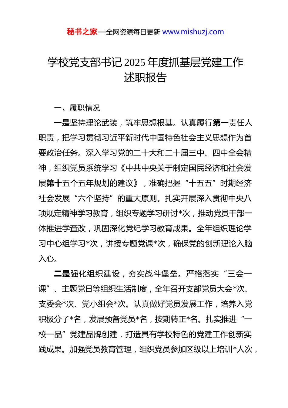秘书之家—全网资源每日更新 www.mishuzj.com学校党支部书记 2025 年度抓基层党建工作述职报告 一、履职情况一是坚持理论武装,筑牢思想根基。认真履行第一责任人职责,把学习贯彻习近平新时代中国特色社会主义思想作为首要政治任务。深入学习党的二十大和二十届三中、四中全会精神,组织党员系统学习《中共中央关于制定国民经济和社会发展第十五个五年规划的建议》,准确把握“十五五”时期经济社会发展“六个坚持”的重大原则。扎实开展深入贯彻中央八项规定精神学习教育,组织专题学习研讨*次,推动党员干部一体推进学查改,巩固深化党纪学习教育成果。全年组织理论学习中心组学习*次,讲授专题党课*次,确保党的创新理论入脑入心。二是强化组织建设,夯实战斗堡垒。严格落实“三会一课”、主题党日等组织生活制度,全年召开支部党员大会*次、支委会*次、党小组会*次。认真做好党员发展工作,培养入党积极分子*名,发展预备党员*名,按期转正*名。扎实推进“一校一品”党建品牌创建,打造具有学校特色的党建工作创新实践成果。加强党员教育管理,组织党员参加区级以上培训*人次,秘书之家—全网资源每日更新 www.mishuzj.com党员先锋模范作用得到有效发挥。三是落实主体责任,推进从严治党。认真履行全面从严治党第一责任人职责,对重要工作亲自部署、重大问题亲自过问、重点环节亲自协调。与班子成员签订党风廉政建设责任书,层层传导压力。深入推进清廉学校建设,完善廉政风险防控机制。落实意识形态工作责任制,加强师德师风建设,定期分析研判意识形态领域形势,全年未发生舆情事件。二、存在问题及原因一是理论学习的深度广度还不够,学用结合存在差距。对习近平新时代中国特色社会主义思想特别是习近平总书记关于党的建设的重要思想、关于党的自我革命的重要思想学习还不够系统深入,存在“学归学、做归做”的问题。深入贯彻中央八项规定精神学习教育开展过程中,有时满足于完成规定动作,对学习教育成果转化运用不够,与推动学校实际工作结合得不够紧密。党课内容创新性不足,理论联系实际不够,对年轻党员的吸引力不够强。主要原因是自己对理论学习的重要性认识还不到位,存在重业务轻学习的思想,没有真正把理论学习作为提升能力素质的根本途径来对待,缺乏学深悟透的韧劲和钻劲。二是党建与业务融合还不够紧密,“两张皮”问题仍然存秘书之家—全网资源每日更新 www.mishuzj.com在。在推进“一校一品”党建品牌创建过程中,品牌内涵挖掘不够深入,特色不够鲜明,与教育教学中心工作融合度不高。党建工作方式方法比较传统,运用新媒体新技术开展党建工作的能力不足,党组织和党员在网络空间发挥作用不够明显。在落实立德树人根本任务方面,党建引领作用发挥还不够充分,思政课程与课程思政协同育人机制还不够健全。主要原因是自己对党建工作与业务工作的内在联系把握不够准确,存在就党建抓党建的思维定势,缺乏统筹谋划和系统推进的意识,没有真正把党建工作融入学校中心工作全过程。三是党员教育管理精细化程度不够,先锋模范作用发挥不充分。对党员的差异化管理还不够到位,党员教育培训针对性实效性不够强。党员发挥先锋模范作用的载体和平台还不够丰富,部分党员的积极性和主动性还没有充分调动起来。对入党积极分子的培养教育还不够系统,发展党员质量把关还需进一步加强。在深入贯彻中央八项规定精神学习教育中,对新提拔干部、年轻干部的重点教育还不够突出,作风建设的针对性还需增强。主要原因是自己作为党支部书记,对党员队伍建设的重视程度还不够,日常教育管理抓得不紧、不实,缺乏对党员思想动态的深入了解,没有建立起有效的激励约束机制。四是意识形态阵地管理还需加强,风险防范意识不够强。秘书之家—全网资源每日更新 www.mishuzj.com对意识形态工作的极端重要性认识还不够深刻,存在“教书育人与意识形态关系不大”的模糊认识。对师生思想动态的了解掌握还不够及时,网络意识形态风险防范意识还不够强。师德师风建设长效机制还不够健全,个别教师对课堂纪律要求执行不够严格。主要原因是自己政治敏锐性和鉴别力还需进一步提高,对意识形态...