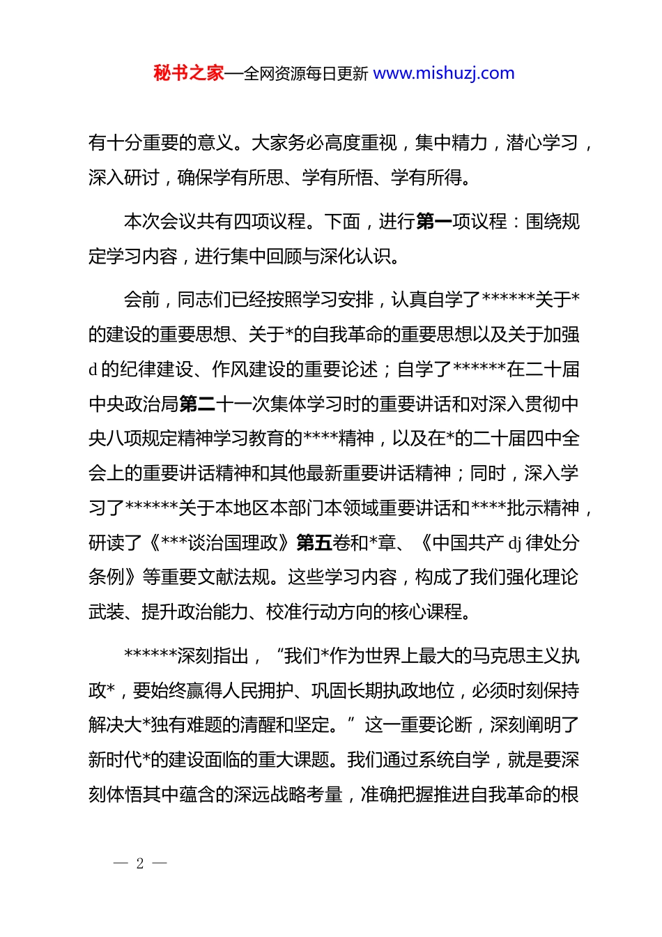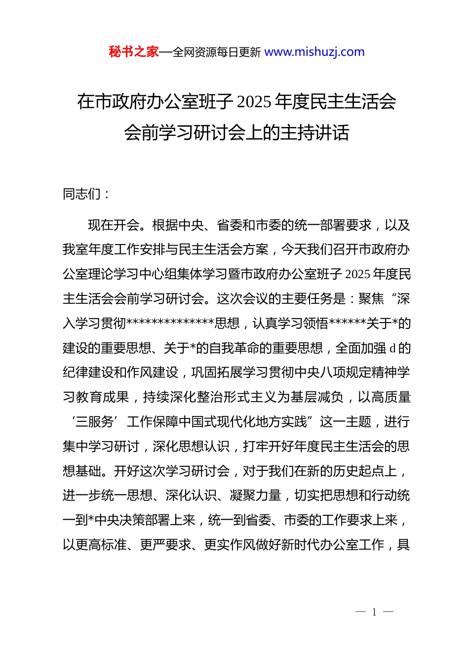 秘书之家—全网资源每日更新 www.mishuzj.com在市政府办公室班子 2025 年度民主生活会会前学习研讨会上的主持讲话同志们:现在开会。根据中央、省委和市委的统一部署要求,以及我室年度工作安排与民主生活会方案,今天我们召开市政府办公室理论学习中心组集体学习暨市政府办公室班子 2025 年度民主生活会会前学习研讨会。这次会议的主要任务是:聚焦“深入学习贯彻**************思想,认真学习领悟******关于*的建设的重要思想、关于*的自我革命的重要思想,全面加强 d 的纪律建设和作风建设,巩固拓展学习贯彻中央八项规定精神学习教育成果,持续深化整治形式主义为基层减负,以高质量‘三服务’工作保障中国式现代化地方实践”这一主题,进行集中学习研讨,深化思想认识,打牢开好年度民主生活会的思想基础。开好这次学习研讨会,对于我们在新的历史起点上,进一步统一思想、深化认识、凝聚力量,切实把思想和行动统一到*中央决策部署上来,统一到省委、市委的工作要求上来,以更高标准、更严要求、更实作风做好新时代办公室工作,具— 1 —秘书之家—全网资源每日更新 www.mishuzj.com有十分重要的意义。大家务必高度重视,集中精力,潜心学习,深入研讨,确保学有所思、学有所悟、学有所得。本次会议共有四项议程。下面,进行第一项议程:围绕规定学习内容,进行集中回顾与深化认识。会前,同志们已经按照学习安排,认真自学了******关于*的建设的重要思想、关于*的自我革命的重要思想以及关于加强d 的纪律建设、作风建设的重要论述;自学了******在二十届中央政治局第二十一次集体学习时的重要讲话和对深入贯彻中央八项规定精神学习教育的****精神,以及在*的二十届四中全会上的重要讲话精神和其他最新重要讲话精神;同时,深入学习了******关于本地区本部门本领域重要讲话和****批示精神,研读了《***谈治国理政》第五卷和*章、《中国共产 dj 律处分条例》等重要文献法规。这些学习内容,构成了我们强化理论武装、提升政治能力、校准行动方向的核心课程。******深刻指出,“我们*作为世界上最大的马克思主义执政*,要始终赢得人民拥护、巩固长期执政地位,必须时刻保持解决大*独有难题的清醒和坚定。”这一重要论断,深刻阐明了新时代*的建设面临的重大课题。我们通过系统自学,就是要深刻体悟其中蕴含的深远战略考量,准确把握推进自我革命的根— 2 —秘书之家—全网资源每日更新 www.mishuzj.com本政治方向。自学的过程,是静心读原著、学原文、悟原理的过程,是主动对表对标、检视自身差距的过程。我们学习*章,就是要不断强化*员意识、恪守*员本分;学习《条例》,就是要明确行为底线、强化纪律自觉;学习***系列重要论述,就是要掌握贯穿其中的立场观点方法,提升运用*的创新理论指导实践、破解难题的能力。希望大家在后续的交流中,能够体现出这些自学成果的转化,展现出政治判断力、政治领悟力、政治执行力的切实提升。接下来,进行第二项议程:传达学习近期中央重要精神。这部分内容是我们本次学习研讨的重点,也是开好民主生活会的重要遵循。首先,传达学习******在 2025 年度中共中央政治局民主生活会上的重要讲话精神。………………******的重要讲话,高屋建瓴、思想深邃、内涵丰富,深刻阐述了新征程上加强*的建设、推进自我革命、深化作风建设的极端重要性,对中央政治局同志提出的“五个带头”要求,以及关于“笃信、务实、担当、自律”的殷切期望,不仅为中— 3 —秘书之家—全网资源每日更新 www.mishuzj.com央政治局树立了标杆,也为全*各级领导干部严肃*内政治生活、加强*性锻炼、提升能力作风指明了方向、提供了根本遵循。讲话中关于“把中央八项规定作为铁规矩、硬杠杠”、“毫不松懈整治‘四风’顽瘴痼疾”、“推进作风建设常态化长效化”等重要要求,释放出作风建设永远在路上的强烈信号。讲话对“务实是必备品格”、“勇于担当”、“严格自律”的强调,精准指出了领导干部履职尽责的关键所在。全室同志,特别是班子成员,必须深刻学习领会,自觉对照反思,切实把***的重要讲话精神转化为锤炼*性、改进作风、推动工作的强大动力...