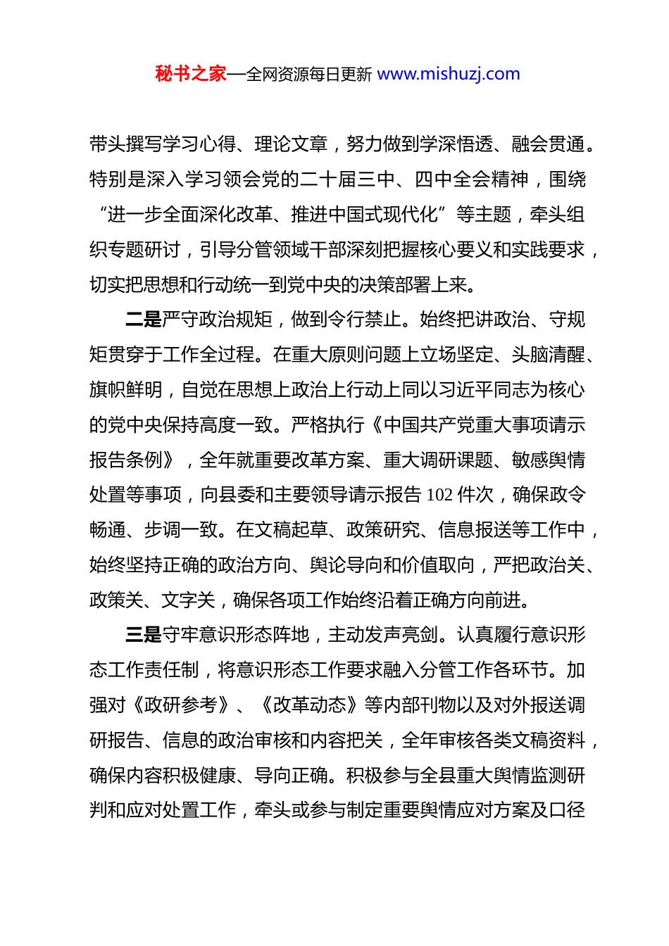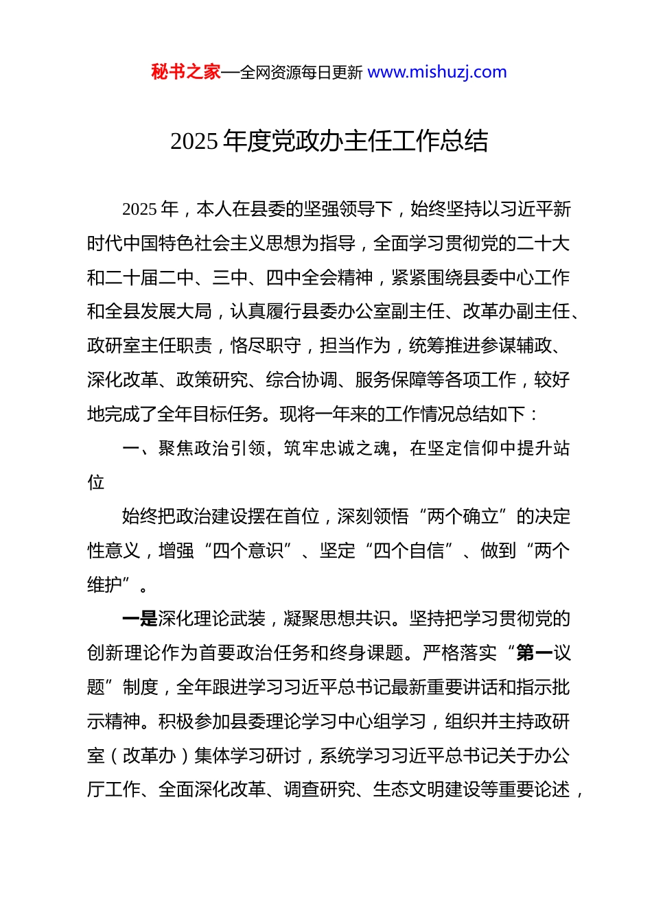 秘书之家—全网资源每日更新 www.mishuzj.com2025 年度党政办主任工作总结 2025 年,本人在县委的坚强领导下,始终坚持以习近平新时代中国特色社会主义思想为指导,全面学习贯彻党的二十大和二十届二中、三中、四中全会精神,紧紧围绕县委中心工作和全县发展大局,认真履行县委办公室副主任、改革办副主任、政研室主任职责,恪尽职守,担当作为,统筹推进参谋辅政、深化改革、政策研究、综合协调、服务保障等各项工作,较好地完成了全年目标任务。现将一年来的工作情况总结如下:一、聚焦政治引领,筑牢忠诚之魂,在坚定信仰中提升站位始终把政治建设摆在首位,深刻领悟“两个确立”的决定性意义,增强“四个意识”、坚定“四个自信”、做到“两个维护”。一是深化理论武装,凝聚思想共识。坚持把学习贯彻党的创新理论作为首要政治任务和终身课题。严格落实“第一议题”制度,全年跟进学习习近平总书记最新重要讲话和指示批示精神。积极参加县委理论学习中心组学习,组织并主持政研室(改革办)集体学习研讨,系统学习习近平总书记关于办公厅工作、全面深化改革、调查研究、生态文明建设等重要论述,秘书之家—全网资源每日更新 www.mishuzj.com带头撰写学习心得、理论文章,努力做到学深悟透、融会贯通。特别是深入学习领会党的二十届三中、四中全会精神,围绕“进一步全面深化改革、推进中国式现代化”等主题,牵头组织专题研讨,引导分管领域干部深刻把握核心要义和实践要求,切实把思想和行动统一到党中央的决策部署上来。二是严守政治规矩,做到令行禁止。始终把讲政治、守规矩贯穿于工作全过程。在重大原则问题上立场坚定、头脑清醒、旗帜鲜明,自觉在思想上政治上行动上同以习近平同志为核心的党中央保持高度一致。严格执行《中国共产党重大事项请示报告条例》,全年就重要改革方案、重大调研课题、敏感舆情处置等事项,向县委和主要领导请示报告 102 件次,确保政令畅通、步调一致。在文稿起草、政策研究、信息报送等工作中,始终坚持正确的政治方向、舆论导向和价值取向,严把政治关、政策关、文字关,确保各项工作始终沿着正确方向前进。三是守牢意识形态阵地,主动发声亮剑。认真履行意识形态工作责任制,将意识形态工作要求融入分管工作各环节。加强对《政研参考》、《改革动态》等内部刊物以及对外报送调研报告、信息的政治审核和内容把关,全年审核各类文稿资料,确保内容积极健康、导向正确。积极参与全县重大舆情监测研判和应对处置工作,牵头或参与制定重要舆情应对方案及口径秘书之家—全网资源每日更新 www.mishuzj.com材料,有效引导社会舆论。组织力量围绕全县高质量发展、改革创新、民生改善等主题,撰写并在省市主流媒体、内部刊物刊发宣传稿件、经验材料,生动讲好县故事,传播县正能量。二、聚焦参谋辅政,发挥中枢作用,在服务决策中彰显价值紧紧围绕县委中心工作和领导关切,努力当好参谋助手,提升以文辅政、督查落实、综合协调水平。一是精益求精抓文稿,以文辅政求高度。始终将文稿服务作为核心职能,坚持高标准、严要求。全年牵头或直接负责起草县委全会报告、全县经济工作会议讲话、县委书记在重要场合的讲话汇报等综合性文稿 48 篇;审核修改各乡镇、各部门报送县委的请示、报告及以县委、县委办名义印发的各类文件,提出实质性修改意见,力求文稿符合上级精神、切合县情实际、体现县委意图。多篇文稿获得县委主要领导肯定性批示。其次是聚焦重点抓调研,决策参考求深度。围绕县委关注的“推动县域经济高质量发展”、“全面推进乡村振兴”、“优化营商环境”、“加强基层治理”等重大课题,牵头制定年度重点调研计划,采取“室领导领题+科室攻关+联合调研”模式,全年组织开展专题调研,形成有情况、有分析、有对策的调研报告。其中,《关于我县融入区域发展战略的路径研究》、《破秘书之家—全网资源每日更新 www.mishuzj.com解乡村产业发展瓶颈的思考与建议》等 8 篇报告获县委主要领导批示,部分建议已转化为具体政策举措;《县深化“放管服”改革优化营商环境的实践》被市委政研室刊物采用。二是强化督查抓落实,推动决策求实效...