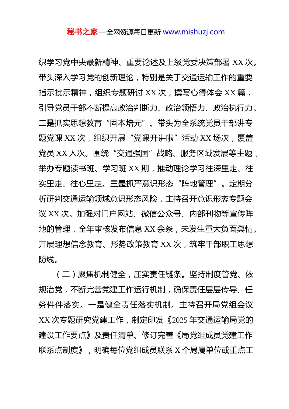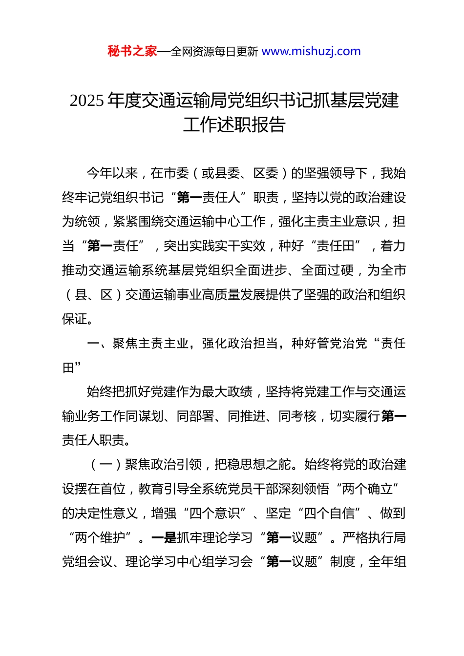 秘书之家—全网资源每日更新 www.mishuzj.com2025 年度交通运输局党组织书记抓基层党建工作述职报告 今年以来,在市委(或县委、区委)的坚强领导下,我始终牢记党组织书记“第一责任人”职责,坚持以党的政治建设为统领,紧紧围绕交通运输中心工作,强化主责主业意识,担当“第一责任”,突出实践实干实效,种好“责任田”,着力推动交通运输系统基层党组织全面进步、全面过硬,为全市(县、区)交通运输事业高质量发展提供了坚强的政治和组织保证。一、聚焦主责主业,强化政治担当,种好管党治党“责任田”始终把抓好党建作为最大政绩,坚持将党建工作与交通运输业务工作同谋划、同部署、同推进、同考核,切实履行第一责任人职责。(一)聚焦政治引领,把稳思想之舵。始终将党的政治建设摆在首位,教育引导全系统党员干部深刻领悟“两个确立”的决定性意义,增强“四个意识”、坚定“四个自信”、做到“两个维护”。一是抓牢理论学习“第一议题”。严格执行局党组会议、理论学习中心组学习会“第一议题”制度,全年组秘书之家—全网资源每日更新 www.mishuzj.com织学习党中央最新精神、重要论述及上级党委决策部署 XX 次。带头深入学习党的创新理论,特别是关于交通运输工作的重要指示批示精神,组织专题研讨 XX 次,撰写心得体会 XX 篇,引导党员干部不断提高政治判断力、政治领悟力、政治执行力。二是抓实思想教育“固本培元”。带头为全系统党员干部讲专题党课 XX 次,组织开展“党课开讲啦”活动 XX 场次,覆盖党员 XX 人次。围绕“交通强国”战略、服务区域发展等主题,举办专题读书班、学习班 XX 期,推动理论学习往深里走、往实里走、往心里走。三是抓严意识形态“阵地管理”。定期分析研判交通运输领域意识形态风险,主持召开意识形态专题会议 XX 次。加强对门户网站、微信公众号、内部刊物等宣传阵地的管理,全年审核发布信息 XX 余条,未发生重大负面舆情。开展理想信念教育、形势政策教育 XX 次,筑牢干部职工思想防线。(二)聚焦机制健全,压实责任链条。坚持制度管党、依规治党,不断完善党建工作运行机制,确保责任层层传导、任务件件落实。一是健全责任落实机制。主持召开局党组会议XX 次专题研究党建工作,制定印发《2025 年交通运输局党的建设工作要点》及责任清单。修订完善《局党组成员党建工作联系点制度》,明确每位党组成员联系 X 个局属单位或重点工秘书之家—全网资源每日更新 www.mishuzj.com程项目部党组织,全年深入联系点调研指导、解决实际问题XX 次。二是健全压力传导机制。年初与各局属单位党组织书记签订《党建工作目标责任书》,年中开展专项督查,年底组织述职评议考核。完善基层党建“双述双评”和考核评价体系,将考核结果与领导班子和领导干部评优评先、选拔任用挂钩,有效传导了管党治党压力。三是健全问题整改机制。针对上年度述职评议考核反馈的 XX 个问题、巡视巡察指出的 XX 个问题,牵头制定整改方案,建立台账,明确责任人和时限,召开专题推进会 XX 次,目前所有问题均已整改到位或取得阶段性成效。定期开展党建工作“回头看”,防止问题反弹。(三)聚焦服务大局,推动融合发展。坚持围绕中心抓党建、抓好党建促业务,推动党建工作与交通运输重点工作深度融合、同频共振。一是在重大任务中彰显组织力。围绕 XX 高速公路建设、XX 国省道改造、城乡客运一体化等重点工程和民生项目,组建“党员突击队” XX 支,设立“党员示范岗”XX 个,划定“党员责任区”XX 处,引导党员干部在项目攻坚、技术攻关、安全监管一线冲锋在前、担当作为,有力保障了年度 XX 亿元投资任务的顺利完成。二是在服务群众中践行初心使命。深化“我为群众办实事”长效机制,局领导班子成员带头领办“出行难”“物流堵点”等民生实事项目 XX 项,秘书之家—全网资源每日更新 www.mishuzj.com目前已全部完成。推动“党建+政务服务”,在交通窗口单位开展“亮身份、树形象、优服务”活动,群众满意度测评达到XX%。组织开展党员志愿服务 XX 余次,服务群众 XX 人次。三是在优化营商环境中展现担当。将党建...