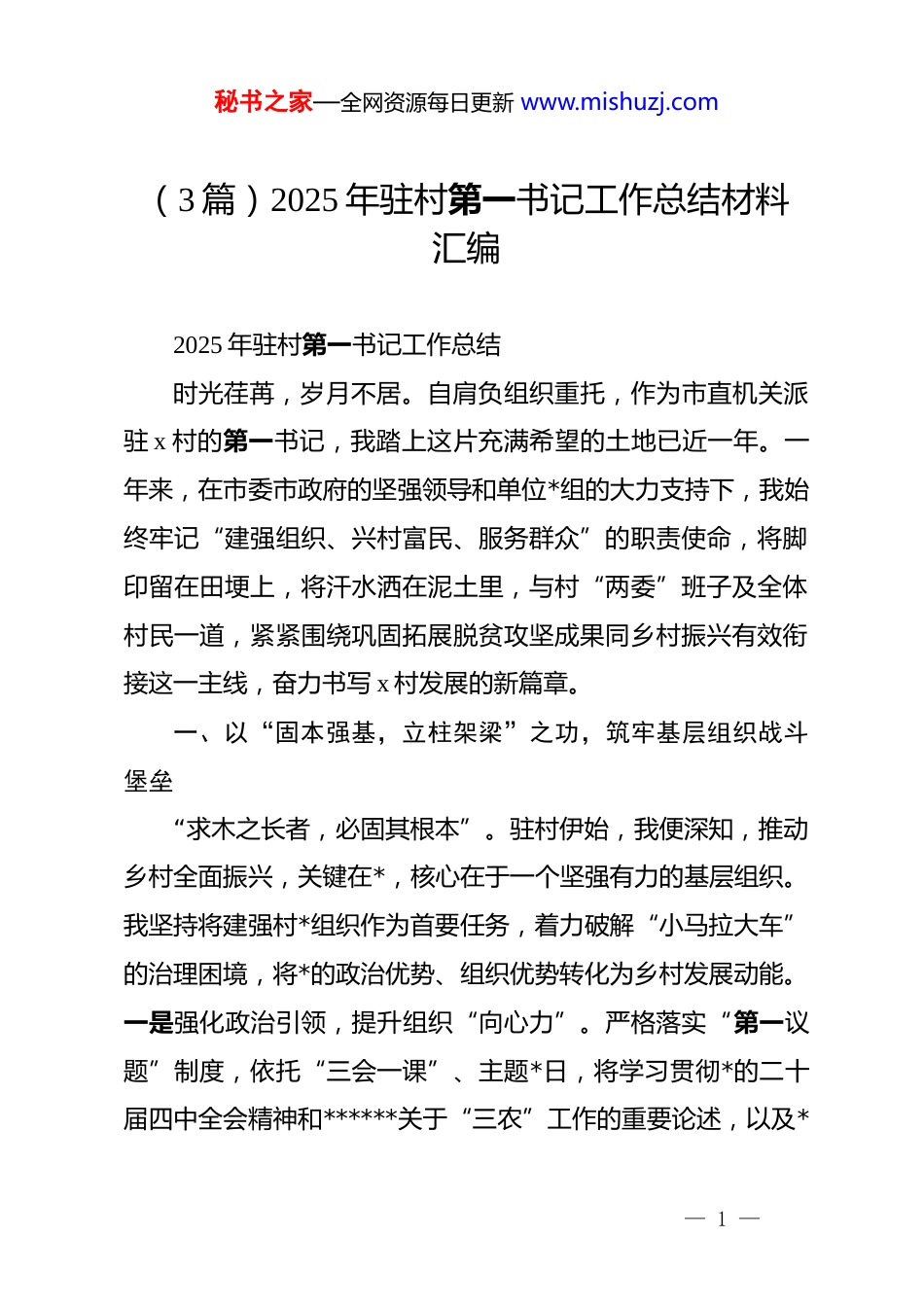 秘书之家—全网资源每日更新 www.mishuzj.com(3 篇)2025 年驻村第一书记工作总结材料汇编2025 年驻村第一书记工作总结时光荏苒,岁月不居。自肩负组织重托,作为市直机关派驻 x 村的第一书记,我踏上这片充满希望的土地已近一年。一年来,在市委市政府的坚强领导和单位*组的大力支持下,我始终牢记“建强组织、兴村富民、服务群众”的职责使命,将脚印留在田埂上,将汗水洒在泥土里,与村“两委”班子及全体村民一道,紧紧围绕巩固拓展脱贫攻坚成果同乡村振兴有效衔接这一主线,奋力书写 x 村发展的新篇章。一、以“固本强基,立柱架梁”之功,筑牢基层组织战斗堡垒“求木之长者,必固其根本”。驻村伊始,我便深知,推动乡村全面振兴,关键在*,核心在于一个坚强有力的基层组织。我坚持将建强村*组织作为首要任务,着力破解“小马拉大车”的治理困境,将*的政治优势、组织优势转化为乡村发展动能。一是强化政治引领,提升组织“向心力”。严格落实“第一议题”制度,依托“三会一课”、主题*日,将学习贯彻*的二十届四中全会精神和******关于“三农”工作的重要论述,以及*— 1 —秘书之家—全网资源每日更新 www.mishuzj.com中央最新决策部署作为核心内容。一年来,组织开展专题学习xx 次,将课堂搬到田间地头、项目现场,春耕时讲惠农政策,秋收时谈产业规划,让*的创新理论“飞入寻常百姓家”,确保了乡村发展始终沿着正确方向前进。二是规范组织运行,增强队伍“战斗力”。针对以往组织生活存在的不规范问题,牵头制定《x 村*支部标准化建设手册》,细化议事决策程序 xx 项。重点实施“头雁培育”工程,从致富能手、返乡青年、退役军人中新发展预备*员 x 名,培育村级后备力量 x 名,为明年村“两委”换届储备了“源头活水”。三是推动机制创新,激发治理“内驱力”。学习借鉴“书记直通车”等先进经验,在村内推行“书记板凳议事会”机制。由村*支部书记牵头,我本人与村“两委”、*员代表、村民代表定期围坐一圈,围绕基础设施建设、集体资产处置、矛盾纠纷调解等议题“开门说事”。年内通过此机制成功化解宅基地纠纷、邻里矛盾等“棘手事”x起,实现了“小事不出村、矛盾不上交”,*组织的凝聚力和公信力显著提升。二、以“因地制宜,精准滴灌”之策,激活乡村产业造血功能“产业兴则乡村兴,产业旺则百姓富”。我深刻认识到,发展产业是巩固脱贫成果、推进乡村振兴的根本之策。我们摒弃— 2 —秘书之家—全网资源每日更新 www.mishuzj.com“等靠要”思想,立足 x 村资源禀赋,精准施策,探索符合村情的特色产业发展之路。一是摸清家底,绘制产业“规划图”。驻村后,我第一时间开展全覆盖走访和“微调研”,与 xx 户村民深入交谈,形成万余字的村情调研报告。我们发现,村内虽有零散的果蔬种植传统,但存在“小、散、弱”、抗风险能力差、销售渠道单一等问题。为此,我们确立了“整合资源、打造品牌、拓宽销路”的产业发展三步走策略。二是聚合资源,打造发展“联合体”。借鉴“四联共建”模式,推动成立“x村特色果蔬产业 dj 联合体”,将分散的农户组织起来,整合土地 xxx 余亩。联合体*委统筹协调,与市农科院对接引入优质种苗,与大型商超签订保底收购协议。通过“*支部+合作社+农户”模式,带动 xx 户农户(含脱贫户 x 户)参与,实现规模化种植,亩均产值预计提升 xx%以上。三是创新销路,架设增收“直通桥”。为解决“酒香也怕巷子深”的问题,我们积极拓展线上线下销售渠道。线上,我带头学习并组织 x 名年轻*员开设助农直播账号,开展“xx”云端带货活动,年内累计直播 xx场,销售草莓、蜜桃等农产品超 xxxx 斤,线上销售额突破 xx万元。线下,依托派出单位资源,在市区设立“x 村优品”展销专柜。今年以来,通过多渠道销售,帮助村民直接增收逾 xx万元,村集体经济收入也从去年的 x 万元增长至 x.x 万元,增幅— 3 —秘书之家—全网资源每日更新 www.mishuzj.com达 xx%。三、以“枝叶关情,初心为民”之心,提升村民幸福生活质感“民之所忧,我必念之;民之所盼,我必行之”。驻村工作的价值,最终要落脚...