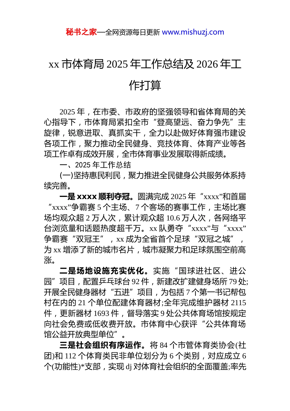 秘书之家—全网资源每日更新 www.mishuzj.comxx 市体育局 2025 年工作总结及 2026 年工作打算2025 年,在市委、市政府的坚强领导和省体育局的关心指导下,市体育局紧扣全市“登高望远、奋力争先”主旋律,锐意进取、真抓实干,全力以赴做好体育强市建设各项工作,聚力推动全民健身、竞技体育、体育产业等各项工作卓有成效开展,全市体育事业发展取得新成绩。一、2025 年工作总结(一)坚持惠民利民,聚力推进全民健身公共服务体系持续完善。一是 xxxx 顺利夺冠。圆满完成 2025 年“xxxx”和首届“xxxx”争霸赛 5 个主场、7 个客场的赛事工作,主场比赛场均观众超 2 万人次,累计观众超 10.6 万人次,各网络平台浏览量和话题热度超千万。xx 队勇夺“xxxx”与“xxxx”争霸赛“双冠王”,xx 成为全省首个足球“双冠之城”,为 xx 增添了新的城市名片,城市凝聚力和足球氛围空前高涨。二是场地设施充实优化。实施“国球进社区、进公园”项目,配置乒乓球台 92 件,新建改扩建健身场所 79 处;开展全民健身器材“五进”项目,为包括 7 个第一书记帮包村在内的 21 个单位配建体育器材;全年完成维护器材 2115件,更新器材 1693 件,督导落实 9 处公共体育场馆按规定向社会免费或低收费开放。市体育中心获评“公共体育场馆公益开放典型单位”。三是社会组织有序运作。将 84 个市管体育类协会(社团)和 112 个体育类民非单位划分为 6 个类别,对应成立 6个(功能性)*支部,实现 dj 对体育社会组织的全面覆盖;率先秘书之家—全网资源每日更新 www.mishuzj.com在全省制定出台《xx 市市级体育协会管理办法》,强化社会组织规范化管理。四是健身活动广泛开展。成功承办第一届全国健身气功太极养生杖交流比赛大会暨段位积分赛、全国行走大运河全民健身系列活动暨“走大运趣东平”文旅体嘉年华活动、xx 省第八届冬季全民健身运动会单/双板大回转等群众类大型赛事活动,并以 xx 市第十五届全民健身运动会为主线,组织开展社区家门口运动会、乡村体育“四赛”等群众身边的体育赛事活动 2317 项次,参与群众达百万人次以上。其中社区家门口运动会达 1300 余场次,参与人数超 20万人次。获评“xx 省第八届冬季全民健身运动会优秀组织奖”。五是志愿服务持续丰富。印发《关于开展“奋进新征程运动促健康”全民健身志愿服务活动的通知》,全年组织全民健身志愿服务共计 5624 场次,健身指导 14 万余人次;年度完成社会体育指导员培训省一级 1 期 80 人、市二级 9期 600 余人,参加国家级培训 11 人;组织开展国家第六次国民体质监测(xx 站)、全市第十五次中小学生体质健康抽测、青少年脊柱侧弯专项筛查等活动,全年累计服务 15000 人次。(二)坚持争先进位,聚力推进竞技体育综合实力稳步提升。一是竞赛成绩亮点纷呈。2025 年第十五届全运会,我市输送的 34 名运动员在柔道、射箭、拳击等 16 个竞赛项目中取得了 2 金,3 银,4 铜的良好成绩,得到了省体育局,省举摔柔、水上运动管理中心的肯定。全年参加其他全国及以上比赛取得 29 金、22 银、44 铜的成绩。省锦标赛中,我市共派出运动员 1009 人参加排球、柔道、手球、古典跤、跆拳道、散打、7 人制橄榄球等 28 个项目比赛,取得 73 金,44 银,60.5 铜,位列全省第 8。目前,我市共有省专业运动队正式运动员 45 人、试训运动员 42 人,已经注册第 26 届省运会适龄运动员 1229 人,为备战第 26 届省运会奠定坚实秘书之家—全网资源每日更新 www.mishuzj.com人才基础。二是体教融合深入推进。联合市教育局举办 2025 年 xx市青少年(学生)七项体育联赛,共计 2700 余名青少年运动员参赛。印发《xx 省第二十六届运动会周期体教融合共建市级运动队的通知》(x〔2025〕x 号),推进市体校、市体育事业发展中心 12 个运动项目与城区 24 所学校合作共建运动队,构建“小学—初中—高中”“训练连贯+升学衔接”一条龙人才培养通道。三是大力发展青少年赛事。依托社会力量,成功承办省级及以上青少年赛事及“决战泰山之巅”小篮球精英赛跆拳道搏击...
