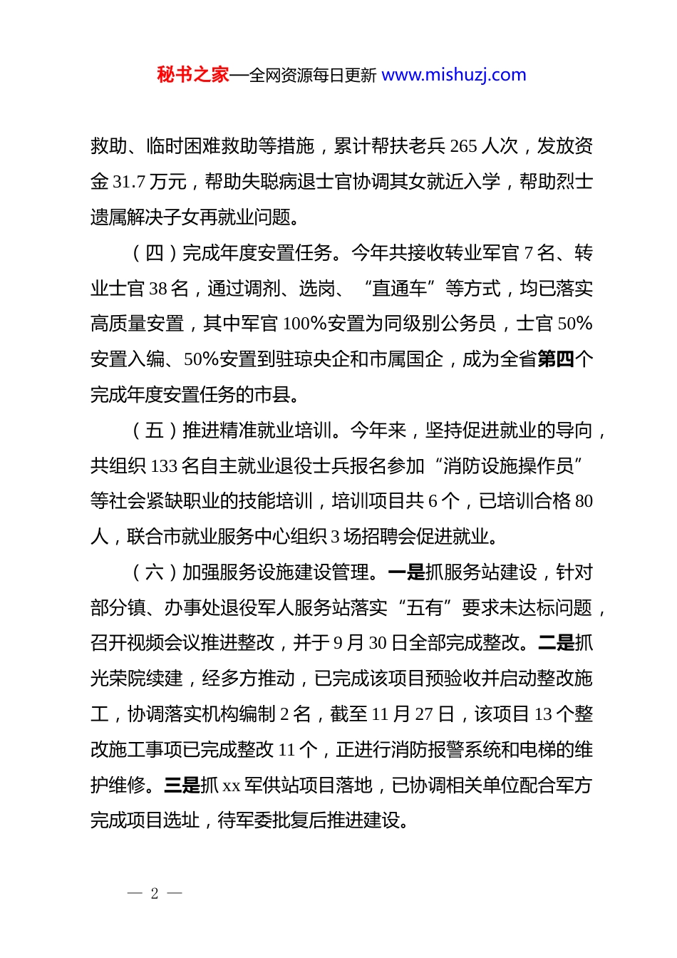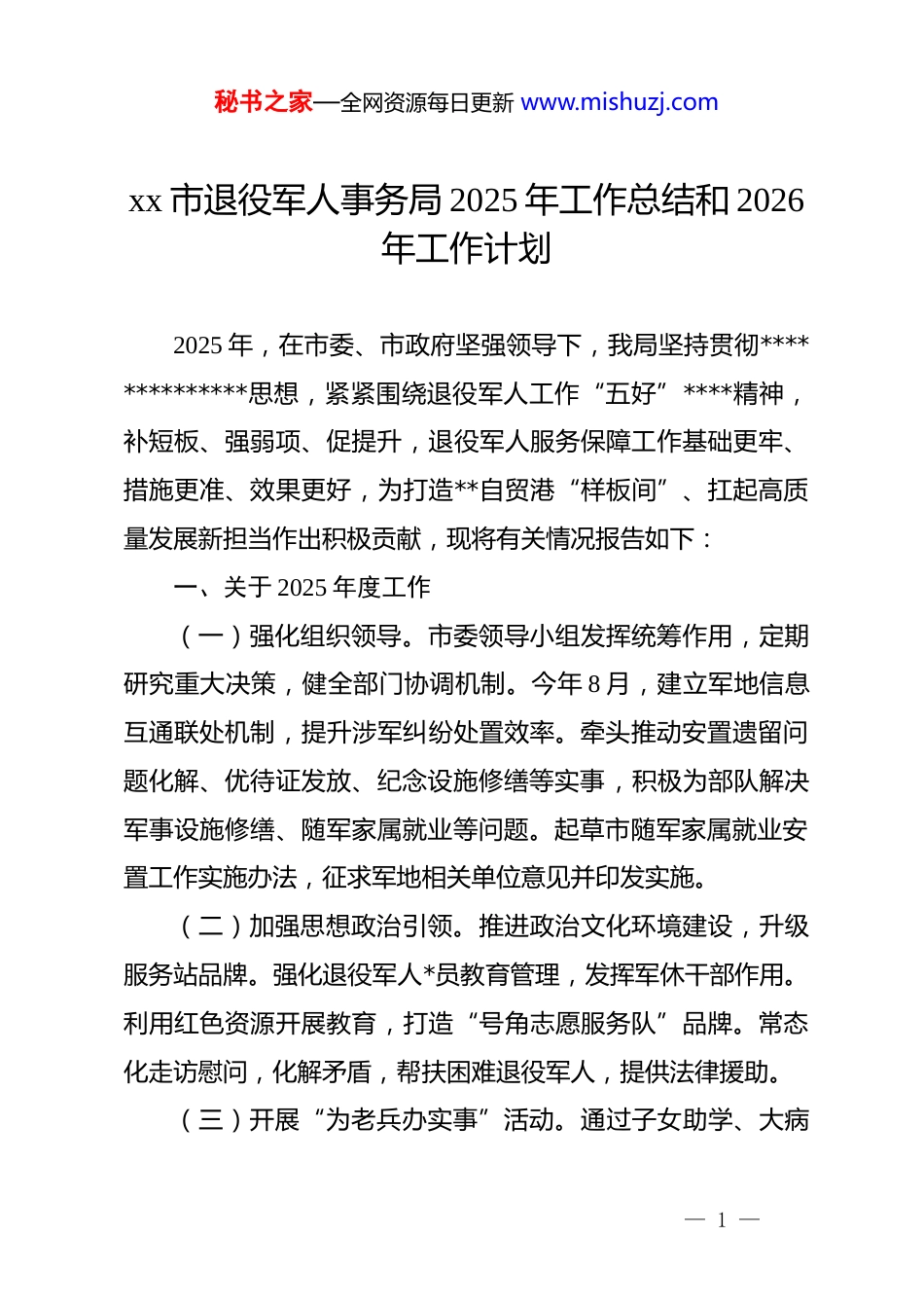 秘书之家—全网资源每日更新 www.mishuzj.comxx 市退役军人事务局 2025 年工作总结和 2026年工作计划2025 年,在市委、市政府坚强领导下,我局坚持贯彻**************思想,紧紧围绕退役军人工作“五好”****精神,补短板、强弱项、促提升,退役军人服务保障工作基础更牢、措施更准、效果更好,为打造**自贸港“样板间”、扛起高质量发展新担当作出积极贡献,现将有关情况报告如下:一、关于 2025 年度工作(一)强化组织领导。市委领导小组发挥统筹作用,定期研究重大决策,健全部门协调机制。今年 8 月,建立军地信息互通联处机制,提升涉军纠纷处置效率。牵头推动安置遗留问题化解、优待证发放、纪念设施修缮等实事,积极为部队解决军事设施修缮、随军家属就业等问题。起草市随军家属就业安置工作实施办法,征求军地相关单位意见并印发实施。(二)加强思想政治引领。推进政治文化环境建设,升级服务站品牌。强化退役军人*员教育管理,发挥军休干部作用。利用红色资源开展教育,打造“号角志愿服务队”品牌。常态化走访慰问,化解矛盾,帮扶困难退役军人,提供法律援助。(三)开展“为老兵办实事”活动。通过子女助学、大病— 1 —秘书之家—全网资源每日更新 www.mishuzj.com救助、临时困难救助等措施,累计帮扶老兵 265 人次,发放资金 31.7 万元,帮助失聪病退士官协调其女就近入学,帮助烈士遗属解决子女再就业问题。(四)完成年度安置任务。今年共接收转业军官 7 名、转业士官 38 名,通过调剂、选岗、“直通车”等方式,均已落实高质量安置,其中军官 100%安置为同级别公务员,士官 50%安置入编、50%安置到驻琼央企和市属国企,成为全省第四个完成年度安置任务的市县。(五)推进精准就业培训。今年来,坚持促进就业的导向,共组织 133 名自主就业退役士兵报名参加“消防设施操作员”等社会紧缺职业的技能培训,培训项目共 6 个,已培训合格 80人,联合市就业服务中心组织 3 场招聘会促进就业。(六)加强服务设施建设管理。一是抓服务站建设,针对部分镇、办事处退役军人服务站落实“五有”要求未达标问题,召开视频会议推进整改,并于 9 月 30 日全部完成整改。二是抓光荣院续建,经多方推动,已完成该项目预验收并启动整改施工,协调落实机构编制 2 名,截至 11 月 27 日,该项目 13 个整改施工事项已完成整改 11 个,正进行消防报警系统和电梯的维护维修。三是抓 xx 军供站项目落地,已协调相关单位配合军方完成项目选址,待军委批复后推进建设。— 2 —秘书之家—全网资源每日更新 www.mishuzj.com(七)扎实开展信访工作。全年共受理来信来访 55 件,108 人次,受理答复率 100%,无越级上访情况。其中,中央第八巡视组移交信访件共 14 个,均已按相关规定予以办理,信访总体情况较稳定。二、关于存在问题(一)个别烈士纪念设施办理不动产权证进展缓慢。截至11 月 27 日,我市 6 处县级以上烈士纪念设施中,有 3 处已办证,2 处已提交资规部门办证,还有 1 处,即木排革命根据地人民英雄纪念碑,其土地归属于 xx 农场公司,经联合市资规局推进协调,因其所在地块未曾办理过控规手续,目前还在申请规划覆盖,未进行到公示环节。(二)信访维稳压力较为突出。一方面部分退役军人对政策理解不透,攀比心理较为严重,不间断进行上访诉求;另一方面部分职能部门未按照信访法治化要求,对信访事项进行精准分类处理,以人群分工,不按照信访诉求事项分类现象依旧存在,致使信访诉求无法推动。如 xxx 等 26 名城镇下岗伤残人员诉求补缴补发住房公积金事项,指定由我局牵头解决,但是,根据信访法治化规定“征地拆迁、涉法涉诉、劳动保障、投资受损、部队遗留、企业改制、恢复名誉、办理退休、职级评定等不属于退役军人事务部门职权范围。”我局既不是住房公积— 3 —秘书之家—全网资源每日更新 www.mishuzj.com金的职能单位,也不是该群体用工主体单位,仅因为该群体人员曾有当兵经历,便由我局负责超越越职权解决其诉求,不利于相关矛盾的化解。(三)光荣院项目遗留问题较多。一是项目消防...