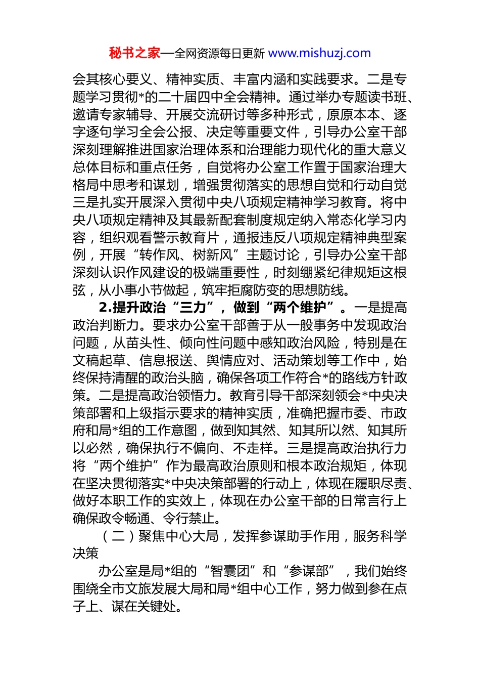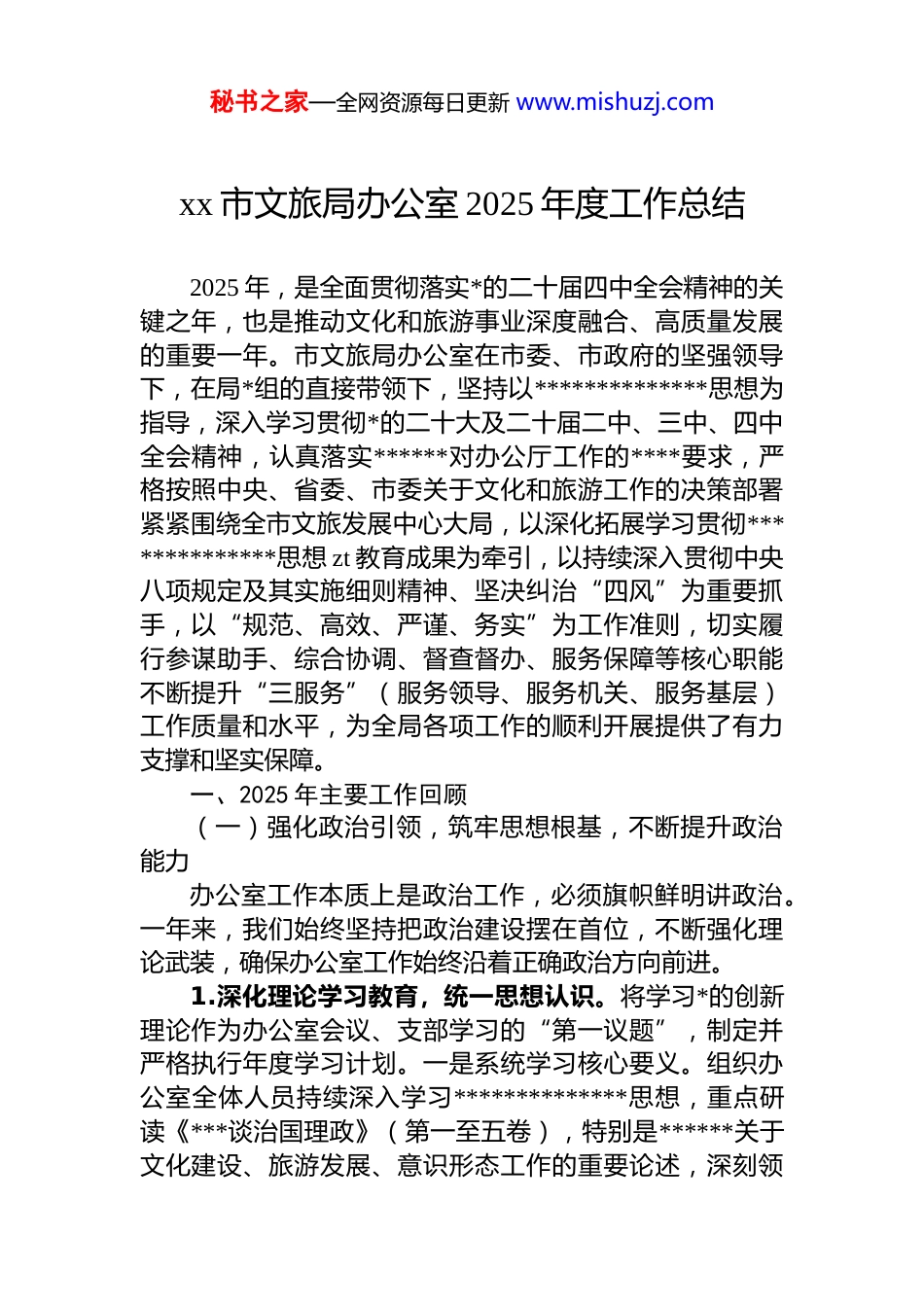 秘书之家—全网资源每日更新 www.mishuzj.comxx 市文旅局办公室 2025 年度工作总结2025 年,是全面贯彻落实*的二十届四中全会精神的关键之年,也是推动文化和旅游事业深度融合、高质量发展的重要一年。市文旅局办公室在市委、市政府的坚强领导下,在局*组的直接带领下,坚持以**************思想为指导,深入学习贯彻*的二十大及二十届二中、三中、四中全会精神,认真落实******对办公厅工作的****要求,严格按照中央、省委、市委关于文化和旅游工作的决策部署紧紧围绕全市文旅发展中心大局,以深化拓展学习贯彻**************思想 zt 教育成果为牵引,以持续深入贯彻中央八项规定及其实施细则精神、坚决纠治“四风”为重要抓手,以“规范、高效、严谨、务实”为工作准则,切实履行参谋助手、综合协调、督查督办、服务保障等核心职能不断提升“三服务”(服务领导、服务机关、服务基层)工作质量和水平,为全局各项工作的顺利开展提供了有力支撑和坚实保障。一、2025 年主要工作回顾(一)强化政治引领,筑牢思想根基,不断提升政治能力办公室工作本质上是政治工作,必须旗帜鲜明讲政治。一年来,我们始终坚持把政治建设摆在首位,不断强化理论武装,确保办公室工作始终沿着正确政治方向前进。1.深化理论学习教育,统一思想认识。将学习*的创新理论作为办公室会议、支部学习的“第一议题”,制定并严格执行年度学习计划。一是系统学习核心要义。组织办公室全体人员持续深入学习**************思想,重点研读《***谈治国理政》(第一至五卷),特别是******关于文化建设、旅游发展、意识形态工作的重要论述,深刻领秘书之家—全网资源每日更新 www.mishuzj.com会其核心要义、精神实质、丰富内涵和实践要求。二是专题学习贯彻*的二十届四中全会精神。通过举办专题读书班、邀请专家辅导、开展交流研讨等多种形式,原原本本、逐字逐句学习全会公报、决定等重要文件,引导办公室干部深刻理解推进国家治理体系和治理能力现代化的重大意义总体目标和重点任务,自觉将办公室工作置于国家治理大格局中思考和谋划,增强贯彻落实的思想自觉和行动自觉三是扎实开展深入贯彻中央八项规定精神学习教育。将中央八项规定精神及其最新配套制度规定纳入常态化学习内容,组织观看警示教育片,通报违反八项规定精神典型案例,开展“转作风、树新风”主题讨论,引导办公室干部深刻认识作风建设的极端重要性,时刻绷紧纪律规矩这根弦,从小事小节做起,筑牢拒腐防变的思想防线。2.提升政治“三力”,做到“两个维护”。一是提高政治判断力。要求办公室干部善于从一般事务中发现政治问题,从苗头性、倾向性问题中感知政治风险,特别是在文稿起草、信息报送、舆情应对、活动策划等工作中,始终保持清醒的政治头脑,确保各项工作符合*的路线方针政策。二是提高政治领悟力。教育引导干部深刻领会*中央决策部署和上级指示要求的精神实质,准确把握市委、市政府和局*组的工作意图,做到知其然、知其所以然、知其所以必然,确保执行不偏向、不走样。三是提高政治执行力将“两个维护”作为最高政治原则和根本政治规矩,体现在坚决贯彻落实*中央决策部署的行动上,体现在履职尽责、做好本职工作的实效上,体现在办公室干部的日常言行上确保政令畅通、令行禁止。(二)聚焦中心大局,发挥参谋助手作用,服务科学决策办公室是局*组的“智囊团”和“参谋部”,我们始终围绕全市文旅发展大局和局*组中心工作,努力做到参在点子上、谋在关键处。秘书之家—全网资源每日更新 www.mishuzj.com1.高质量完成文稿起草工作。坚持把以文辅政作为办公室的核心能力来建设。一年来,紧紧围绕全市文旅工作会议、重大项目推进、上级调研汇报、年度工作总结计划等关键节点,牵头或参与起草了各类重要文件、领导讲话工作报告、调研报告、政策文件、情况汇报等共计 xx 篇,约 xx 万字。在起草过程中,注重准确把握上级精神、紧密结合 xx 市文旅实际、充分反映基层呼声,努力提升文稿的思想性、指导性和可操作性。例如,在起草《xx 市“十四五”文旅发展规划中期评估报告》时,办公室组织精干力量,深入调研,多方论证...