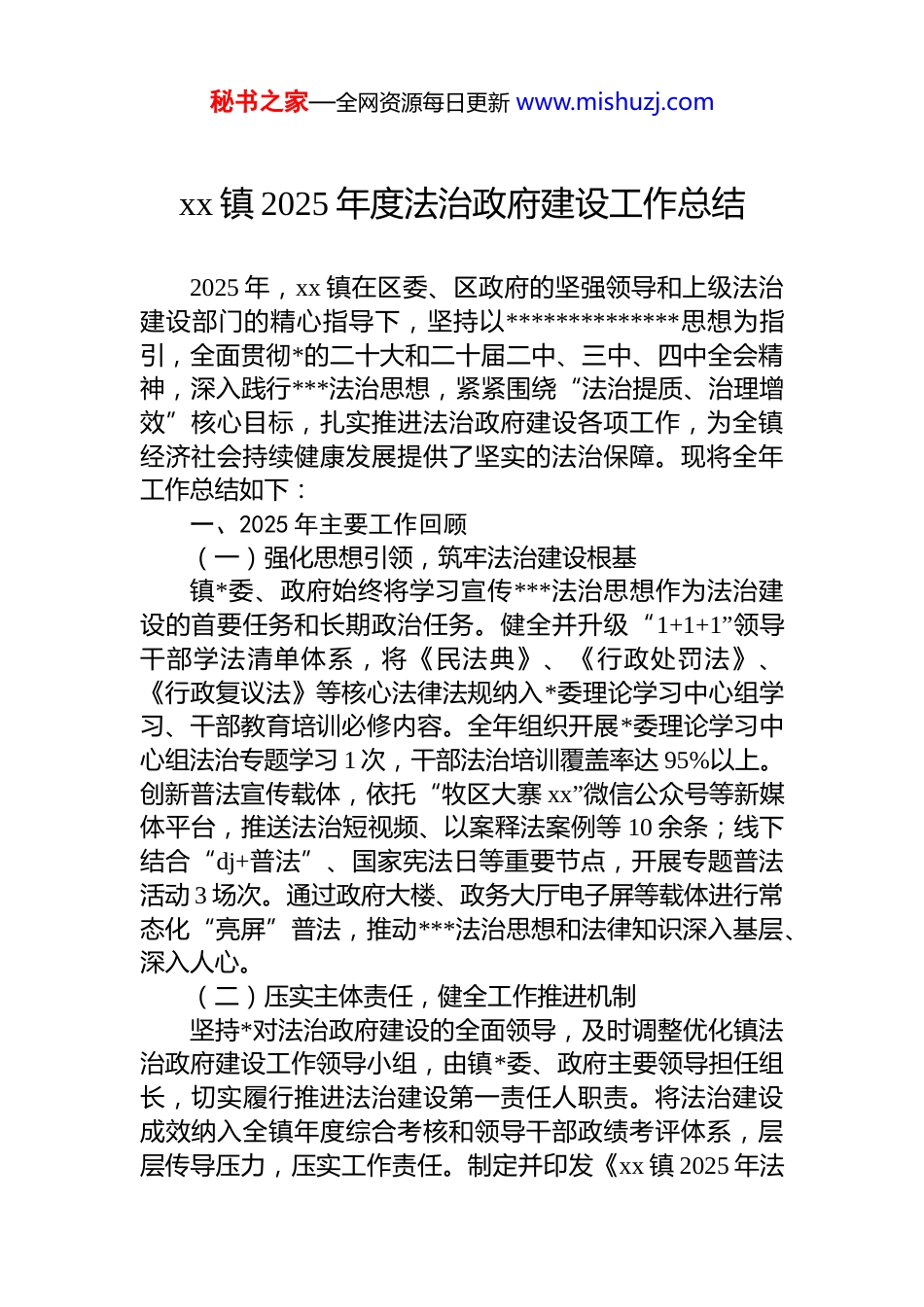 秘书之家—全网资源每日更新 www.mishuzj.comxx 镇 2025 年度法治政府建设工作总结2025 年,xx 镇在区委、区政府的坚强领导和上级法治建设部门的精心指导下,坚持以**************思想为指引,全面贯彻*的二十大和二十届二中、三中、四中全会精神,深入践行***法治思想,紧紧围绕“法治提质、治理增效”核心目标,扎实推进法治政府建设各项工作,为全镇经济社会持续健康发展提供了坚实的法治保障。现将全年工作总结如下:一、2025 年主要工作回顾(一)强化思想引领,筑牢法治建设根基镇*委、政府始终将学习宣传***法治思想作为法治建设的首要任务和长期政治任务。健全并升级“1+1+1”领导干部学法清单体系,将《民法典》、《行政处罚法》、《行政复议法》等核心法律法规纳入*委理论学习中心组学习、干部教育培训必修内容。全年组织开展*委理论学习中心组法治专题学习 1 次,干部法治培训覆盖率达 95%以上。创新普法宣传载体,依托“牧区大寨 xx”微信公众号等新媒体平台,推送法治短视频、以案释法案例等 10 余条;线下结合“dj+普法”、国家宪法日等重要节点,开展专题普法活动 3 场次。通过政府大楼、政务大厅电子屏等载体进行常态化“亮屏”普法,推动***法治思想和法律知识深入基层、深入人心。(二)压实主体责任,健全工作推进机制坚持*对法治政府建设的全面领导,及时调整优化镇法治政府建设工作领导小组,由镇*委、政府主要领导担任组长,切实履行推进法治建设第一责任人职责。将法治建设成效纳入全镇年度综合考核和领导干部政绩考评体系,层层传导压力,压实工作责任。制定并印发《xx 镇 2025 年法秘书之家—全网资源每日更新 www.mishuzj.com治政府建设工作要点》、《行政执法质量提升实施方案》等文件,明确年度目标任务、责任分工和时间节点,形成了“*委统揽、政府主抓、部门协同、社会参与”的法治建设工作格局。全年组织召开法治建设专题会议、信访联席会、工作推进会等 8 次,协调旗级自然资源、司法、民政、水利等部门开展联合下访 3 次,有效凝聚了工作合力。(三)规范决策程序,提升依法行政水平严格执行重大行政决策程序规定,健全合法性审查机制,明确镇司法所为合法性审查核心机构,并充分发挥法律顾问“智库”作用。全年对 15 项重大行政决策事项、11份规范性文件进行了合法性审查,审查通过率 100%,从源头上确保了决策的合法性。深化“一村一法律顾问”制度为全镇 7 个嘎查村配备专业律师,全年提供法律咨询、合同审查、纠纷调解等服务 40 余次,有效满足了基层法律需求。建立健全重大决策社会稳定风险评估机制,对 3 项涉及群众切身利益的重大项目实施风险评估,提前预警并化解潜在风险。年内,全镇未发生因行政决策不当引发的行政复议被撤销或行政诉讼败诉案件。(四)聚焦执法规范,增强行政执法效能全面深化行政执法公示、执法全过程记录、重大执法决定法制审核“三项制度”。修订完善《xx 镇综合行政执法工作细则》、《案卷评查标准》等内部规范 5 项,进一步细化了执法流程和标准。加强执法保障,新增行政执法记录仪 5 部、便携式执法终端 3 台,优化执法车辆配置,执法硬件水平得到提升。动态调整并公示行政执法权责清单 40项,自觉接受社会监督。全年依法办理各类行政执法案件28 起,案件办结率和当事人满意度均保持在 98%以上。高度重视执法队伍建设,组织执法人员参加上级业务培训 11次,开展全镇行政执法案卷集中评查 4 次,发布“以案释法”典型案例 2 期,执法人员法治素养和办案能力显著增强。(五)创新普法形式,营造浓厚法治氛围秘书之家—全网资源每日更新 www.mishuzj.com深入实施“八五”普法规划,严格落实“谁执法谁普法”责任制。创新打造“微光宣讲团、科级干部讲堂、老兵宣讲队、青少年普法课堂”四大特色普法品牌,提升普法精准性和感染力。围绕中心工作和群众需求,开展“一月一主题”法治宣传活动 39 场,针对毁林毁草开荒等突出问题开展专项普法宣传 42 次。全年累计发放各类法治宣传资料 4540 余份,通过微信公众号发布法治宣传信息 20 余条,覆盖受众超过 21...