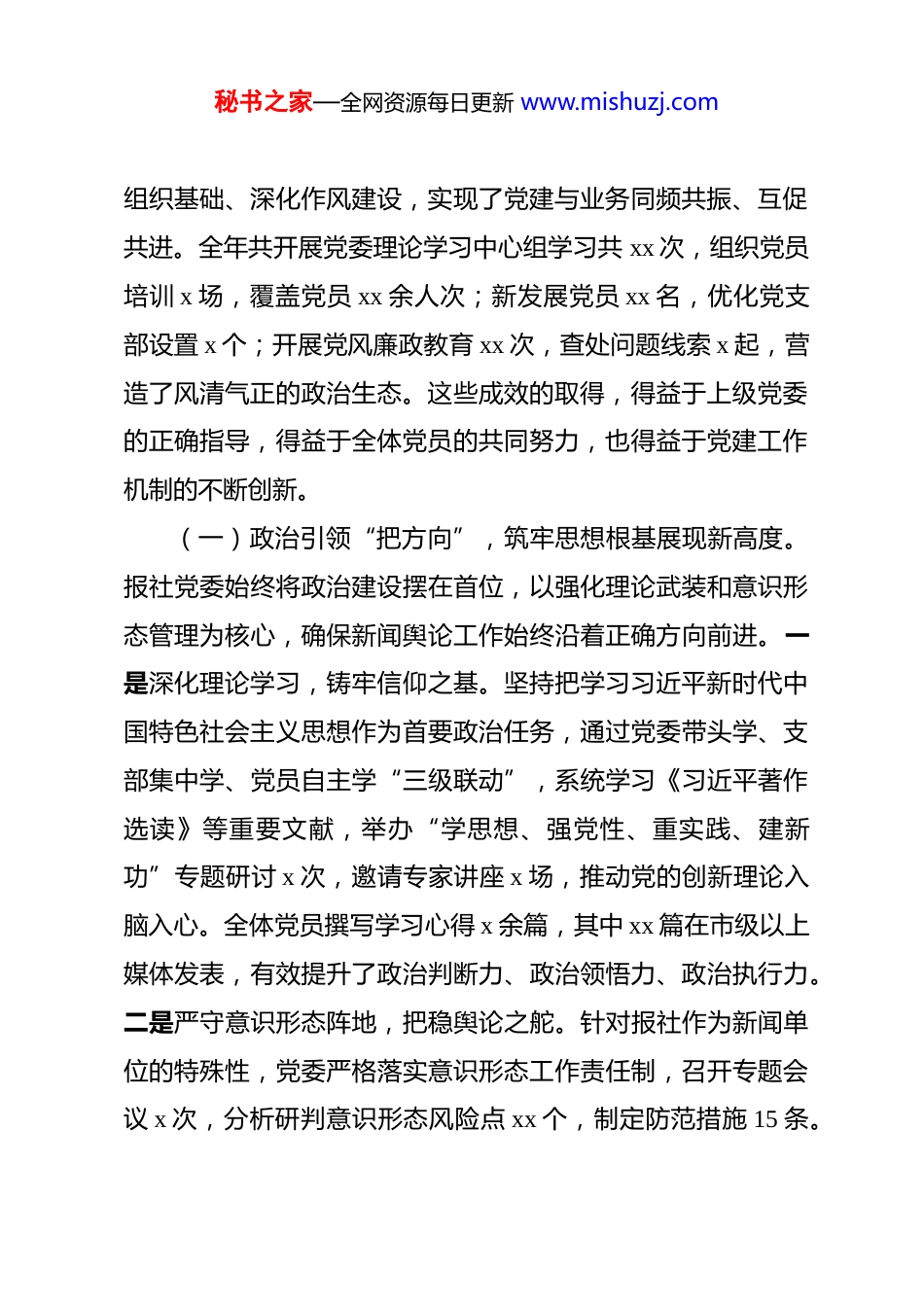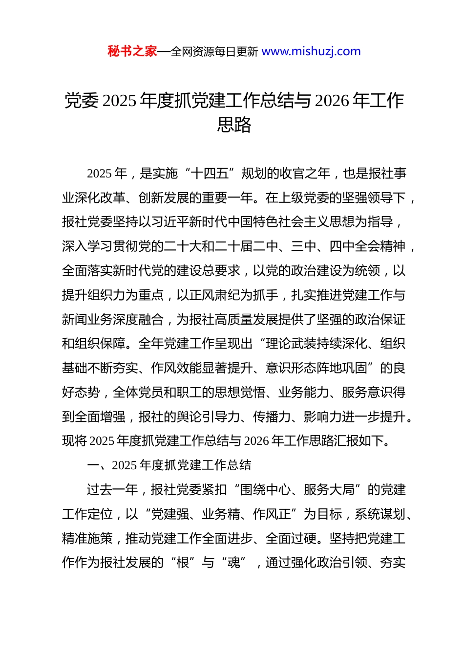秘书之家—全网资源每日更新 www.mishuzj.com党委 2025 年度抓党建工作总结与 2026 年工作思路2025 年,是实施“十四五”规划的收官之年,也是报社事业深化改革、创新发展的重要一年。在上级党委的坚强领导下,报社党委坚持以习近平新时代中国特色社会主义思想为指导,深入学习贯彻党的二十大和二十届二中、三中、四中全会精神,全面落实新时代党的建设总要求,以党的政治建设为统领,以提升组织力为重点,以正风肃纪为抓手,扎实推进党建工作与新闻业务深度融合,为报社高质量发展提供了坚强的政治保证和组织保障。全年党建工作呈现出“理论武装持续深化、组织基础不断夯实、作风效能显著提升、意识形态阵地巩固”的良好态势,全体党员和职工的思想觉悟、业务能力、服务意识得到全面增强,报社的舆论引导力、传播力、影响力进一步提升。现将 2025 年度抓党建工作总结与 2026 年工作思路汇报如下。一、2025 年度抓党建工作总结过去一年,报社党委紧扣“围绕中心、服务大局”的党建工作定位,以“党建强、业务精、作风正”为目标,系统谋划、精准施策,推动党建工作全面进步、全面过硬。坚持把党建工作作为报社发展的“根”与“魂”,通过强化政治引领、夯实秘书之家—全网资源每日更新 www.mishuzj.com组织基础、深化作风建设,实现了党建与业务同频共振、互促共进。全年共开展党委理论学习中心组学习共 xx 次,组织党员培训 x 场,覆盖党员 xx 余人次;新发展党员 xx 名,优化党支部设置 x 个;开展党风廉政教育 xx 次,查处问题线索 x 起,营造了风清气正的政治生态。这些成效的取得,得益于上级党委的正确指导,得益于全体党员的共同努力,也得益于党建工作机制的不断创新。(一)政治引领“把方向”,筑牢思想根基展现新高度。报社党委始终将政治建设摆在首位,以强化理论武装和意识形态管理为核心,确保新闻舆论工作始终沿着正确方向前进。一是深化理论学习,铸牢信仰之基。坚持把学习习近平新时代中国特色社会主义思想作为首要政治任务,通过党委带头学、支部集中学、党员自主学“三级联动”,系统学习《习近平著作选读》等重要文献,举办“学思想、强党性、重实践、建新功”专题研讨 x 次,邀请专家讲座 x 场,推动党的创新理论入脑入心。全体党员撰写学习心得 x 余篇,其中 xx 篇在市级以上媒体发表,有效提升了政治判断力、政治领悟力、政治执行力。二是严守意识形态阵地,把稳舆论之舵。针对报社作为新闻单位的特殊性,党委严格落实意识形态工作责任制,召开专题会议 x 次,分析研判意识形态风险点 xx 个,制定防范措施 15 条。秘书之家—全网资源每日更新 www.mishuzj.com加强对新闻报道、新媒体平台的审核把关,全年审核稿件 xxx余篇,纠正偏差 xx 余次,确保了舆论导向正确、内容安全可靠。三是践行“两个维护”,彰显政治担当。党委引导党员职工在新闻报道中自觉服务党和国家工作大局,围绕乡村振兴、科技创新等主题策划专题报道 xx 余个,推出系列评论文章 xx 余篇,其中 x 篇获省级新闻奖,x 篇被中央媒体转载,有力传播主流声音,巩固思想舆论阵地。(二)组织建设“强根基”,提升战斗堡垒焕发新活力。报社党委以提升组织力为重点,通过优化组织设置、严格党员管理、创新活动载体,推动基层党组织全面进步、全面过硬。一是夯实组织体系,织密党建网络。我们根据业务部门调整,优化党支部设置 x 个,实现“支部建在部门上”,选优配强支部书记 xx 名,确保党建工作全覆盖、无死角。制定《党支部标准化建设手册》,规范“三会一课”、主题党日等制度,全年开展主题党日活动 xx 次,支部组织生活会 xx 次,党员参与率达 xx%以上,有效增强了组织凝聚力。二是强化党员教育管理,锻造过硬队伍。实施党员“双培养”工程,将业务骨干发展为党员、将党员培养为业务骨干,全年发展党员 xx 名,其中采编一线人员占比 xx%。开展党员承诺践诺活动,设立“党员先锋岗”xx 个,组织技能竞赛 x 场,表彰优秀党员 xx 名,激发了党秘书之家—全网资源每日更新 www.mishuzj.com员干事创业的热情。党员在重大...