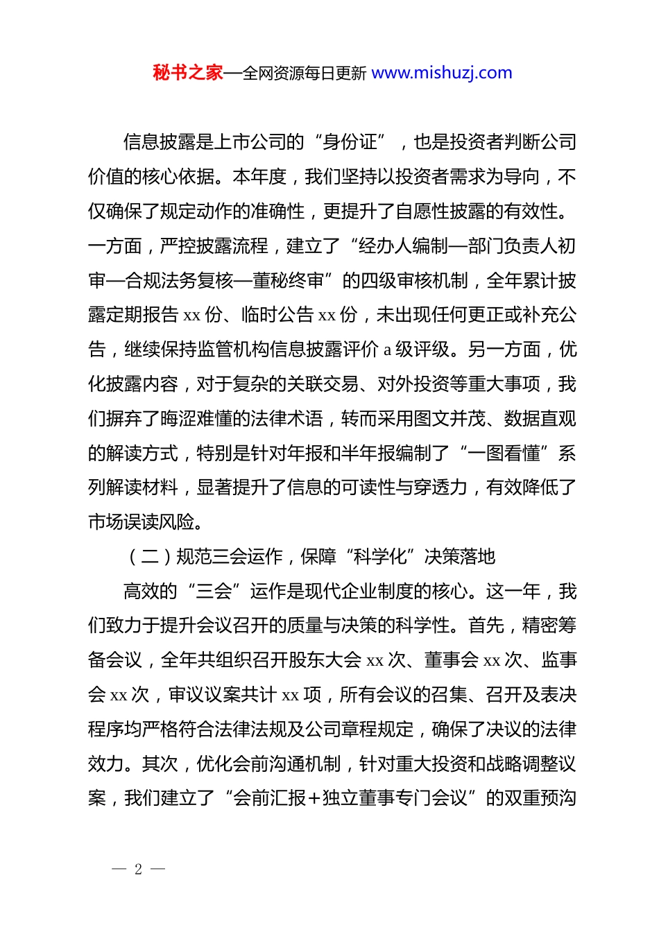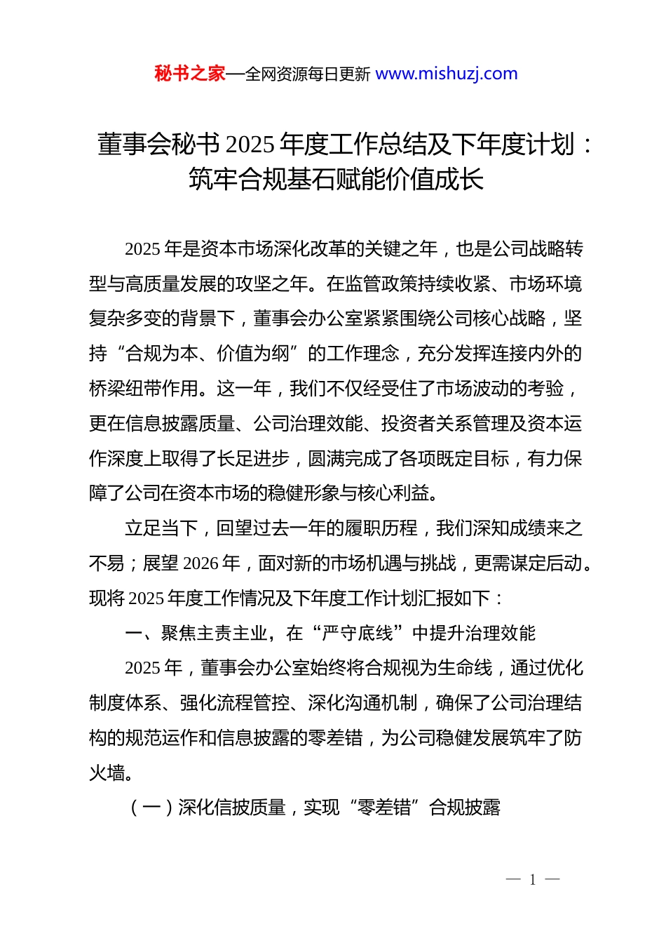 秘书之家—全网资源每日更新 www.mishuzj.com董事会秘书 2025 年度工作总结及下年度计划:筑牢合规基石赋能价值成长2025 年是资本市场深化改革的关键之年,也是公司战略转型与高质量发展的攻坚之年。在监管政策持续收紧、市场环境复杂多变的背景下,董事会办公室紧紧围绕公司核心战略,坚持“合规为本、价值为纲”的工作理念,充分发挥连接内外的桥梁纽带作用。这一年,我们不仅经受住了市场波动的考验,更在信息披露质量、公司治理效能、投资者关系管理及资本运作深度上取得了长足进步,圆满完成了各项既定目标,有力保障了公司在资本市场的稳健形象与核心利益。立足当下,回望过去一年的履职历程,我们深知成绩来之不易;展望 2026 年,面对新的市场机遇与挑战,更需谋定后动。现将 2025 年度工作情况及下年度工作计划汇报如下:一、聚焦主责主业,在“严守底线”中提升治理效能2025 年,董事会办公室始终将合规视为生命线,通过优化制度体系、强化流程管控、深化沟通机制,确保了公司治理结构的规范运作和信息披露的零差错,为公司稳健发展筑牢了防火墙。(一)深化信披质量,实现“零差错”合规披露— 1 —秘书之家—全网资源每日更新 www.mishuzj.com信息披露是上市公司的“身份证”,也是投资者判断公司价值的核心依据。本年度,我们坚持以投资者需求为导向,不仅确保了规定动作的准确性,更提升了自愿性披露的有效性。一方面,严控披露流程,建立了“经办人编制—部门负责人初审—合规法务复核—董秘终审”的四级审核机制,全年累计披露定期报告 xx 份、临时公告 xx 份,未出现任何更正或补充公告,继续保持监管机构信息披露评价 a 级评级。另一方面,优化披露内容,对于复杂的关联交易、对外投资等重大事项,我们摒弃了晦涩难懂的法律术语,转而采用图文并茂、数据直观的解读方式,特别是针对年报和半年报编制了“一图看懂”系列解读材料,显著提升了信息的可读性与穿透力,有效降低了市场误读风险。(二)规范三会运作,保障“科学化”决策落地高效的“三会”运作是现代企业制度的核心。这一年,我们致力于提升会议召开的质量与决策的科学性。首先,精密筹备会议,全年共组织召开股东大会 xx 次、董事会 xx 次、监事会 xx 次,审议议案共计 xx 项,所有会议的召集、召开及表决程序均严格符合法律法规及公司章程规定,确保了决议的法律效力。其次,优化会前沟通机制,针对重大投资和战略调整议案,我们建立了“会前汇报+独立董事专门会议”的双重预沟— 2 —秘书之家—全网资源每日更新 www.mishuzj.com通模式,确保外部董事有充足的时间了解议案背景和风险点,充分发挥了独立董事的智囊作用与监督职能,全年独立董事提出的 xx 条建设性意见均被采纳并融入决策执行中。(三)强化投关管理,构建“立体式”沟通矩阵在市场情绪波动较大的环境下,稳固的投资者关系是稳定股价的压舱石。2025 年,我们将被动应答转变为主动管理,构建了全方位、多层次的沟通体系。一是拓宽沟通渠道,除了日常的投资者热线和 e 互动平台回复率保持 100%外,我们全年举办业绩说明会 xx 场,组织反向路演 xx 次,接待机构调研 xx 批次,覆盖券商、基金及资管机构 xx 家,有效传递了公司长期投资价值。二是强化预期管理,针对市场关于行业周期的担忧,我们及时发布自愿性经营数据公告,并主动与核心分析师进行深度策略会谈,厘清市场逻辑,有效平抑了非理性波动,公司股东户数结构持续优化,机构持股比例较年初提升了 xx 个百分点。(四)推进资本运作,实施“精准化”价值赋能资本运作是公司外延式扩张和内涵式增长的重要助推器。本年度,我们紧密围绕公司产业链布局,审慎而果断地开展了一系列资本项目。一方面,顺利完成了 xx 亿元的可转债发行/定增项目,为公司新生产基地的建设募集了低成本资金,目前— 3 —秘书之家—全网资源每日更新 www.mishuzj.com募集资金使用进度已达 xx%,项目建设符合预期。另一方面,协助战略投资部完成了对 xx 家产业链上下游优质企业的并购尽调与谈判,成功落地 xx 项目,不仅增厚了公司当期利润,更补齐...