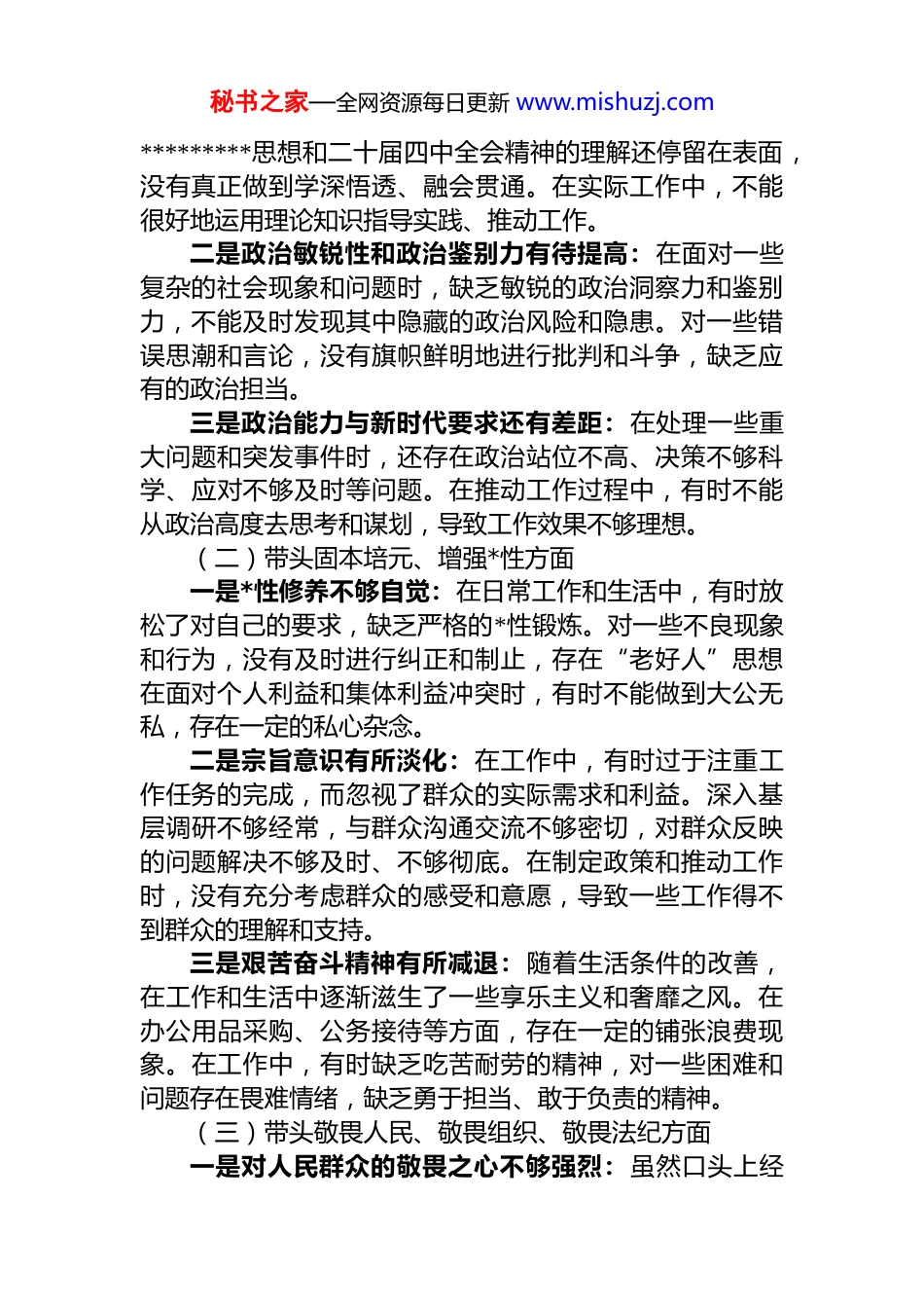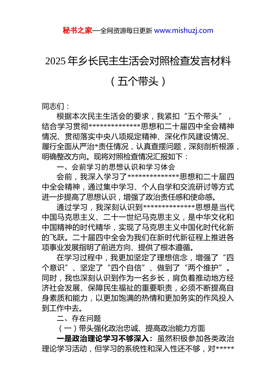 秘书之家—全网资源每日更新 www.mishuzj.com2025 年乡长民主生活会对照检查发言材料(五个带头)同志们:根据本次民主生活会的要求,我紧扣“五个带头”,结合学习贯彻**************思想和二十届四中全会精神情况、贯彻落实中央八项规定精神、深化作风建设情况、履行全面从严治*责任情况,认真查摆问题,深刻剖析根源,明确整改方向。现将对照检查情况汇报如下:一、会前学习的思想认识和学习体会会前,我深入学习了**************思想和二十届四中全会精神,通过集中学习、个人自学和交流研讨等方式进一步提高了思想认识,增强了政治责任感和使命感。通过学习,我深刻认识到**************思想是当代中国马克思主义、二十一世纪马克思主义,是中华文化和中国精神的时代精华,实现了马克思主义中国化时代化新的飞跃。二十届四中全会为我们在新时代新征程上推进各项事业发展指明了前进方向、提供了根本遵循。在学习过程中,我更加坚定了理想信念,增强了“四个意识”、坚定了“四个自信”、做到了“两个维护”。同时,我也深刻认识到作为一名乡长,肩负着推动地方经济社会发展、保障民生福祉的重要职责,必须不断提高自身素质和能力,以更加饱满的热情和更加务实的作风投入到工作中去。二、存在问题(一)带头强化政治忠诚、提高政治能力方面一是政治理论学习不够深入:虽然积极参加各类政治理论学习活动,但学习的系统性和深入性还不够,对*****秘书之家—全网资源每日更新 www.mishuzj.com*********思想和二十届四中全会精神的理解还停留在表面,没有真正做到学深悟透、融会贯通。在实际工作中,不能很好地运用理论知识指导实践、推动工作。二是政治敏锐性和政治鉴别力有待提高:在面对一些复杂的社会现象和问题时,缺乏敏锐的政治洞察力和鉴别力,不能及时发现其中隐藏的政治风险和隐患。对一些错误思潮和言论,没有旗帜鲜明地进行批判和斗争,缺乏应有的政治担当。三是政治能力与新时代要求还有差距:在处理一些重大问题和突发事件时,还存在政治站位不高、决策不够科学、应对不够及时等问题。在推动工作过程中,有时不能从政治高度去思考和谋划,导致工作效果不够理想。(二)带头固本培元、增强*性方面一是*性修养不够自觉:在日常工作和生活中,有时放松了对自己的要求,缺乏严格的*性锻炼。对一些不良现象和行为,没有及时进行纠正和制止,存在“老好人”思想在面对个人利益和集体利益冲突时,有时不能做到大公无私,存在一定的私心杂念。二是宗旨意识有所淡化:在工作中,有时过于注重工作任务的完成,而忽视了群众的实际需求和利益。深入基层调研不够经常,与群众沟通交流不够密切,对群众反映的问题解决不够及时、不够彻底。在制定政策和推动工作时,没有充分考虑群众的感受和意愿,导致一些工作得不到群众的理解和支持。三是艰苦奋斗精神有所减退:随着生活条件的改善,在工作和生活中逐渐滋生了一些享乐主义和奢靡之风。在办公用品采购、公务接待等方面,存在一定的铺张浪费现象。在工作中,有时缺乏吃苦耐劳的精神,对一些困难和问题存在畏难情绪,缺乏勇于担当、敢于负责的精神。(三)带头敬畏人民、敬畏组织、敬畏法纪方面一是对人民群众的敬畏之心不够强烈:虽然口头上经秘书之家—全网资源每日更新 www.mishuzj.com常强调要为人民服务,但在实际工作中,没有真正把人民群众放在心中最高位置。在处理一些涉及群众利益的问题时,有时不能做到公平公正,存在偏袒一方的现象。对群众的诉求和意见,没有给予足够的重视和回应,导致一些群众对政府工作不满意。二是对组织的纪律和规矩遵守不够严格:在工作中,有时存在自由主义思想,对组织的决定和安排不够坚决执行,存在打折扣、搞变通的现象。在*内组织生活中,有时不能严格按照规定要求参加,存在缺席、迟到等问题。对组织的纪律和规矩缺乏敬畏之心,没有真正做到心有所畏言有所戒、行有所止。三是对法律法规的学习和运用不够到位:虽然具备一定的法律意识,但对法律法规的学习还不够系统、不够深入,对一些新出台的法律法规了解不够及时。在实际工作中,有时不能严格按照法律法规的规定办事,存在执法不严、...