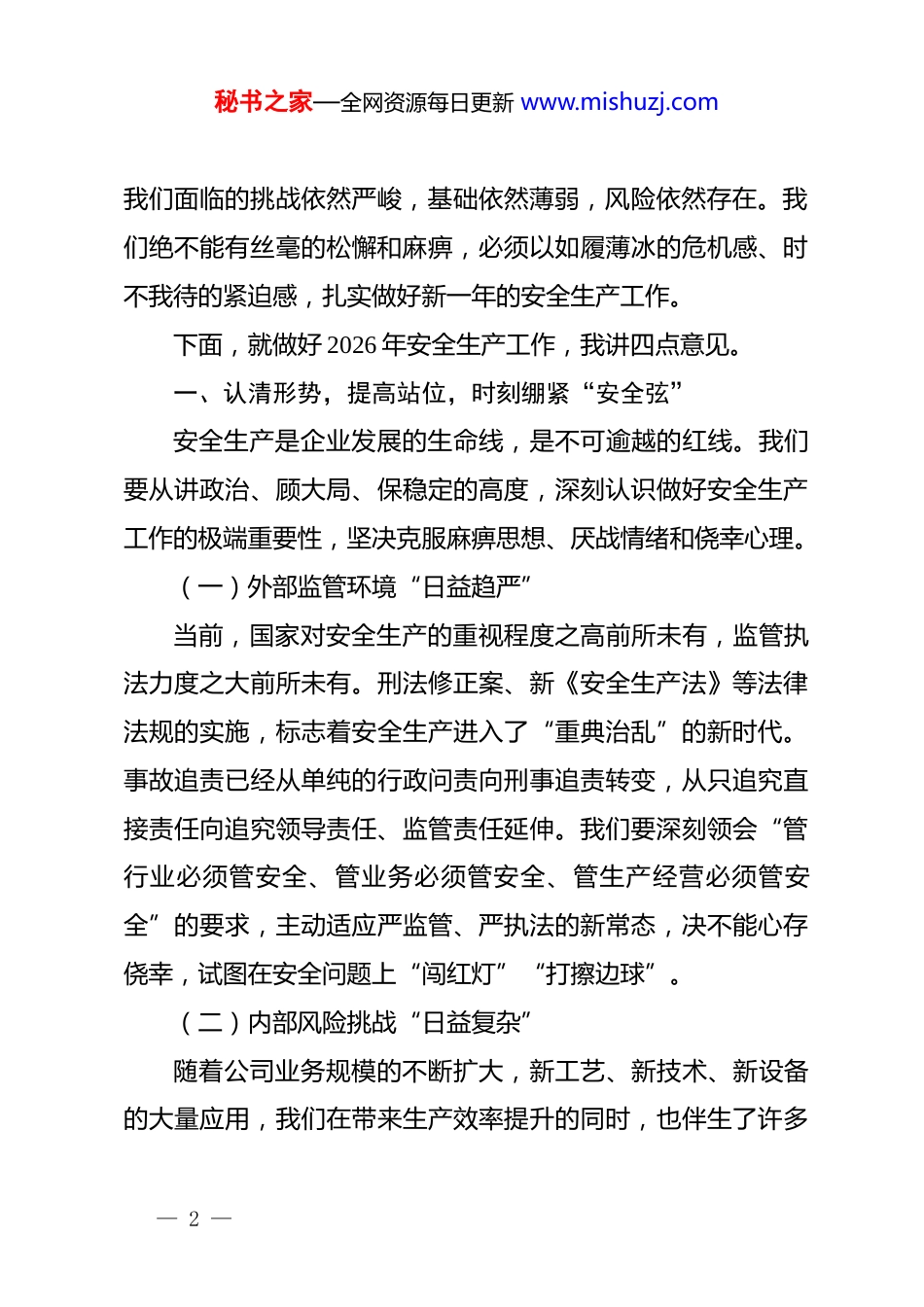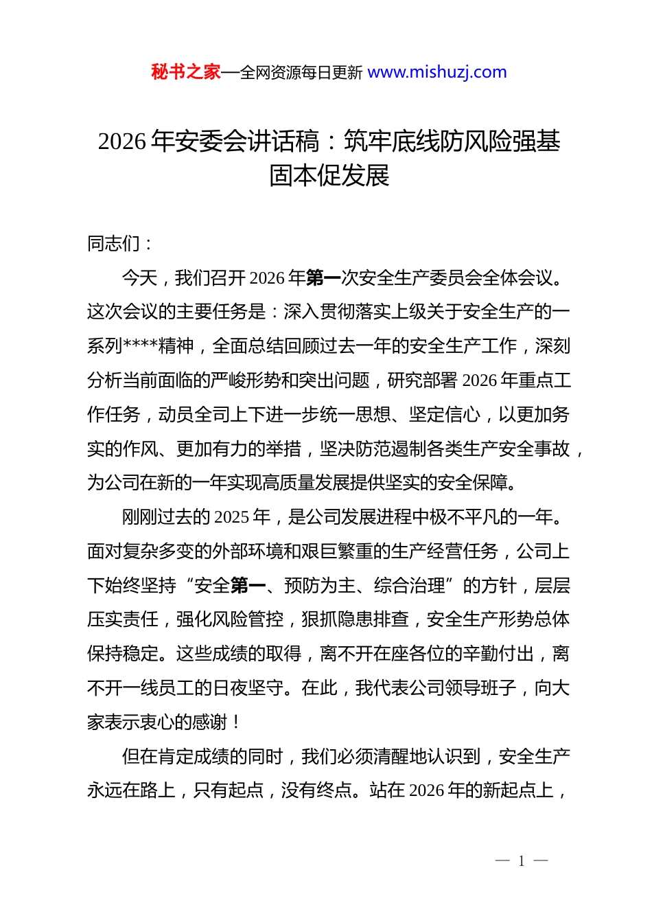 秘书之家—全网资源每日更新 www.mishuzj.com2026 年安委会讲话稿:筑牢底线防风险强基固本促发展同志们:今天,我们召开 2026 年第一次安全生产委员会全体会议。这次会议的主要任务是:深入贯彻落实上级关于安全生产的一系列****精神,全面总结回顾过去一年的安全生产工作,深刻分析当前面临的严峻形势和突出问题,研究部署 2026 年重点工作任务,动员全司上下进一步统一思想、坚定信心,以更加务实的作风、更加有力的举措,坚决防范遏制各类生产安全事故,为公司在新的一年实现高质量发展提供坚实的安全保障。刚刚过去的 2025 年,是公司发展进程中极不平凡的一年。面对复杂多变的外部环境和艰巨繁重的生产经营任务,公司上下始终坚持“安全第一、预防为主、综合治理”的方针,层层压实责任,强化风险管控,狠抓隐患排查,安全生产形势总体保持稳定。这些成绩的取得,离不开在座各位的辛勤付出,离不开一线员工的日夜坚守。在此,我代表公司领导班子,向大家表示衷心的感谢!但在肯定成绩的同时,我们必须清醒地认识到,安全生产永远在路上,只有起点,没有终点。站在 2026 年的新起点上,— 1 —秘书之家—全网资源每日更新 www.mishuzj.com我们面临的挑战依然严峻,基础依然薄弱,风险依然存在。我们绝不能有丝毫的松懈和麻痹,必须以如履薄冰的危机感、时不我待的紧迫感,扎实做好新一年的安全生产工作。下面,就做好 2026 年安全生产工作,我讲四点意见。一、认清形势,提高站位,时刻绷紧“安全弦”安全生产是企业发展的生命线,是不可逾越的红线。我们要从讲政治、顾大局、保稳定的高度,深刻认识做好安全生产工作的极端重要性,坚决克服麻痹思想、厌战情绪和侥幸心理。(一)外部监管环境“日益趋严”当前,国家对安全生产的重视程度之高前所未有,监管执法力度之大前所未有。刑法修正案、新《安全生产法》等法律法规的实施,标志着安全生产进入了“重典治乱”的新时代。事故追责已经从单纯的行政问责向刑事追责转变,从只追究直接责任向追究领导责任、监管责任延伸。我们要深刻领会“管行业必须管安全、管业务必须管安全、管生产经营必须管安全”的要求,主动适应严监管、严执法的新常态,决不能心存侥幸,试图在安全问题上“闯红灯”“打擦边球”。(二)内部风险挑战“日益复杂”随着公司业务规模的不断扩大,新工艺、新技术、新设备的大量应用,我们在带来生产效率提升的同时,也伴生了许多— 2 —秘书之家—全网资源每日更新 www.mishuzj.com未知的安全风险。老旧装置设施进入故障高发期,维护保养难度加大;部分新建项目工期紧、任务重,交叉作业多,现场管理难度增加。特别是随着数字化转型的推进,网络安全与生产安全的边界日益模糊,系统性风险隐患不容忽视。我们必须保持高度警觉,既要防范传统领域的“灰犀牛”,又要警惕新兴领域的“黑天鹅”,确保风险管控跑在隐患前面。(三)全员思想认识“仍有差距”我们在检查中发现,部分单位和部门对安全工作的重视还停留在口头上、文件中,存在“说起来重要、做起来次要、忙起来不要”的现象。有的管理人员存在“惯性思维”,习惯于凭经验办事,对新形势下的安全标准学习不够;有的一线员工存在“无知无畏”心理,违章操作、冒险作业屡禁不止。这种思想上的松懈是最大的隐患。我们必须清醒地看到,任何一起事故的发生,背后都是无数次违章和隐患的积累。必须坚决破除“事故不可避免论”和“安全影响效益论”,真正把安全理念植入灵魂、融入血液。二、正视问题,刀刃向内,坚决补齐“短板项”问题是时代的声音,也是工作的导向。回顾去年的工作,虽然我们没有发生较大以上事故,但险肇事故和未遂事件时有发生,暴露出我们在安全管理上还存在不少薄弱环节,必须引— 3 —秘书之家—全网资源每日更新 www.mishuzj.com起我们的高度重视。(一)责任落实存在“中梗阻”安全生产责任制落实不平衡、不到位的问题依然突出。在纵向上,存在“上热中温下冷”的现象,公司层面的决策部署到了基层往往大打折扣,出现了“层层递减”的效应;在横向上,部分职能部门认为安全是安环部门的事,存在“由于没人管...