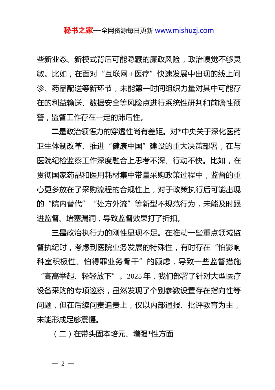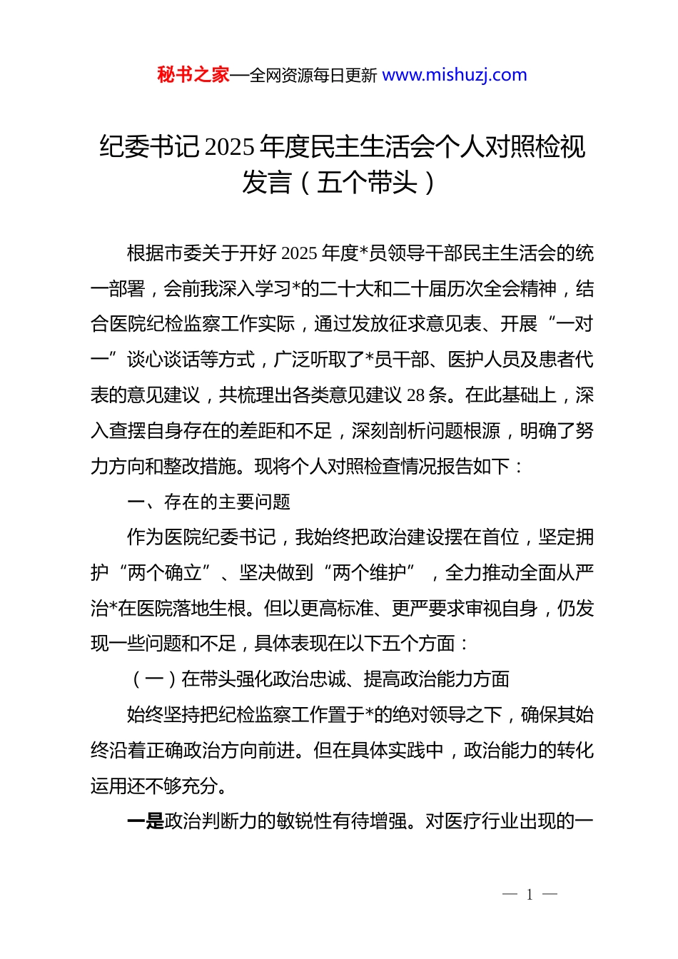 秘书之家—全网资源每日更新 www.mishuzj.com纪委书记 2025 年度民主生活会个人对照检视发言(五个带头)根据市委关于开好 2025 年度*员领导干部民主生活会的统一部署,会前我深入学习*的二十大和二十届历次全会精神,结合医院纪检监察工作实际,通过发放征求意见表、开展“一对一”谈心谈话等方式,广泛听取了*员干部、医护人员及患者代表的意见建议,共梳理出各类意见建议 28 条。在此基础上,深入查摆自身存在的差距和不足,深刻剖析问题根源,明确了努力方向和整改措施。现将个人对照检查情况报告如下:一、存在的主要问题作为医院纪委书记,我始终把政治建设摆在首位,坚定拥护“两个确立”、坚决做到“两个维护”,全力推动全面从严治*在医院落地生根。但以更高标准、更严要求审视自身,仍发现一些问题和不足,具体表现在以下五个方面:(一)在带头强化政治忠诚、提高政治能力方面始终坚持把纪检监察工作置于*的绝对领导之下,确保其始终沿着正确政治方向前进。但在具体实践中,政治能力的转化运用还不够充分。一是政治判断力的敏锐性有待增强。对医疗行业出现的一— 1 —秘书之家—全网资源每日更新 www.mishuzj.com些新业态、新模式背后可能隐藏的廉政风险,政治嗅觉不够灵敏。比如,在面对“互联网+医疗”快速发展中出现的线上问诊、药品配送等新环节,未能第一时间组织力量对其中可能存在的利益输送、数据安全等风险点进行系统性研判和前瞻性预警,监督工作存在一定的滞后性。二是政治领悟力的穿透性尚有差距。对*中央关于深化医药卫生体制改革、推进“健康中国”建设的重大决策部署,在与医院纪检监察工作深度融合上思考不深、行动不快。比如,在贯彻国家药品和医用耗材集中带量采购政策过程中,监督的重心更多放在了采购流程的合规性上,对于政策执行后可能出现的“院内替代”“处方外流”等新型不规范行为,未能及时跟进监督、堵塞漏洞,导致监督效果打了折扣。三是政治执行力的刚性显现不足。在推动一些重点领域监督执纪时,考虑到医院业务发展的特殊性,有时存在“怕影响科室积极性、怕得罪业务骨干”的顾虑,导致一些监督措施“高高举起、轻轻放下”。2025 年,我们部署了针对大型医疗设备采购的专项巡察,虽然发现了个别参数设置存在指向性等问题,但在后续问责追责上,仅以内部通报、批评教育为主,未能形成足够震慑。(二)在带头固本培元、增强*性方面— 2 —秘书之家—全网资源每日更新 www.mishuzj.com能够坚持参加*委理论学习中心组学习和所在支部组织生活,自觉加强*性修养。但对标新时代*员干部的标准,自我锤炼的“熔炉”温度还不够高。一是理论武装的“消化吸收”不够彻底。学习*的创新理论,有时满足于读原著、学原文,但在“内化于心、外化于行”上做得不够。比如,学习《论*的自我革命》时,虽然对其中的重要论述能够熟记,但如何将其精髓要义转化为破解医院内部“熟人社会”监督难题的有效方法,缺乏系统性思考和创造性实践,理论与实践存在“两张皮”现象。二是斗争精神的“锋芒锐气”有所钝化。面对医院内部一些根深蒂固的陈规陋习,如节假日收受“小红包”、接受药械代表宴请等“微腐败”问题,虽然三令五申、常抓不懈,但有时斗争的韧劲和狠劲不足,存在“抓一批、停一阵、又反弹”的循环。在处理一名资深专家违规接受宴请问题时,考虑到其业务权威和行业影响,在处理上有所保留,未能做到“一寸不让”。三是*性锤炼的“日常坚守”偶有松懈。在繁重的工作压力下,有时不自觉地将主要精力投入到案件查办、线索处置等“显性”工作上,对参加支部主题*日活动、与普通*员医生谈心谈话等“隐性”的*性锤炼有所放松。2025 年,因公务繁忙,— 3 —秘书之家—全网资源每日更新 www.mishuzj.com缺席了 2 次所在支部的组织生活会,反映出在处理业务工作和dj 活动关系上,统筹得还不够好。(三)在带头敬畏人民、敬畏组织、敬畏法纪方面始终牢记权力是*和人民赋予的,坚持秉公用权、依法用权、廉洁用权。但对照“三个敬畏”的更高要求,仍存在一些薄弱环节。一是敬畏人民的立场站得不够稳。虽然将整治群众身边腐败和不正之风作为工...