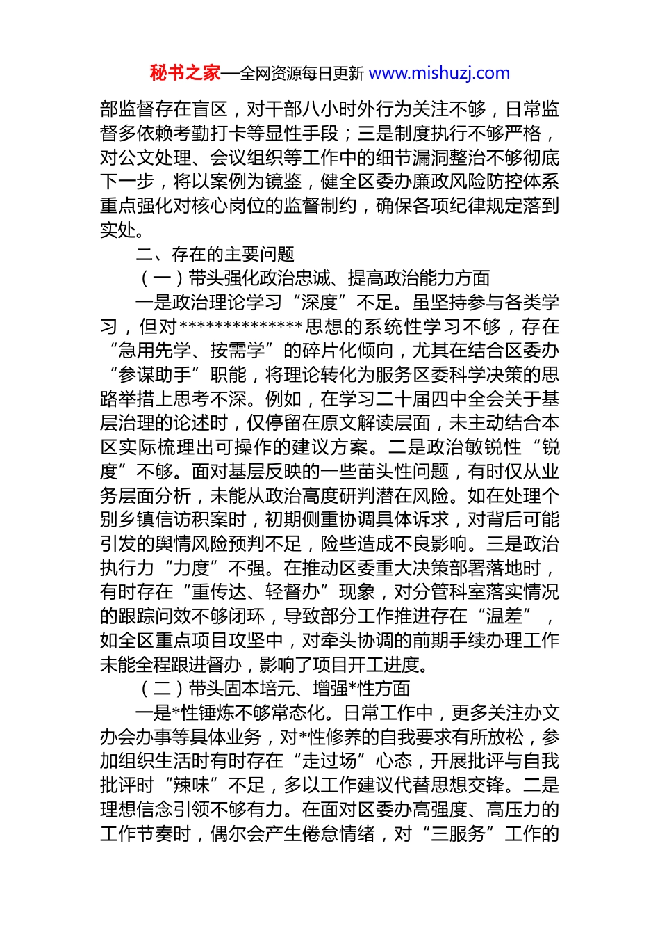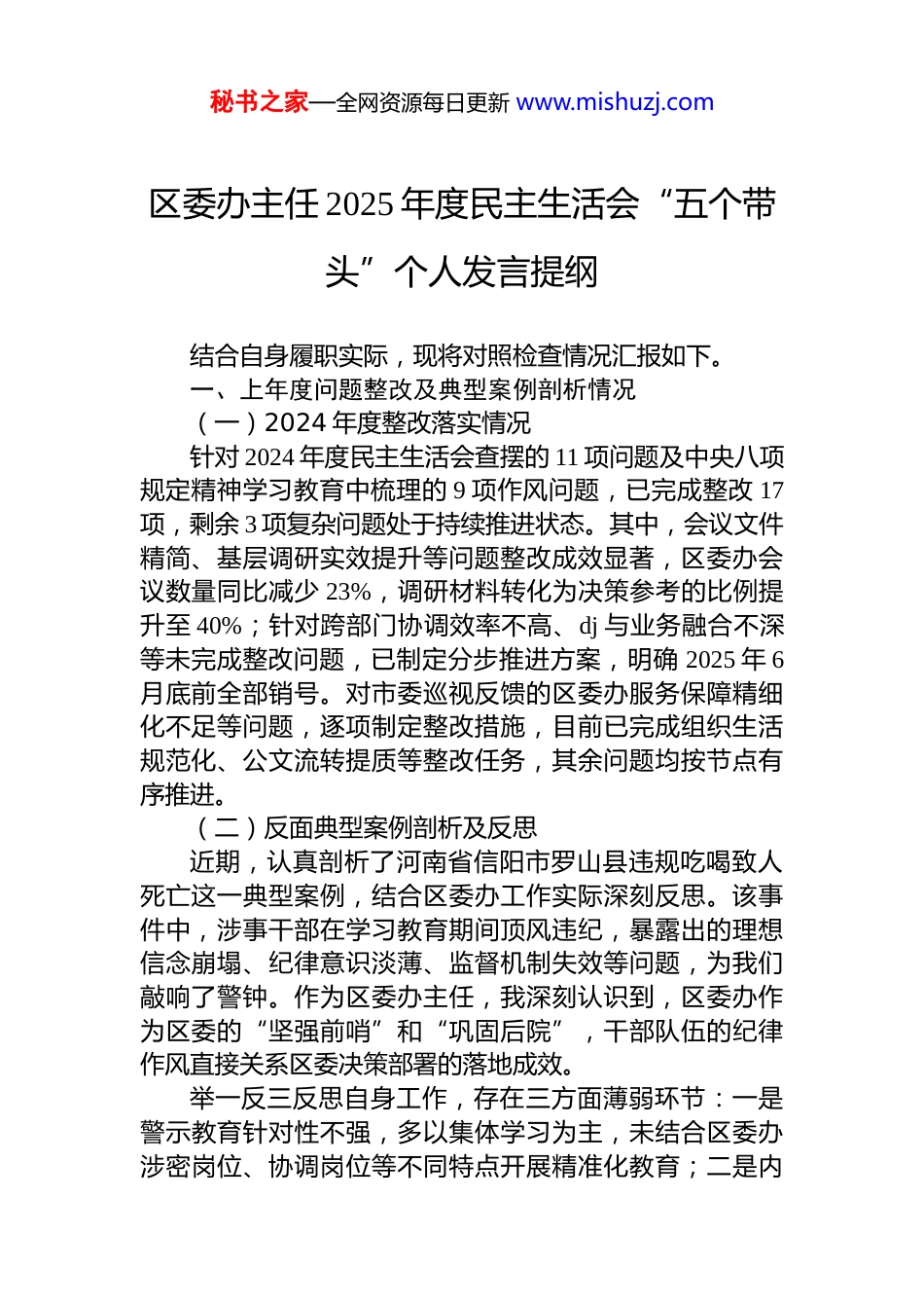 秘书之家—全网资源每日更新 www.mishuzj.com区委办主任 2025 年度民主生活会“五个带头”个人发言提纲结合自身履职实际,现将对照检查情况汇报如下。一、上年度问题整改及典型案例剖析情况(一)2024 年度整改落实情况针对 2024 年度民主生活会查摆的 11 项问题及中央八项规定精神学习教育中梳理的 9 项作风问题,已完成整改 17项,剩余 3 项复杂问题处于持续推进状态。其中,会议文件精简、基层调研实效提升等问题整改成效显著,区委办会议数量同比减少 23%,调研材料转化为决策参考的比例提升至 40%;针对跨部门协调效率不高、dj 与业务融合不深等未完成整改问题,已制定分步推进方案,明确 2025 年 6月底前全部销号。对市委巡视反馈的区委办服务保障精细化不足等问题,逐项制定整改措施,目前已完成组织生活规范化、公文流转提质等整改任务,其余问题均按节点有序推进。(二)反面典型案例剖析及反思近期,认真剖析了河南省信阳市罗山县违规吃喝致人死亡这一典型案例,结合区委办工作实际深刻反思。该事件中,涉事干部在学习教育期间顶风违纪,暴露出的理想信念崩塌、纪律意识淡薄、监督机制失效等问题,为我们敲响了警钟。作为区委办主任,我深刻认识到,区委办作为区委的“坚强前哨”和“巩固后院”,干部队伍的纪律作风直接关系区委决策部署的落地成效。举一反三反思自身工作,存在三方面薄弱环节:一是警示教育针对性不强,多以集体学习为主,未结合区委办涉密岗位、协调岗位等不同特点开展精准化教育;二是内秘书之家—全网资源每日更新 www.mishuzj.com部监督存在盲区,对干部八小时外行为关注不够,日常监督多依赖考勤打卡等显性手段;三是制度执行不够严格,对公文处理、会议组织等工作中的细节漏洞整治不够彻底下一步,将以案例为镜鉴,健全区委办廉政风险防控体系重点强化对核心岗位的监督制约,确保各项纪律规定落到实处。二、存在的主要问题(一)带头强化政治忠诚、提高政治能力方面一是政治理论学习“深度”不足。虽坚持参与各类学习,但对**************思想的系统性学习不够,存在“急用先学、按需学”的碎片化倾向,尤其在结合区委办“参谋助手”职能,将理论转化为服务区委科学决策的思路举措上思考不深。例如,在学习二十届四中全会关于基层治理的论述时,仅停留在原文解读层面,未主动结合本区实际梳理出可操作的建议方案。二是政治敏锐性“锐度”不够。面对基层反映的一些苗头性问题,有时仅从业务层面分析,未能从政治高度研判潜在风险。如在处理个别乡镇信访积案时,初期侧重协调具体诉求,对背后可能引发的舆情风险预判不足,险些造成不良影响。三是政治执行力“力度”不强。在推动区委重大决策部署落地时,有时存在“重传达、轻督办”现象,对分管科室落实情况的跟踪问效不够闭环,导致部分工作推进存在“温差”,如全区重点项目攻坚中,对牵头协调的前期手续办理工作未能全程跟进督办,影响了项目开工进度。(二)带头固本培元、增强*性方面一是*性锤炼不够常态化。日常工作中,更多关注办文办会办事等具体业务,对*性修养的自我要求有所放松,参加组织生活时有时存在“走过场”心态,开展批评与自我批评时“辣味”不足,多以工作建议代替思想交锋。二是理想信念引领不够有力。在面对区委办高强度、高压力的工作节奏时,偶尔会产生倦怠情绪,对“三服务”工作的秘书之家—全网资源每日更新 www.mishuzj.com使命感认识不够深刻,尤其在推进一些难度大的协调工作时,缺乏“啃硬骨头”的坚定信念。三是组织纪律执行不够严格。在落实区委值班值守制度时,有时因事务繁杂,未能严格执行“24 小时在岗带班”要求,存在临时顶岗、电话值守等变通情况,未能充分发挥示范带头作用。(三)带头敬畏人民、敬畏组织、敬畏法纪方面一是群众立场不够牢固。深入基层调研存在“走马观花”现象,有时提前安排路线、预设问题,与群众面对面交流不够深入,对基层干部群众反映的“急难愁盼”问题回应不够及时。如在开展“我为群众办实事”调研时,对社区反映的老旧小区改造资金缺口问题,仅记录在案未主动协调相关部门跟进,导致问题解决滞后。二...