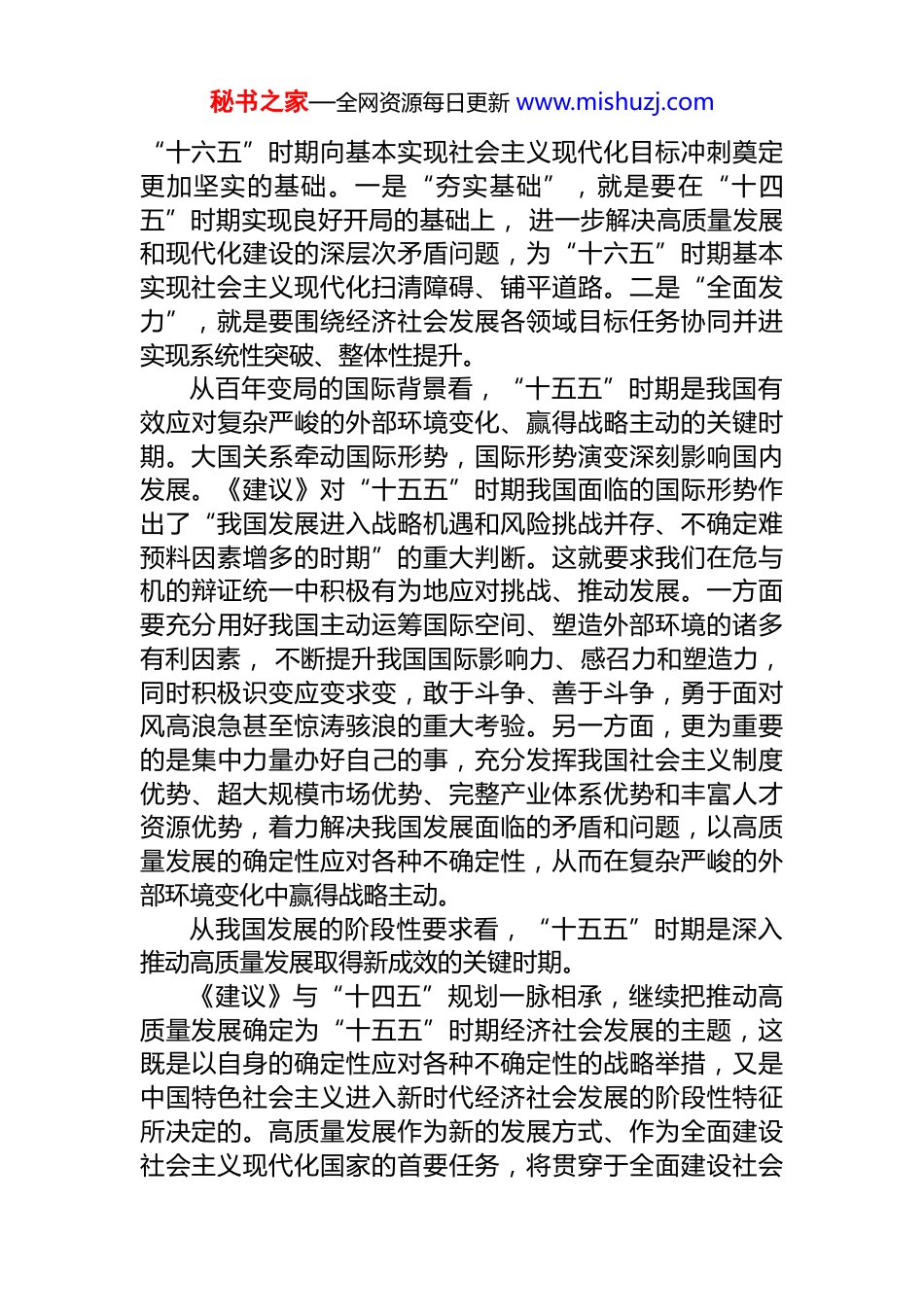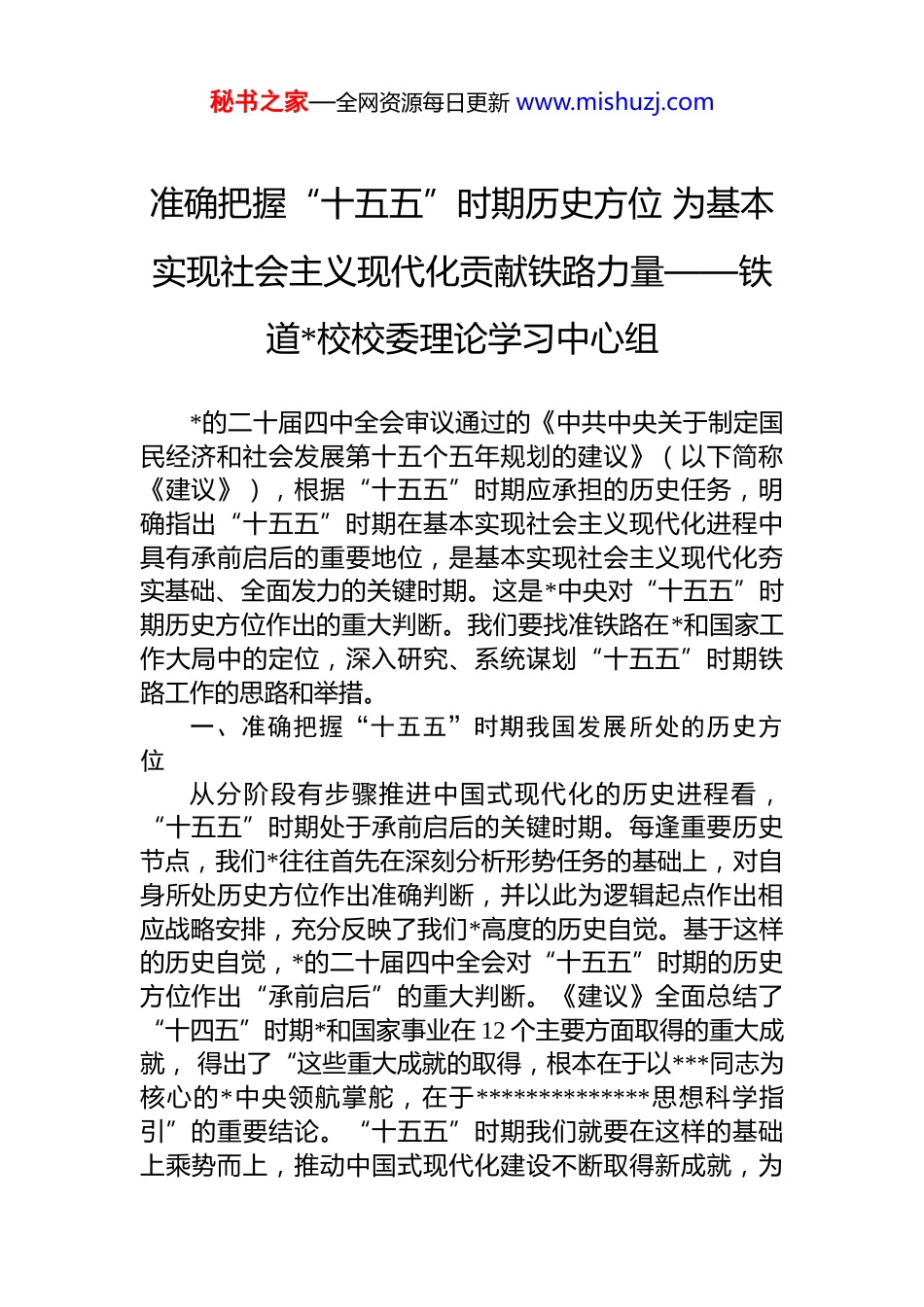 秘书之家—全网资源每日更新 www.mishuzj.com准确把握“十五五”时期历史方位 为基本实现社会主义现代化贡献铁路力量——铁道*校校委理论学习中心组*的二十届四中全会审议通过的《中共中央关于制定国民经济和社会发展第十五个五年规划的建议》(以下简称《建议》),根据“十五五”时期应承担的历史任务,明确指出“十五五”时期在基本实现社会主义现代化进程中具有承前启后的重要地位,是基本实现社会主义现代化夯实基础、全面发力的关键时期。这是*中央对“十五五”时期历史方位作出的重大判断。我们要找准铁路在*和国家工作大局中的定位,深入研究、系统谋划“十五五”时期铁路工作的思路和举措。一、准确把握“十五五”时期我国发展所处的历史方位从分阶段有步骤推进中国式现代化的历史进程看,“十五五”时期处于承前启后的关键时期。每逢重要历史节点,我们*往往首先在深刻分析形势任务的基础上,对自身所处历史方位作出准确判断,并以此为逻辑起点作出相应战略安排,充分反映了我们*高度的历史自觉。基于这样的历史自觉,*的二十届四中全会对“十五五”时期的历史方位作出“承前启后”的重大判断。《建议》全面总结了“十四五”时期*和国家事业在 12 个主要方面取得的重大成就, 得出了“这些重大成就的取得,根本在于以***同志为核心的*中央领航掌舵,在于**************思想科学指引”的重要结论。“十五五”时期我们就要在这样的基础上乘势而上,推动中国式现代化建设不断取得新成就,为秘书之家—全网资源每日更新 www.mishuzj.com“十六五”时期向基本实现社会主义现代化目标冲刺奠定更加坚实的基础。一是“夯实基础”,就是要在“十四五”时期实现良好开局的基础上, 进一步解决高质量发展和现代化建设的深层次矛盾问题,为“十六五”时期基本实现社会主义现代化扫清障碍、铺平道路。二是“全面发力”,就是要围绕经济社会发展各领域目标任务协同并进实现系统性突破、整体性提升。从百年变局的国际背景看,“十五五”时期是我国有效应对复杂严峻的外部环境变化、赢得战略主动的关键时期。大国关系牵动国际形势,国际形势演变深刻影响国内发展。《建议》对“十五五”时期我国面临的国际形势作出了“我国发展进入战略机遇和风险挑战并存、不确定难预料因素增多的时期”的重大判断。这就要求我们在危与机的辩证统一中积极有为地应对挑战、推动发展。一方面要充分用好我国主动运筹国际空间、塑造外部环境的诸多有利因素, 不断提升我国国际影响力、感召力和塑造力,同时积极识变应变求变,敢于斗争、善于斗争,勇于面对风高浪急甚至惊涛骇浪的重大考验。另一方面,更为重要的是集中力量办好自己的事,充分发挥我国社会主义制度优势、超大规模市场优势、完整产业体系优势和丰富人才资源优势,着力解决我国发展面临的矛盾和问题,以高质量发展的确定性应对各种不确定性,从而在复杂严峻的外部环境变化中赢得战略主动。从我国发展的阶段性要求看,“十五五”时期是深入推动高质量发展取得新成效的关键时期。《建议》与“十四五”规划一脉相承,继续把推动高质量发展确定为“十五五”时期经济社会发展的主题,这既是以自身的确定性应对各种不确定性的战略举措,又是中国特色社会主义进入新时代经济社会发展的阶段性特征所决定的。高质量发展作为新的发展方式、作为全面建设社会主义现代化国家的首要任务,将贯穿于全面建设社会秘书之家—全网资源每日更新 www.mishuzj.com主义现代化国家的全过程。这是我国保持经济持续健康发展的必然要求,是适应我国社会主要矛盾变化、全面建设社会主义现代化国家的必然要求,是遵循经济规律发展的必然要求。“十五五”时期能否在经济结构优化升级、现代产业体系建设中保持质的有效提升和量的合理增长,不仅关系“十五五”时期的发展成色,还关系着“十六五”时期经济能否保持持续健康发展。二、准确把握“十五五”时期铁路历史方位和向现代化铁路强国迈进的现实基础交通强国建设是社会主义现代化强国建设的重要内容,也是社会主义现代化强国建设的有力支撑。2020 年《新时代交通强国铁路先行规划纲要》提出到 2035 年率先建成...