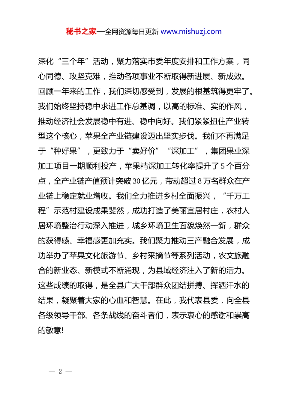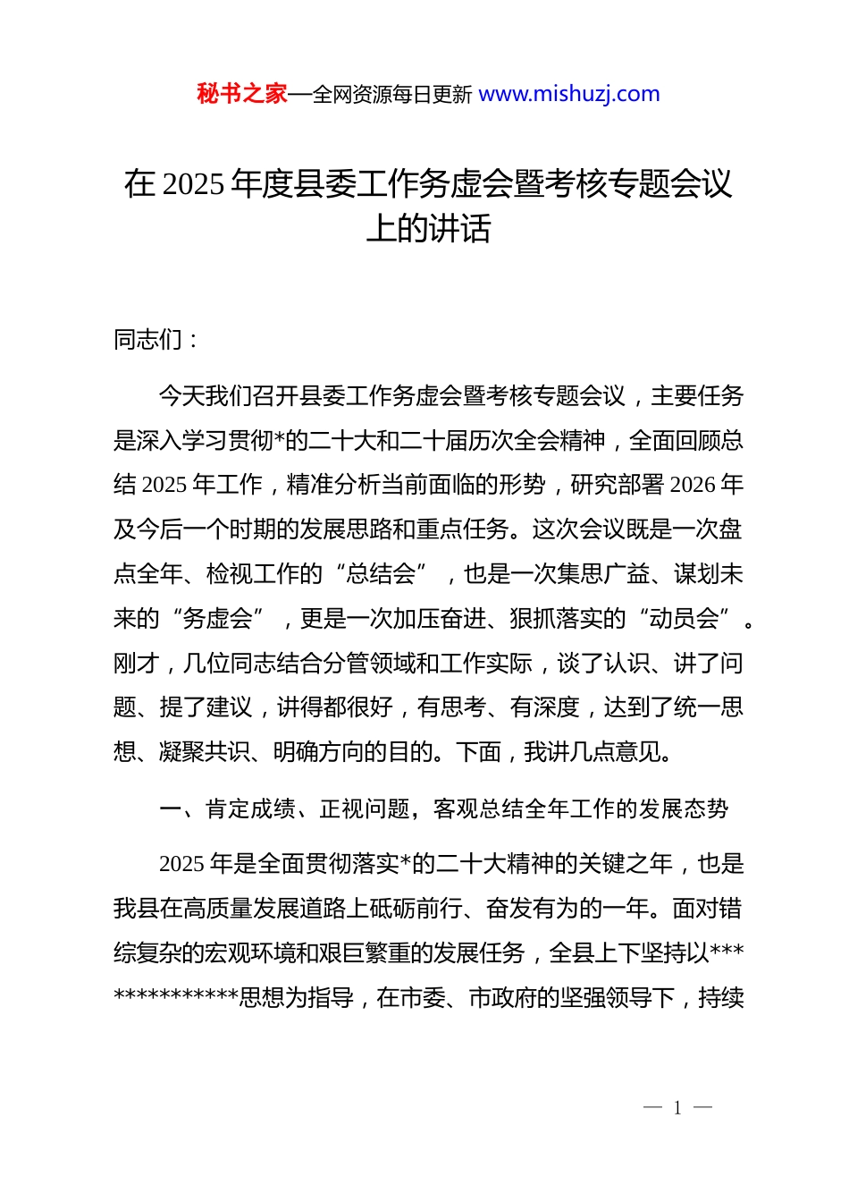 秘书之家—全网资源每日更新 www.mishuzj.com在 2025 年度县委工作务虚会暨考核专题会议上的讲话同志们:今天我们召开县委工作务虚会暨考核专题会议,主要任务是深入学习贯彻*的二十大和二十届历次全会精神,全面回顾总结 2025 年工作,精准分析当前面临的形势,研究部署 2026 年及今后一个时期的发展思路和重点任务。这次会议既是一次盘点全年、检视工作的“总结会”,也是一次集思广益、谋划未来的“务虚会”,更是一次加压奋进、狠抓落实的“动员会”。刚才,几位同志结合分管领域和工作实际,谈了认识、讲了问题、提了建议,讲得都很好,有思考、有深度,达到了统一思想、凝聚共识、明确方向的目的。下面,我讲几点意见。一、肯定成绩、正视问题,客观总结全年工作的发展态势2025 年是全面贯彻落实*的二十大精神的关键之年,也是我县在高质量发展道路上砥砺前行、奋发有为的一年。面对错综复杂的宏观环境和艰巨繁重的发展任务,全县上下坚持以**************思想为指导,在市委、市政府的坚强领导下,持续— 1 —秘书之家—全网资源每日更新 www.mishuzj.com深化“三个年”活动,聚力落实市委年度安排和工作方案,同心同德、攻坚克难,推动各项事业不断取得新进展、新成效。回顾一年来的工作,我们深切感受到,发展的根基筑得更牢了。我们始终坚持稳中求进工作总基调,以高的标准、实的作风,推动经济社会发展稳中有进、稳中向好。我们紧紧扭住产业转型这个核心,苹果全产业链建设迈出坚实步伐。我们不再满足于“种好果”,更致力于“卖好价”“深加工”,集团果业深加工项目一期顺利投产,苹果精深加工转化率提升了 5 个百分点,全产业链产值预计突破 30 亿元,带动超过 8 万名群众在产业链上稳定就业增收。我们全力推进乡村全面振兴,“千万工程”示范村建设成果斐然,成功打造了美丽宜居村庄,农村人居环境整治行动深入推进,城乡环境卫生面貌焕然一新,群众的获得感、幸福感更加充实。我们聚力推动三产融合发展,成功举办了苹果文化旅游节、乡村采摘节等系列活动,农文旅融合的新业态、新模式不断涌现,为县域经济注入了新的活力。这些成绩的取得,是全县广大干部群众团结拼搏、挥洒汗水的结果,凝聚着大家的心血和智慧。在此,我代表县委,向全县各级领导干部、各条战线的奋斗者们,表示衷心的感谢和崇高的敬意!— 2 —秘书之家—全网资源每日更新 www.mishuzj.com在肯定成绩的同时,我们更要清醒地认识到工作中存在的短板和不足。比如,经济总量不大、结构不优的问题依然突出,新的增长点培育尚需时日;部分干部思想解放程度不够,创新意识、担当精神有待加强;项目谋划的前瞻性、精准性还需提升,大项目、好项目储备不足;民生领域还有不少欠账,教育、医疗、养老等公共服务供给与群众期盼还有差距。对于这些问题,我们必须高度重视,以勇于直面问题、敢于较真碰硬的态度,在今后的工作中切实加以解决。二、认清形势、抢抓机遇,准确把握未来发展的方向路径同志们,2026 年是“十五五”规划的开局之年,做好明年的工作,对于我们开好局、起好步至关重要。我们要胸怀“国之大者”,善于在全国、全省、全市的发展大局中找准*的定位,进一步把思想和行动统一到*中央对形势的科学判断和决策部署上来,统一到省市工作的具体要求上来。从宏观形势看,机遇与挑战并存。一方面,国家持续加大对中西部地区、革命老区的支持力度,黄河流域生态保护和高质量发展、新时代推进西部大开发形成新格局等国家战略深入实施,为我们争取政策、项目和资金支持创造了有利条件。另一方面,外部环境的复杂性、严峻性、不确定性上升,经济恢— 3 —秘书之家—全网资源每日更新 www.mishuzj.com复的基础尚不牢固,区域竞争日趋激烈。我们必须增强机遇意识和风险意识,既要看到有利条件,坚定发展信心;也要正视困难挑战,做好充分准备。立足*自身,我们有基础、有优势,更有责任、有担当。经过多年的发展,我县的苹果产业已经形成了规模优势和品牌效应,这是我们最大的家底和底气。我们的干部队伍经过多项重大任务的考验,政治坚定、作风扎实,这是我们干事创业的根本保...