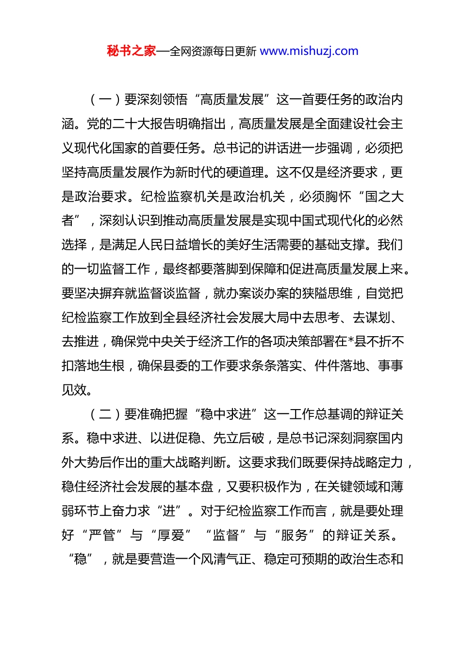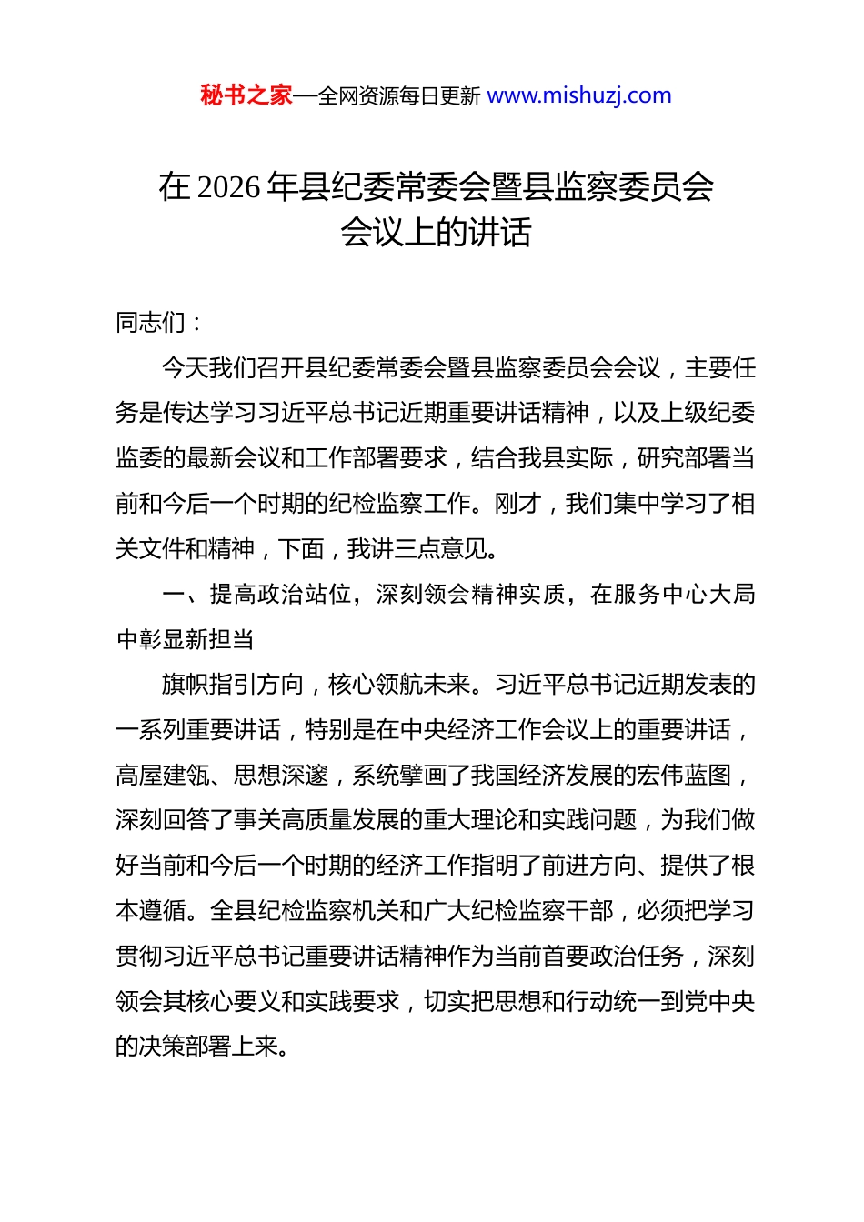 秘书之家—全网资源每日更新 www.mishuzj.com在 2026 年县纪委常委会暨县监察委员会会议上的讲话 同志们:今天我们召开县纪委常委会暨县监察委员会会议,主要任务是传达学习习近平总书记近期重要讲话精神,以及上级纪委监委的最新会议和工作部署要求,结合我县实际,研究部署当前和今后一个时期的纪检监察工作。刚才,我们集中学习了相关文件和精神,下面,我讲三点意见。一、提高政治站位,深刻领会精神实质,在服务中心大局中彰显新担当旗帜指引方向,核心领航未来。习近平总书记近期发表的一系列重要讲话,特别是在中央经济工作会议上的重要讲话,高屋建瓴、思想深邃,系统擘画了我国经济发展的宏伟蓝图,深刻回答了事关高质量发展的重大理论和实践问题,为我们做好当前和今后一个时期的经济工作指明了前进方向、提供了根本遵循。全县纪检监察机关和广大纪检监察干部,必须把学习贯彻习近平总书记重要讲话精神作为当前首要政治任务,深刻领会其核心要义和实践要求,切实把思想和行动统一到党中央的决策部署上来。秘书之家—全网资源每日更新 www.mishuzj.com(一)要深刻领悟“高质量发展”这一首要任务的政治内涵。党的二十大报告明确指出,高质量发展是全面建设社会主义现代化国家的首要任务。总书记的讲话进一步强调,必须把坚持高质量发展作为新时代的硬道理。这不仅是经济要求,更是政治要求。纪检监察机关是政治机关,必须胸怀“国之大者”,深刻认识到推动高质量发展是实现中国式现代化的必然选择,是满足人民日益增长的美好生活需要的基础支撑。我们的一切监督工作,最终都要落脚到保障和促进高质量发展上来。要坚决摒弃就监督谈监督,就办案谈办案的狭隘思维,自觉把纪检监察工作放到全县经济社会发展大局中去思考、去谋划、去推进,确保党中央关于经济工作的各项决策部署在*县不折不扣落地生根,确保县委的工作要求条条落实、件件落地、事事见效。(二)要准确把握“稳中求进”这一工作总基调的辩证关系。稳中求进、以进促稳、先立后破,是总书记深刻洞察国内外大势后作出的重大战略判断。这要求我们既要保持战略定力,稳住经济社会发展的基本盘,又要积极作为,在关键领域和薄弱环节上奋力求“进”。对于纪检监察工作而言,就是要处理好“严管”与“厚爱”“监督”与“服务”的辩证关系。“稳”,就是要营造一个风清气正、稳定可预期的政治生态和秘书之家—全网资源每日更新 www.mishuzj.com发展环境,让广大干部敢于担当、积极作为,让市场主体安心经营、放心投资。“进”,就是要聚焦影响高质量发展的堵点、痛点、难点问题,敢于斗争、善于斗争,坚决清除阻碍改革发展的“绊脚石”和“拦路虎”。我们要通过精准有效的监督执纪,惩治腐败、弘扬正气,既要释放“越往后执纪越严”的强烈信号,也要旗帜鲜明地为敢于担当、踏实做事的干部撑腰鼓劲,真正实现政治效果、纪法效果、社会效果的有机统一。(三)要全面贯彻“人民至上”这一根本立场的价值追求总书记反复强调,要坚持以人民为中心的发展思想。经济发展的最终目的,是为了不断增进民生福祉。纪检监察工作的出发点和落脚点,同样是为了维护好、实现好、发展好最广大人民的根本利益。我们要始终坚持人民群众反对什么、痛恨什么,就坚决防范和纠正什么。要紧紧围绕就业、教育、医疗、养老、住房等群众急难愁盼问题,深入开展民生领域专项整治,严肃查处贪污侵占、截留挪用、虚报冒头、优亲厚友等行为,让人民群众在反腐倡廉中有更多的获得感、幸福感、安全感。要推动监督下沉、监督落地,深入田间地头、工厂车间、项目一线,倾听群众呼声,了解群众诉求,用监督执纪的实际成效守护好民心这个最大的政治。二、聚焦主责主业,精准监督执纪问责,在护航经济发展秘书之家—全网资源每日更新 www.mishuzj.com中展现新作为纪检监察机关是推动党中央决策部署贯彻落实的重要力量护航经济社会高质量发展是我们的天职。我们要紧紧围绕县委确定的中心工作,找准履职尽责的切入点和着力点,以精准有力的监督,保障全县经济航船行稳致远。特别是要聚焦县委提出的“八大重点任务”,实施靶向监督、跟进监督、全程监督。...