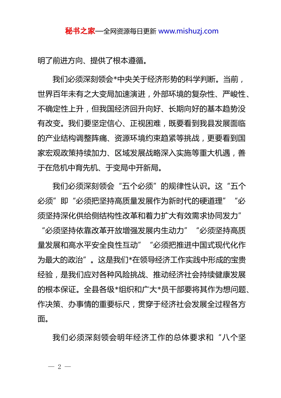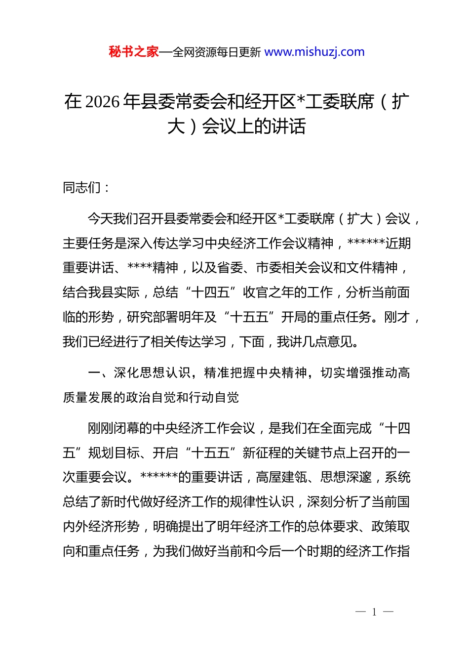 秘书之家—全网资源每日更新 www.mishuzj.com在 2026 年县委常委会和经开区*工委联席(扩大)会议上的讲话同志们:今天我们召开县委常委会和经开区*工委联席(扩大)会议,主要任务是深入传达学习中央经济工作会议精神,******近期重要讲话、****精神,以及省委、市委相关会议和文件精神,结合我县实际,总结“十四五”收官之年的工作,分析当前面临的形势,研究部署明年及“十五五”开局的重点任务。刚才,我们已经进行了相关传达学习,下面,我讲几点意见。一、深化思想认识,精准把握中央精神,切实增强推动高质量发展的政治自觉和行动自觉刚刚闭幕的中央经济工作会议,是我们在全面完成“十四五”规划目标、开启“十五五”新征程的关键节点上召开的一次重要会议。******的重要讲话,高屋建瓴、思想深邃,系统总结了新时代做好经济工作的规律性认识,深刻分析了当前国内外经济形势,明确提出了明年经济工作的总体要求、政策取向和重点任务,为我们做好当前和今后一个时期的经济工作指— 1 —秘书之家—全网资源每日更新 www.mishuzj.com明了前进方向、提供了根本遵循。我们必须深刻领会*中央关于经济形势的科学判断。当前,世界百年未有之大变局加速演进,外部环境的复杂性、严峻性、不确定性上升,但我国经济回升向好、长期向好的基本趋势没有改变。我们要坚定信心、正视困难,既要看到我县发展面临的产业结构调整阵痛、资源环境约束趋紧等挑战,更要看到国家宏观政策持续加力、区域发展战略深入实施等重大机遇,善于在危机中育先机、于变局中开新局。我们必须深刻领会“五个必须”的规律性认识。这“五个必须”即“必须把坚持高质量发展作为新时代的硬道理”“必须坚持深化供给侧结构性改革和着力扩大有效需求协同发力”“必须坚持依靠改革开放增强发展内生动力”“必须坚持高质量发展和高水平安全良性互动”“必须把推进中国式现代化作为最大的政治”。这是我们*在领导经济工作实践中形成的宝贵经验,是我们应对各种风险挑战、推动经济社会持续健康发展的根本保证。全县各级*组织和广大*员干部要将其作为想问题、作决策、办事情的重要标尺,贯穿于经济社会发展全过程各方面。我们必须深刻领会明年经济工作的总体要求和“八个坚— 2 —秘书之家—全网资源每日更新 www.mishuzj.com持”的重点任务。中央明确提出要坚持稳中求进、以进促稳、先立后破的总基调,并围绕科技创新、内需扩大、深化改革、农业发展、城乡融合、绿色转型、民生保障等方面作出了系统部署。我们要逐条逐项对标对表,结合*县的资源禀赋、产业基础和发展阶段,找准工作的切入点和突破口,精心谋划一批支撑性强、带动性大的项目和抓手,确保中央和省委、市委的决策部署在*落地生根、开花结果。二、全面复盘“十四五”,客观总结成绩与不足,在承前启后中坚定高质量发展的信心和决心今天我们正处在 2025 年的岁末,这也是“十四五”规划的收官之年。回望过去五年,我们面对复杂严峻的外部环境和艰巨繁重的改革发展稳定任务,在*中央和省委、市委的坚强领导下,团结带领全县人民攻坚克难、砥砺奋进,推动经济社会发展取得了来之不易的成绩。五年来,我们的综合实力迈上了新台阶。全县地区生产总值、固定资产投资、一般公共预算收入等主要经济指标保持了平稳增长,发展的质量和效益稳步提升。产业转型升级取得了新突破。我们坚持工业强县战略不动摇,以*经开区为主阵地,大力发展新材料、先进装备制造等主导产业,传统磷化工产业— 3 —秘书之家—全网资源每日更新 www.mishuzj.com绿色化、精细化水平显著提高,初步构建了具有*特色的现代产业体系。城乡面貌发生了新变化。交通、水利、能源等基础设施网络日趋完善,城市更新行动有序推进,美丽乡村建设亮点纷呈,城乡融合发展迈出坚实步伐。民生福祉得到了新改善。我们始终坚持以人民为中心的发展思想,每年集中力量办好一批民生实事,脱贫攻坚成果持续巩固,乡村振兴全面推进,教育、医疗、养老、社保等公共服务体系更加健全,人民群众的获得感、幸福感、安全感不断增强。*的建设实现了新加强。我们纵深推进全面从严治*,持续深化作风建设,干部...