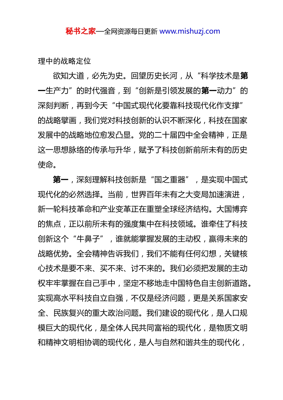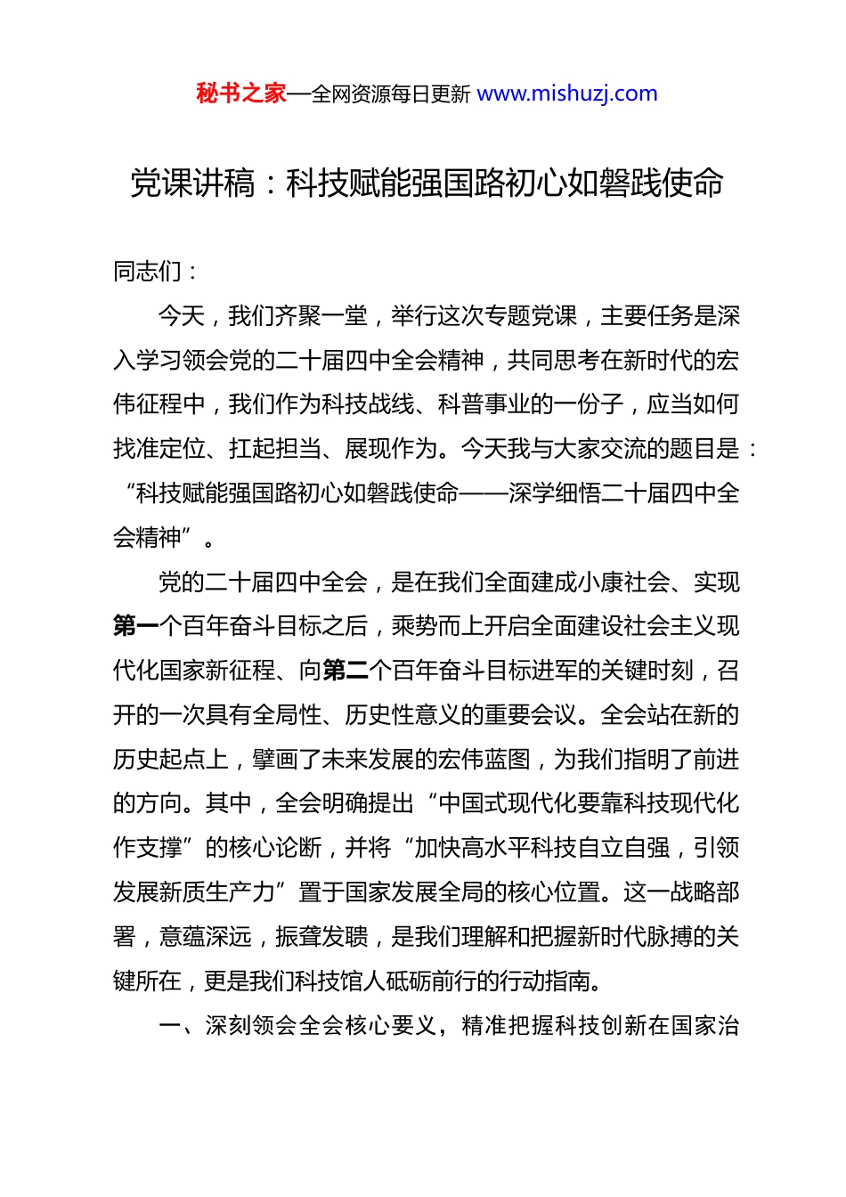 秘书之家—全网资源每日更新 www.mishuzj.com党课讲稿:科技赋能强国路初心如磐践使命 同志们:今天,我们齐聚一堂,举行这次专题党课,主要任务是深入学习领会党的二十届四中全会精神,共同思考在新时代的宏伟征程中,我们作为科技战线、科普事业的一份子,应当如何找准定位、扛起担当、展现作为。今天我与大家交流的题目是:“科技赋能强国路初心如磐践使命——深学细悟二十届四中全会精神”。党的二十届四中全会,是在我们全面建成小康社会、实现第一个百年奋斗目标之后,乘势而上开启全面建设社会主义现代化国家新征程、向第二个百年奋斗目标进军的关键时刻,召开的一次具有全局性、历史性意义的重要会议。全会站在新的历史起点上,擘画了未来发展的宏伟蓝图,为我们指明了前进的方向。其中,全会明确提出“中国式现代化要靠科技现代化作支撑”的核心论断,并将“加快高水平科技自立自强,引领发展新质生产力”置于国家发展全局的核心位置。这一战略部署,意蕴深远,振聋发聩,是我们理解和把握新时代脉搏的关键所在,更是我们科技馆人砥砺前行的行动指南。一、深刻领会全会核心要义,精准把握科技创新在国家治秘书之家—全网资源每日更新 www.mishuzj.com理中的战略定位欲知大道,必先为史。回望历史长河,从“科学技术是第一生产力”的时代强音,到“创新是引领发展的第一动力”的深刻判断,再到今天“中国式现代化要靠科技现代化作支撑”的战略擘画,我们党对科技创新的认识不断深化,科技在国家发展中的战略地位愈发凸显。党的二十届四中全会精神,正是这一思想脉络的传承与升华,赋予了科技创新前所未有的历史使命。第一,深刻理解科技创新是“国之重器”,是实现中国式现代化的必然选择。当前,世界百年未有之大变局加速演进,新一轮科技革命和产业变革正在重塑全球经济结构。大国博弈的焦点,正以前所未有的强度集中在科技领域。谁牵住了科技创新这个“牛鼻子”,谁就能掌握发展的主动权,赢得未来的战略优势。全会精神告诉我们,我们不能有任何幻想,关键核心技术是要不来、买不来、讨不来的。我们必须把发展的主动权牢牢掌握在自己手中,坚定不移地走中国特色自主创新道路。实现高水平科技自立自强,不仅是经济问题,更是关系国家安全、民族复兴的重大政治问题。我们建设的现代化,是人口规模巨大的现代化,是全体人民共同富裕的现代化,是物质文明和精神文明相协调的现代化,是人与自然和谐共生的现代化,秘书之家—全网资源每日更新 www.mishuzj.com是走和平发展道路的现代化。这五大特征,无一不依赖于强大的科技实力作为支撑。没有科技的现代化,就没有高质量发展的坚实基础,就没有国家治理体系和治理能力现代化的有力保障。第二,深刻理解新质生产力是“核心引擎”,是推动高质量发展的内在要求。全会强调“引领发展新质生产力”,这是一个具有划时代意义的重大理论创新。新质生产力,其特点是创新,关键在质优,本质是先进生产力。它摆脱了传统经济增长方式、生产力发展路径,是由技术革命性突破、生产要素创新性配置、产业深度转型升级而催生的。从人工智能、量子信息,到生物制造、商业航天,再到低空经济、新材料等战略性新兴产业和未来产业,这些都是新质生产力的具体体现。发展新质生产力,就是要摆脱对传统要素投入的依赖,转向依靠科技创新驱动,实现发展动能的根本转换。这要求我们必须加强基础研究,打好关键核心技术攻坚战,促进科技成果加快转化为现实生产力,为经济社会发展注入源源不断的新动能。第三,深刻理解“三位一体”是“战略基石”,是建设科技强国的系统布局。全会精神与党的二十大报告一脉相承,持续强调了将教育、科技、人才作为一个有机整体统筹推进的极端重要性。教育是基础,为科技创新提供源源不断的人才供给;秘书之家—全网资源每日更新 www.mishuzj.com科技是核心,是推动经济社会发展的根本动力;人才是第一资源,是科技创新的主体和决定性力量。三者相互依存、相互促进,共同构成了支撑国家现代化的战略基石。我们必须坚持教育优先发展、科技自立自强、人才引领驱动,一体化部署,一体化推进。这不仅要求我们在国家层面...