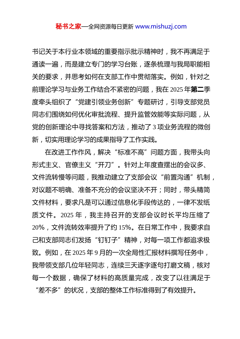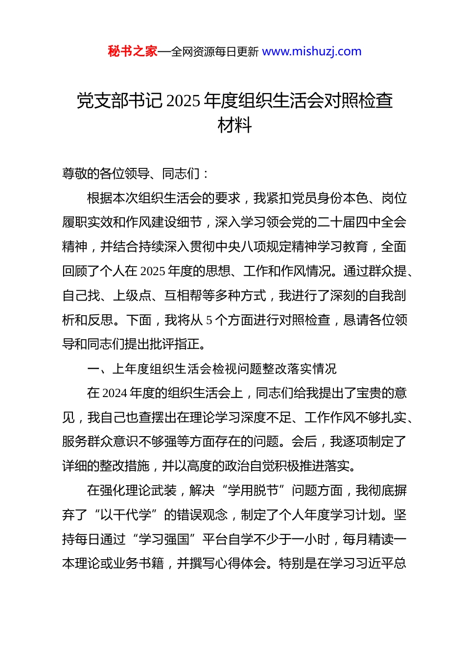秘书之家—全网资源每日更新 www.mishuzj.com党支部书记 2025 年度组织生活会对照检查材料 尊敬的各位领导、同志们:根据本次组织生活会的要求,我紧扣党员身份本色、岗位履职实效和作风建设细节,深入学习领会党的二十届四中全会精神,并结合持续深入贯彻中央八项规定精神学习教育,全面回顾了个人在 2025 年度的思想、工作和作风情况。通过群众提、自己找、上级点、互相帮等多种方式,我进行了深刻的自我剖析和反思。下面,我将从 5 个方面进行对照检查,恳请各位领导和同志们提出批评指正。一、上年度组织生活会检视问题整改落实情况在 2024 年度的组织生活会上,同志们给我提出了宝贵的意见,我自己也查摆出在理论学习深度不足、工作作风不够扎实、服务群众意识不够强等方面存在的问题。会后,我逐项制定了详细的整改措施,并以高度的政治自觉积极推进落实。在强化理论武装,解决“学用脱节”问题方面,我彻底摒弃了“以干代学”的错误观念,制定了个人年度学习计划。坚持每日通过“学习强国”平台自学不少于一小时,每月精读一本理论或业务书籍,并撰写心得体会。特别是在学习习近平总秘书之家—全网资源每日更新 www.mishuzj.com书记关于本行业本领域的重要指示批示精神时,我不再满足于通读一遍,而是建立专门的学习台账,逐条梳理与我局职能相关的要求,并思考如何在支部工作中贯彻落实。例如,针对之前理论学习与业务工作结合不紧密的问题,我在 2025 年第二季度牵头组织了“党建引领业务创新”专题研讨,引导支部党员同志们围绕如何优化审批流程、提升监管效能等实际问题,从党的创新理论中寻找答案和方法,推动了 3 项业务流程的微创新,切实用理论学习的成果指导了工作实践。在改进工作作风,解决“标准不高”问题方面,我带头向形式主义、官僚主义“开刀”。针对上年度查摆出的会议多、文件流转慢等问题,我推动建立了支部会议“前置沟通”机制,对议题不明确、准备不充分的会议坚决不开;同时,带头精简文件材料,要求凡是可以通过信息化手段传达的,一律不发纸质文件。2025 年,我主持召开的支部会议时长平均压缩了20%,文件流转效率提升了约 15%。在日常工作中,我要求自己和支部同志们发扬“钉钉子”精神,对每一项工作都追求极致。例如,在 2025 年 9 月的一次全局性汇报材料撰写任务中,我带领支部几位年轻同志,连续三天逐字逐句打磨文稿,核对每一个数据,确保了材料的高质量完成,改变了以往满足于“差不多”的状况,支部的整体工作标准得到了有效提升。秘书之家—全网资源每日更新 www.mishuzj.com在增强宗旨意识,解决“服务不优”问题方面,我将“群众满意不满意”作为检验工作的根本标准。我为自己设立了“基层联系日”,每季度至少利用两个工作日,不打招呼、不定路线,深入企业、社区和基层站所,与一线工作人员和办事群众面对面交流。在 2025 年的一次走访中,我了解到有几家小微企业对某项惠企政策的申报流程不清楚,反复跑了几次都未能成功办理。我立即将此问题带回局里,并协调相关业务科室,在三天内制作了图文并茂、通俗易懂的“申报流程一张图”,并通过我局微信公众号和窗口服务单位精准推送,受到了企业主的一致好评。一年来,我通过走访调研,累计收集群众和企业反映的问题 11 个,已协调解决 9 个。截至目前,2024 年度查摆出的 6 个问题已完成整改 5 个,整改完成率为 83.3%,尚未完成整改的 1 个问题正在积极推进,并已列入我 2026 年的重点工作任务,计划于 2026 年 6 月前取得阶段性成果。通过一年的整改,我个人在思想认识、工作能力和服务水平等方面均取得了进步,但我也清醒地认识到,作风建设永远在路上,必须持续巩固整改成果,不断自我提升。二、当前存在的突出问题对照党员义务和权利,对照新时代合格党员标准,对照党的二十届四中全会精神和中央八项规定精神要求,我感到自身秘书之家—全网资源每日更新 www.mishuzj.com仍存在不少差距和不足,具体表现在以下五个方面。(一)对照贯彻党的创新理论方面。一是将宏大理论转化为微观实践的思路不够开阔。学习党的二十届四中全会精神...