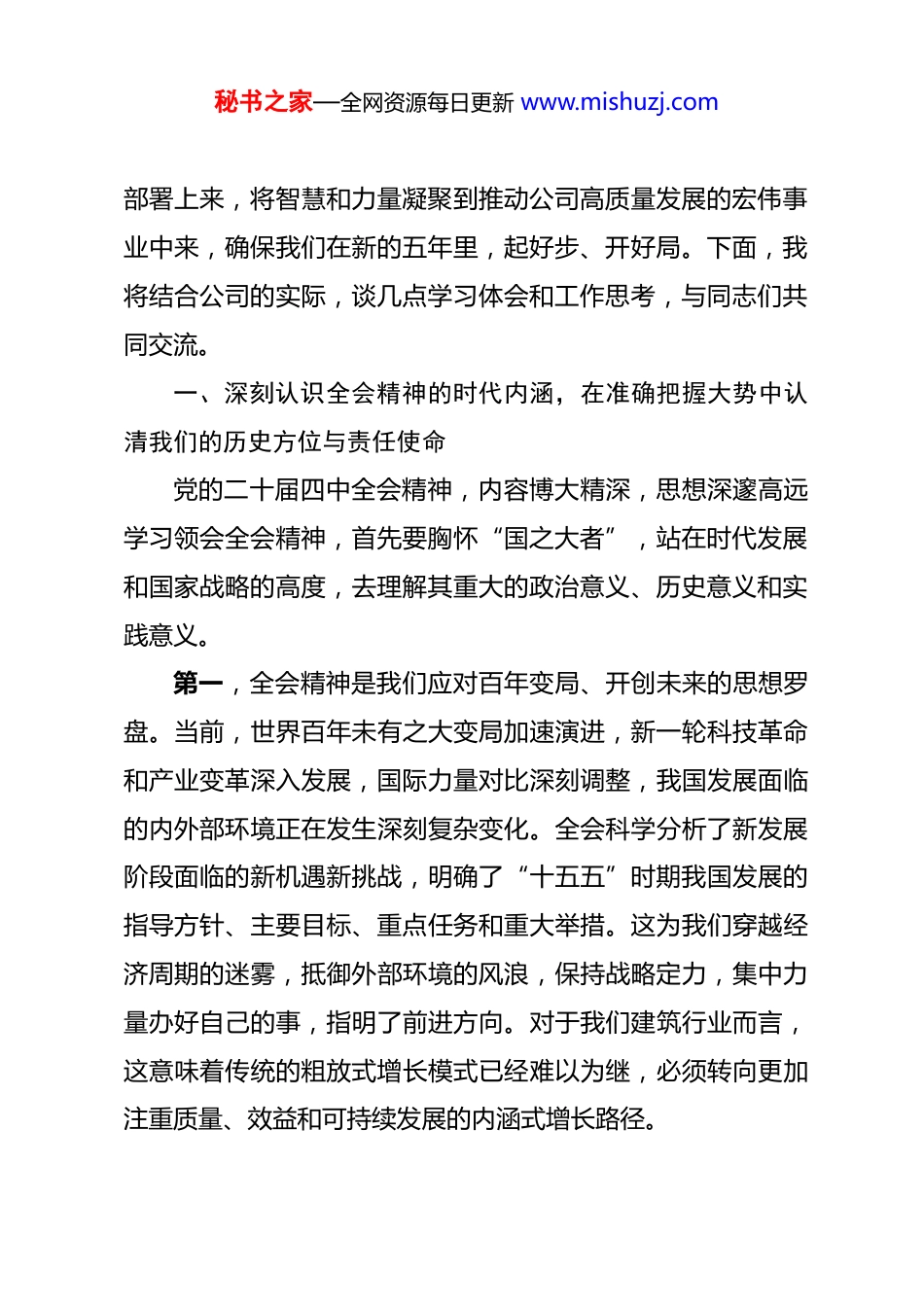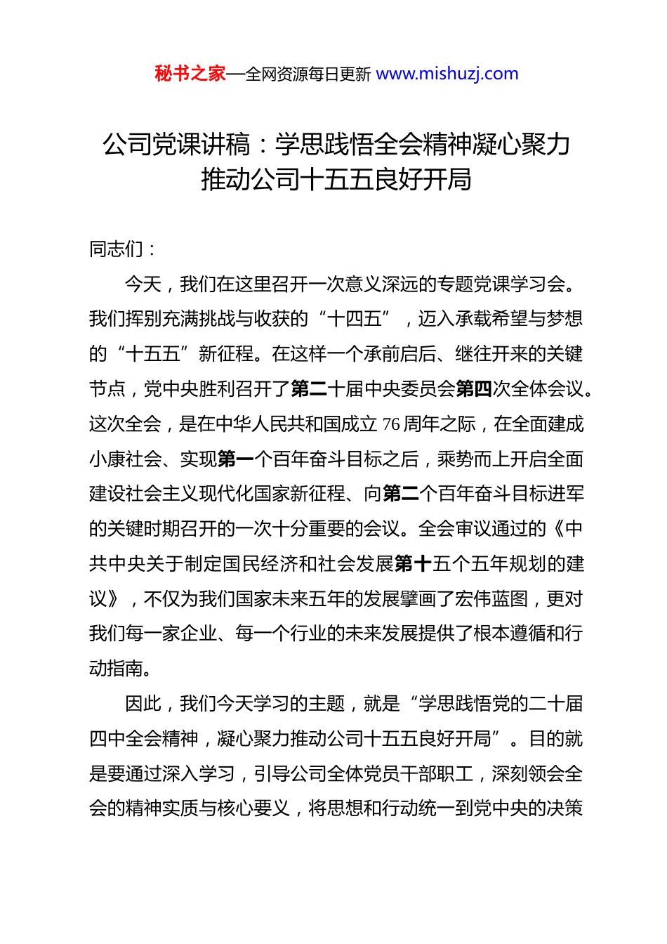 秘书之家—全网资源每日更新 www.mishuzj.com公司党课讲稿:学思践悟全会精神凝心聚力推动公司十五五良好开局 同志们:今天,我们在这里召开一次意义深远的专题党课学习会。我们挥别充满挑战与收获的“十四五”,迈入承载希望与梦想的“十五五”新征程。在这样一个承前启后、继往开来的关键节点,党中央胜利召开了第二十届中央委员会第四次全体会议。这次全会,是在中华人民共和国成立 76 周年之际,在全面建成小康社会、实现第一个百年奋斗目标之后,乘势而上开启全面建设社会主义现代化国家新征程、向第二个百年奋斗目标进军的关键时期召开的一次十分重要的会议。全会审议通过的《中共中央关于制定国民经济和社会发展第十五个五年规划的建议》,不仅为我们国家未来五年的发展擘画了宏伟蓝图,更对我们每一家企业、每一个行业的未来发展提供了根本遵循和行动指南。因此,我们今天学习的主题,就是“学思践悟党的二十届四中全会精神,凝心聚力推动公司十五五良好开局”。目的就是要通过深入学习,引导公司全体党员干部职工,深刻领会全会的精神实质与核心要义,将思想和行动统一到党中央的决策秘书之家—全网资源每日更新 www.mishuzj.com部署上来,将智慧和力量凝聚到推动公司高质量发展的宏伟事业中来,确保我们在新的五年里,起好步、开好局。下面,我将结合公司的实际,谈几点学习体会和工作思考,与同志们共同交流。一、深刻认识全会精神的时代内涵,在准确把握大势中认清我们的历史方位与责任使命党的二十届四中全会精神,内容博大精深,思想深邃高远学习领会全会精神,首先要胸怀“国之大者”,站在时代发展和国家战略的高度,去理解其重大的政治意义、历史意义和实践意义。第一,全会精神是我们应对百年变局、开创未来的思想罗盘。当前,世界百年未有之大变局加速演进,新一轮科技革命和产业变革深入发展,国际力量对比深刻调整,我国发展面临的内外部环境正在发生深刻复杂变化。全会科学分析了新发展阶段面临的新机遇新挑战,明确了“十五五”时期我国发展的指导方针、主要目标、重点任务和重大举措。这为我们穿越经济周期的迷雾,抵御外部环境的风浪,保持战略定力,集中力量办好自己的事,指明了前进方向。对于我们建筑行业而言,这意味着传统的粗放式增长模式已经难以为继,必须转向更加注重质量、效益和可持续发展的内涵式增长路径。秘书之家—全网资源每日更新 www.mishuzj.com第二,全会擘画的宏伟蓝图是我们转型升级、赢得主动的战略机遇。全会《建议》中明确提出要深入推进以人为核心的新型城镇化战略,大力发展战略性新兴产业和未来产业,推动传统产业高端化、智能化、绿色化转型。这些部署,每一项都与我们公司的主营业务息息相关,为我们开辟了广阔的市场空间。无论是城市更新、老旧小区改造,还是新型基础设施建设、绿色建筑、智能建造,都蕴含着巨大的发展潜能。可以说,国家战略的聚焦点,就是我们未来业务的增长点。我们能否抓住这些机遇,将政策红利转化为实实在在的发展效益,是对我们战略眼光、市场嗅觉和核心能力的直接考验。第三,在肯定成绩中我们更要正视挑战、直面问题。回顾即将过去的 2025 年,在全体干部职工的共同努力下,我们克服了市场需求收缩、竞争压力加剧、成本持续上涨等多重困难,取得了来之不易的成绩。全年预计完成新签合同额超 900 亿元,实现营业收入近 750 亿元,利润总额达到 18.5 亿元,市场份额在**区域继续保持领先地位。这些数据背后,是我们在**新城、**片区综合开发、**轨道交通等一批重大项目上的辛勤耕耘。但是,我们更要清醒地看到成绩背后的隐忧与挑战。我们的利润增长率近年来首次低于营收增长率,显示出传统项目的盈利空间正在被严重挤压;我们的人均产值增速放缓,反映出劳动秘书之家—全网资源每日更新 www.mishuzj.com生产率的提升遇到了瓶颈;我们的管理模式仍然存在“大而不强、多而不优”的问题,部门壁垒、信息孤岛现象依然存在,难以适应快速变化的市场需求;我们的人才结构与公司战略转型需求不相匹配,既懂技术、又懂市场、还精通管理的复合型人才,以及掌握数字化、智能化前沿技术的领军...