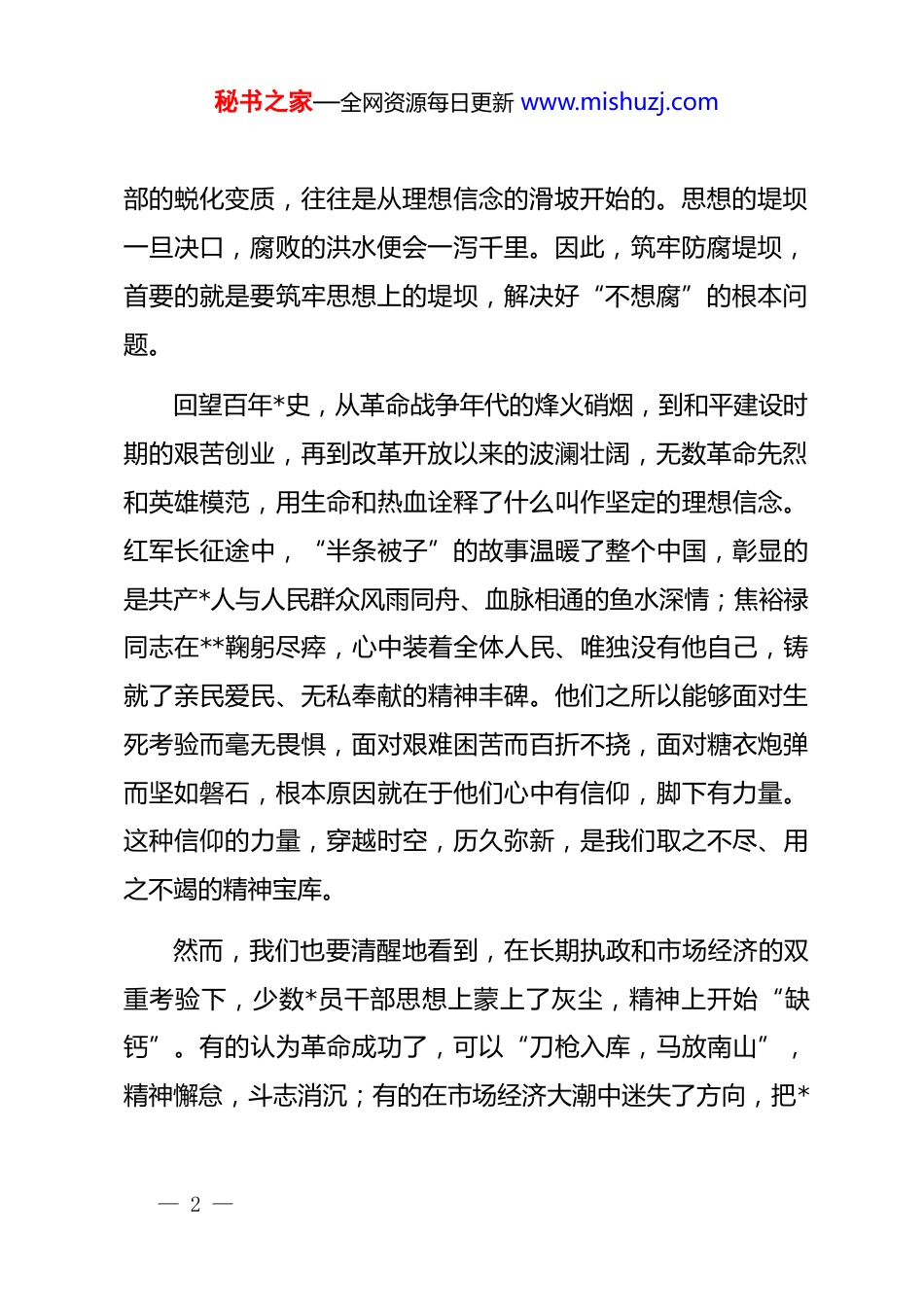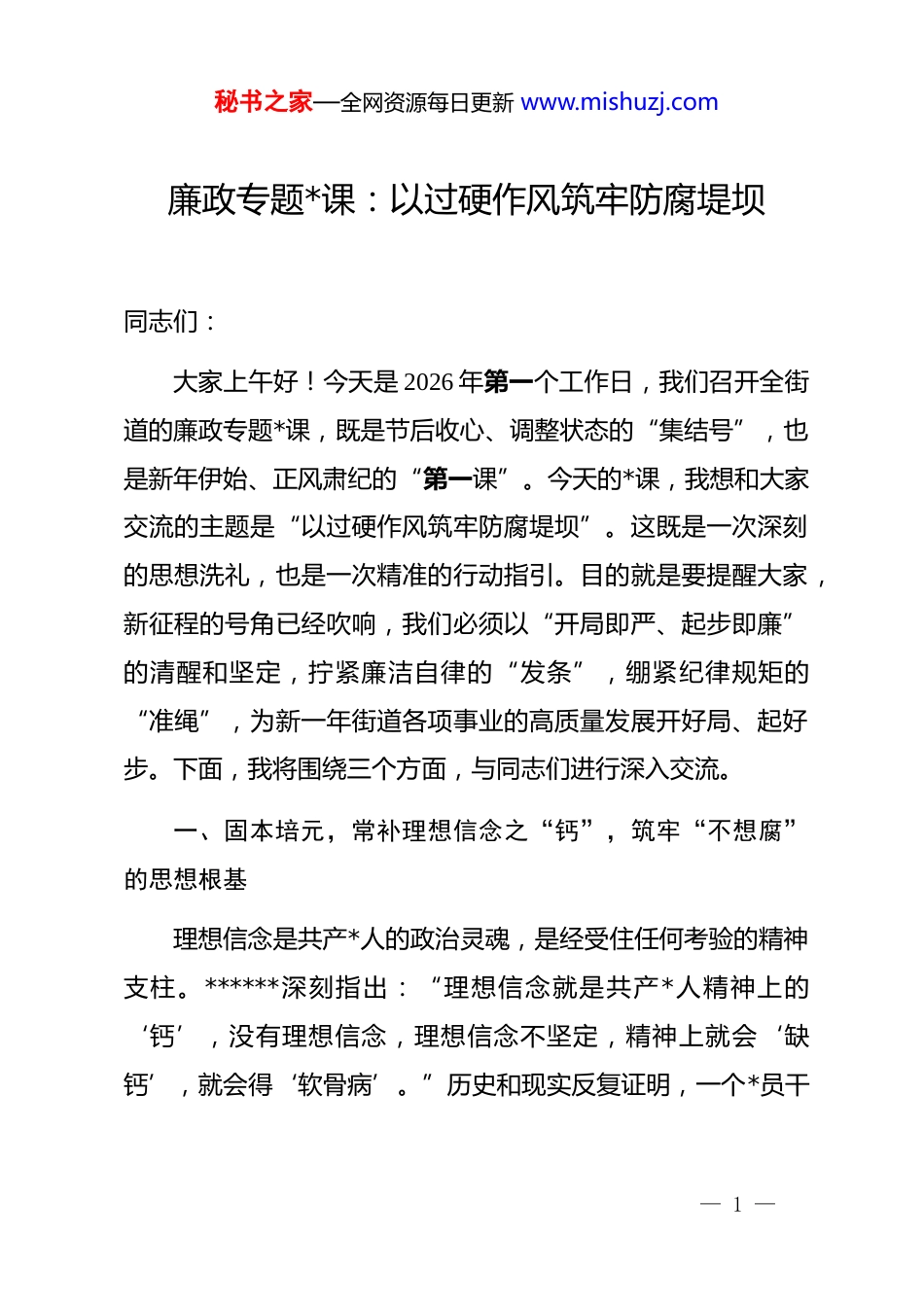 秘书之家—全网资源每日更新 www.mishuzj.com廉政专题*课:以过硬作风筑牢防腐堤坝同志们:大家上午好!今天是 2026 年第一个工作日,我们召开全街道的廉政专题*课,既是节后收心、调整状态的“集结号”,也是新年伊始、正风肃纪的“第一课”。今天的*课,我想和大家交流的主题是“以过硬作风筑牢防腐堤坝”。这既是一次深刻的思想洗礼,也是一次精准的行动指引。目的就是要提醒大家,新征程的号角已经吹响,我们必须以“开局即严、起步即廉”的清醒和坚定,拧紧廉洁自律的“发条”,绷紧纪律规矩的“准绳”,为新一年街道各项事业的高质量发展开好局、起好步。下面,我将围绕三个方面,与同志们进行深入交流。一、固本培元,常补理想信念之“钙”,筑牢“不想腐”的思想根基理想信念是共产*人的政治灵魂,是经受住任何考验的精神支柱。******深刻指出:“理想信念就是共产*人精神上的‘钙’,没有理想信念,理想信念不坚定,精神上就会‘缺钙’,就会得‘软骨病’。”历史和现实反复证明,一个*员干— 1 —秘书之家—全网资源每日更新 www.mishuzj.com部的蜕化变质,往往是从理想信念的滑坡开始的。思想的堤坝一旦决口,腐败的洪水便会一泻千里。因此,筑牢防腐堤坝,首要的就是要筑牢思想上的堤坝,解决好“不想腐”的根本问题。回望百年*史,从革命战争年代的烽火硝烟,到和平建设时期的艰苦创业,再到改革开放以来的波澜壮阔,无数革命先烈和英雄模范,用生命和热血诠释了什么叫作坚定的理想信念。红军长征途中,“半条被子”的故事温暖了整个中国,彰显的是共产*人与人民群众风雨同舟、血脉相通的鱼水深情;焦裕禄同志在**鞠躬尽瘁,心中装着全体人民、唯独没有他自己,铸就了亲民爱民、无私奉献的精神丰碑。他们之所以能够面对生死考验而毫无畏惧,面对艰难困苦而百折不挠,面对糖衣炮弹而坚如磐石,根本原因就在于他们心中有信仰,脚下有力量。这种信仰的力量,穿越时空,历久弥新,是我们取之不尽、用之不竭的精神宝库。然而,我们也要清醒地看到,在长期执政和市场经济的双重考验下,少数*员干部思想上蒙上了灰尘,精神上开始“缺钙”。有的认为革命成功了,可以“刀枪入库,马放南山”,精神懈怠,斗志消沉;有的在市场经济大潮中迷失了方向,把*— 2 —秘书之家—全网资源每日更新 www.mishuzj.com和人民赋予的权力当作谋取私利的工具,信奉“有权不用,过期作废”的庸俗哲学;还有的面对西方腐朽思想的侵蚀,丧失了政治辨别力,对共产主义理想和社会主义信念产生了动摇。这些问题的出现,根子都在于理想信念这个“总开关”出了问题。近年来,我们查处的一些案例中,涉案人员在他们的忏悔录中,无一例外地都提到了自己放松了学习、动摇了信念,导致世界观、人生观、价值观发生扭曲,最终一步步滑向犯罪的深渊。这些都是沉痛的教训,是需要我们时刻警醒的“活教材”。同志们,我们街道的*员干部身处服务群众的“最后一公里”,是*和政府联系群众的桥梁和纽带。我们的一言一行,直接关系到*在人民群众心中的形象;我们的一举一动,直接影响到群众的切身利益。因此,补足精神之“钙”,比任何时候都显得更为重要和紧迫。第一,要坚定理想信念,筑牢政治之基。理想信念不是空洞的口号,而是具体的、实践的。在新的历史条件下,坚定理想信念,最核心的就是要坚定对马克思主义的信仰,对中国特色社会主义的信念,对实现中华民族伟大复兴中国梦的信心。我们要坚持把理想信念教育作为一项常态化、制度化的工作来— 3 —秘书之家—全网资源每日更新 www.mishuzj.com抓,持之以恒,久久为功。要深入学习贯彻**************思想,特别是***关于全面从严治*、加强*风廉政建设的重要论述,深刻领悟“两个确立”的决定性意义,不断增强“四个意识”、坚定“四个自信”、做到“两个维护”。要通过学习,真正搞清楚我们*“从哪里来、到哪里去”,弄明白“我是谁、为了谁、依靠谁”的根本问题。要把学习的成效,转化为对*忠诚的政治品格,转化为抵御各种诱惑和风险的强大精神力量,确保在任何时候、任何情况下,都能做到政治立场不移、政治方向不偏。第二,要恪守初心使命,...