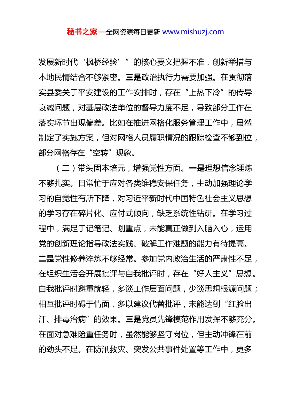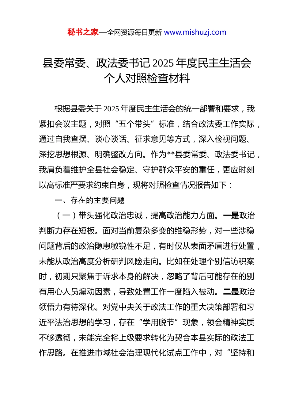 秘书之家—全网资源每日更新 www.mishuzj.com县委常委、政法委书记 2025 年度民主生活会个人对照检查材料 根据县委关于 2025 年度民主生活会的统一部署和要求,我紧扣会议主题,对照“五个带头”标准,结合政法委工作实际,通过自我查摆、谈心谈话、征求意见等方式,深入检视问题、深挖思想根源、明确整改方向。作为**县委常委、政法委书记,我肩负着维护全县社会稳定、守护群众平安的重任,更应时刻以高标准严要求约束自身,现将对照检查情况报告如下:一、存在的主要问题(一)带头强化政治忠诚,提高政治能力方面。一是政治判断力存在短板。面对当前复杂多变的维稳形势,对一些涉稳问题背后的政治隐患敏锐性不足,有时仅从表面矛盾进行处置,未能从政治高度分析研判风险走向。比如在处理个别信访积案时,初期只聚焦于诉求本身的解决,忽略了背后可能存在的别有用心人员煽动因素,导致处置工作一度陷入被动。二是政治领悟力有待深化。对党中央关于政法工作的重大决策部署和习近平法治思想的学习,存在“学用脱节”现象,领会精神实质不够透彻,未能完全将上级要求转化为契合本县实际的政法工作思路。在推进市域社会治理现代化试点工作中,对“坚持和秘书之家—全网资源每日更新 www.mishuzj.com发展新时代‘枫桥经验’”的核心要义把握不准,创新举措与本地民情结合不够紧密。三是政治执行力需要加强。在贯彻落实县委关于平安建设的工作安排时,存在“上热下冷”的传导衰减问题,对基层政法单位的督导力度不足,导致部分工作在落实环节出现偏差。比如在推进网格化服务管理工作中,虽然制定了实施方案,但对网格人员履职情况的跟踪检查不够到位,部分网格存在“空转”现象。(二)带头固本培元,增强党性方面。一是理想信念锤炼不够扎实。日常忙于应对各类维稳安保任务,主动加强理论学习的自觉性有所下降,对习近平新时代中国特色社会主义思想的学习存在碎片化、应付式倾向,缺乏系统性钻研。在学习过程中,满足于记笔记、划重点,未能真正做到入脑入心,运用党的创新理论指导政法实践、破解工作难题的能力有待提高。二是党性修养淬炼不够经常。参加党内政治生活的严肃性不足,在组织生活会开展批评与自我批评时,存在“好人主义”思想。自我批评时避重就轻,多谈工作层面问题,少谈思想根源问题;相互批评时碍于情面,多以建议代替批评,未能达到“红脸出汗、排毒治病”的效果。三是党员先锋模范作用发挥不够充分。在面对急难险重任务时,虽然能够坚守岗位,但主动冲锋在前的劲头不足。在防汛救灾、突发公共事件处置等工作中,更多秘书之家—全网资源每日更新 www.mishuzj.com是坐镇指挥,深入一线、直面风险的次数不多,与党员领导干部应有的担当形象存在差距。(三)带头敬畏人民、敬畏组织、敬畏法纪方面。一是敬畏人民的意识有所淡化。深入基层、联系群众不够紧密,下基层调研存在“走马观花”现象,往往是听汇报多、走访群众少,未能真正了解群众在平安建设、法治保障方面的急难愁盼。对于群众反映的执法司法不公问题,有时存在“重程序、轻实效”的倾向,督办整改的力度不够,导致部分群众的合理诉求未能得到及时有效解决。二是敬畏组织的观念不够牢固。对组织的决策部署,有时存在选择性执行的情况,对自己分管的维稳、综治工作抓得紧,对涉及其他领域的协同工作关注较少。在工作中主动向县委汇报思想和工作进展不够及时,存在“先干后报”的现象,缺乏严格的组织程序意识。三是敬畏法纪的思维不够深入。对党纪国法和政法系统的铁规禁令学习不够系统,纪律规矩意识有所淡化,在日常工作中,对政法干警的监督管理存在“宽松软”现象。比如在处理个别干警违规执法问题时,存在“护短”心理,批评教育多、严肃处理少,未能形成有力震慑。(四)带头干事创业,担当作为方面。一是斗争精神有所欠缺。面对政法工作中的复杂矛盾和风险挑战,有时存在“求秘书之家—全网资源每日更新 www.mishuzj.com稳怕乱”的思想,不敢动真碰硬。在整治社会治安突出问题时,对一些盘踞多年的黑恶势力“保护伞”线索,存在畏难情绪,深挖彻查的决心不够坚定;在化解涉法涉诉信访积案时...