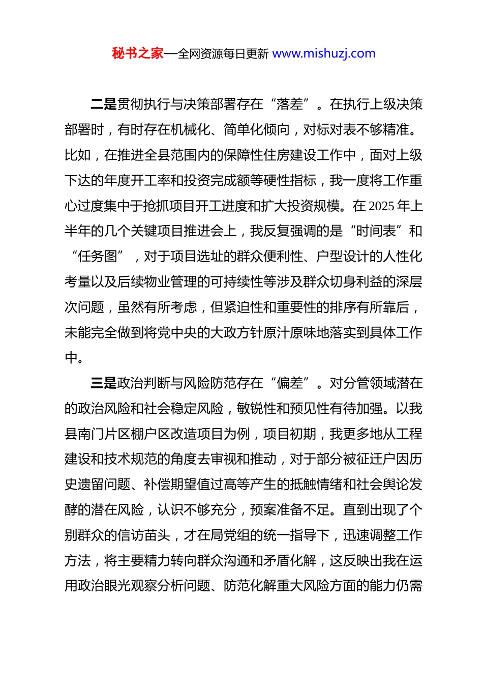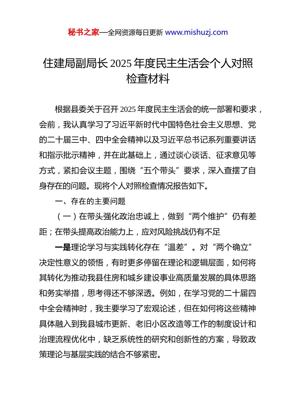 秘书之家—全网资源每日更新 www.mishuzj.com住建局副局长 2025 年度民主生活会个人对照检查材料 根据县委关于召开 2025 年度民主生活会的统一部署和要求,会前,我认真学习了习近平新时代中国特色社会主义思想、党的二十届三中、四中全会精神以及习近平总书记系列重要讲话和指示批示精神,并在此基础上,通过谈心谈话、征求意见等方式,紧扣会议主题,围绕“五个带头”要求,深入查摆了自身存在的问题。现将个人对照检查情况报告如下。一、存在的主要问题(一)在带头强化政治忠诚上,做到“两个维护”仍有差距;在带头提高政治能力上,应对风险挑战仍有不足一是理论学习与实践转化存在“温差”。对“两个确立”决定性意义的领悟,有时更多停留在理论和逻辑层面,如何将其转化为推动我县住房和城乡建设事业高质量发展的具体思路和务实举措,思考得还不够深透。例如,在学习党的二十届四中全会精神时,我主要学习了宏观论述,但在如何将这些精神具体融入到我县城市更新、老旧小区改造等工作的制度设计和治理流程优化中,缺乏系统性的研究和创新性的方案,导致政策理论与基层实践的结合不够紧密。秘书之家—全网资源每日更新 www.mishuzj.com二是贯彻执行与决策部署存在“落差”。在执行上级决策部署时,有时存在机械化、简单化倾向,对标对表不够精准。比如,在推进全县范围内的保障性住房建设工作中,面对上级下达的年度开工率和投资完成额等硬性指标,我一度将工作重心过度集中于抢抓项目开工进度和扩大投资规模。在 2025 年上半年的几个关键项目推进会上,我反复强调的是“时间表”和“任务图”,对于项目选址的群众便利性、户型设计的人性化考量以及后续物业管理的可持续性等涉及群众切身利益的深层次问题,虽然有所考虑,但紧迫性和重要性的排序有所靠后,未能完全做到将党中央的大政方针原汁原味地落实到具体工作中。三是政治判断与风险防范存在“偏差”。对分管领域潜在的政治风险和社会稳定风险,敏锐性和预见性有待加强。以我县南门片区棚户区改造项目为例,项目初期,我更多地从工程建设和技术规范的角度去审视和推动,对于部分被征迁户因历史遗留问题、补偿期望值过高等产生的抵触情绪和社会舆论发酵的潜在风险,认识不够充分,预案准备不足。直到出现了个别群众的信访苗头,才在局党组的统一指导下,迅速调整工作方法,将主要精力转向群众沟通和矛盾化解,这反映出我在运用政治眼光观察分析问题、防范化解重大风险方面的能力仍需秘书之家—全网资源每日更新 www.mishuzj.com提升。(二)在带头固本培元上,理论武装的自觉性仍有差距;在带头增强党性上,党性锤炼的主动性仍有不足一是理论学习的系统性和主动性不够强。尽管能够按时参加党组中心组学习和支部各项学习活动,但有时存在“要我学”而非“我要学”的被动心态。对于习近平新时代中国特色社会主义思想的博大精深,满足于通读、浅学,缺乏“钻”和“研”的劲头,尤其是在工作繁忙时,容易产生“以干代学”的念头,坐下来静心研读原著、细心领悟原理的时间相对较少,导致理论素养的提升速度跟不上事业发展的需要。二是在艰苦环境中的党性修养不够牢。面对当前住建领域工作任务重、压力大、矛盾多的复杂局面,特别是在推进一些历史遗留的“老大难”问题时,偶尔会产生畏难情绪和急躁心态。例如,在处理某小区多年的产权办理遗留问题时,因涉及部门多、协调难度大、时间跨度长,几次协调会无果后,我一度感到焦虑和沮-丧,甚至在内部会议上流露出“推一推、动一动”的消极想法。这种表现说明,自己在复杂艰巨的斗争实践中锤炼党性、磨练意志的自觉性还不够,革命乐观主义精神和“越是艰险越向前”的英雄气概有所消减。三是在日常言行中砥砺品德不够严。能够时刻保持清正廉秘书之家—全网资源每日更新 www.mishuzj.com洁的政治本色,但在一些细节上对自己的要求不够严格。比如,在与一些建筑企业、开发商负责人进行工作座谈时,虽然坚决拒收任何礼品礼金,但对于对方一些带有恭维、奉承色彩的言辞,有时没有旗帜鲜明地予以制止和批评,存在“听听就算了”的心理。这反映出自己对于抵制不良风气的思想防...