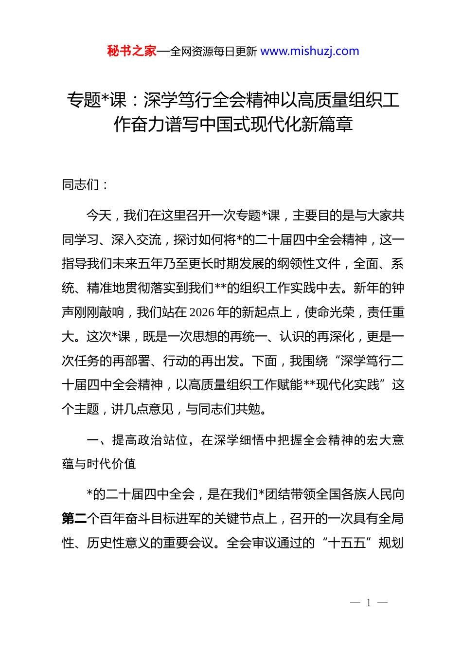 秘书之家—全网资源每日更新 www.mishuzj.com专题*课:深学笃行全会精神以高质量组织工作奋力谱写中国式现代化新篇章同志们:今天,我们在这里召开一次专题*课,主要目的是与大家共同学习、深入交流,探讨如何将*的二十届四中全会精神,这一指导我们未来五年乃至更长时期发展的纲领性文件,全面、系统、精准地贯彻落实到我们**的组织工作实践中去。新年的钟声刚刚敲响,我们站在 2026 年的新起点上,使命光荣,责任重大。这次*课,既是一次思想的再统一、认识的再深化,更是一次任务的再部署、行动的再出发。下面,我围绕“深学笃行二十届四中全会精神,以高质量组织工作赋能**现代化实践”这个主题,讲几点意见,与同志们共勉。一、提高政治站位,在深学细悟中把握全会精神的宏大意蕴与时代价值*的二十届四中全会,是在我们*团结带领全国各族人民向第二个百年奋斗目标进军的关键节点上,召开的一次具有全局性、历史性意义的重要会议。全会审议通过的“十五五”规划— 1 —秘书之家—全网资源每日更新 www.mishuzj.com建议,如同一座灯塔,为我们在新征程上劈波斩浪、行稳致远指明了航向。作为*的政治机关、管*治*的重要职能部门,组织部门必须在学习领会全会精神上站位更高、思考更深、行动更快,真正做到学思用贯通、知信行统一。第一,深刻领会全会的“里程碑”意义,在把握历史方位中坚定前行方向。任何伟大的事业,都需要在历史的长河中校准方位。全会擘画的“十五五”发展蓝图,上承全面建成小康社会的辉煌成就,下启基本实现社会主义现代化的宏伟目标,具有承前启后、继往开来的里程碑意义。我们必须跳出**看**,将**的发展置于国家现代化建设的宏大棋局中去审视、去定位、去谋划。要清醒认识到,**的现代化,是中国式现代化的重要组成部分和生动实践单元。我们走的每一步,不仅关系到**几十万人民的福祉,更关系到国家发展大局的实现。因此,学习贯彻全会精神,首要的就是要树立大历史观,深刻理解我们当前所处的历史方位,把思想和行动统一到*中央的决策部署上来,确保**的各项事业始终沿着正确政治方向阔步前行。第二,深刻领会全会的“思想树”精髓,在把握核心要义中汲取奋进力量。全会精神博大精深,其核心要义集中体现了我们*对经济社会发展规律认识的深化。特别是全会重申并强调— 2 —秘书之家—全网资源每日更新 www.mishuzj.com“高质量发展是新时代的硬道理”,为我们破解发展难题、增强发展动力、厚植发展优势提供了根本遵循。组织工作作为推动发展的关键变量,必须牢牢把握这一思想精髓。我们的选干部、配班子,就要看是否有利于推动高质量发展;我们的抓基层、建堡垒,就要看是否能服务于高质量发展;我们的聚人才、用贤能,就要看是否能支撑起高质量发展。具体而言,就是要将组织工作的价值坐标精准嵌入到发展新质生产力的实践中去,围绕我县的生态资源优势、特色农业基础,思考如何通过优化干部队伍结构、提升*员先锋模用、集聚创新创业人才,为传统产业的转型升级和新兴产业的培育壮大提供最坚实的组织保障和智力支持。第三,深刻领会全会的“清醒剂”判断,在把握风险挑战中增强忧患意识。全会科学分析了当前和今后一个时期我国发展面临的内外环境,作出了“战略机遇和风险挑战并存”的重大判断。这既是对光明前景的坚定信心,也是对潜在风险的高度警醒。对**而言,我们同样面临着复杂而深刻的挑战。比如,随着城镇化进程加速,乡村“空心化”、人口老龄化问题日益凸显,给我县的乡村治理、公共服务、社会保障带来了前所未有的压力。截至 2025 年底,我县 60 岁以上人口占比已达到— 3 —秘书之家—全网资源每日更新 www.mishuzj.com18.5%,这不仅是民生问题,更是发展问题。面对这些挑战,我们组织部门不能置身事外,更不能束手无策。必须保持战略清醒,增强忧患意识,运用系统思维来谋划和推进工作。要前瞻性地研究这些新情况新问题对基层组织建设、干部队伍能力、人才结构需求提出的新要求,通过强化 dj 引领下的基层治理体系建设,选派懂农业、爱农村、爱农民的干部深耕一线,探索“dj+养老服务”等新模式,把潜在的挑战转化为推...