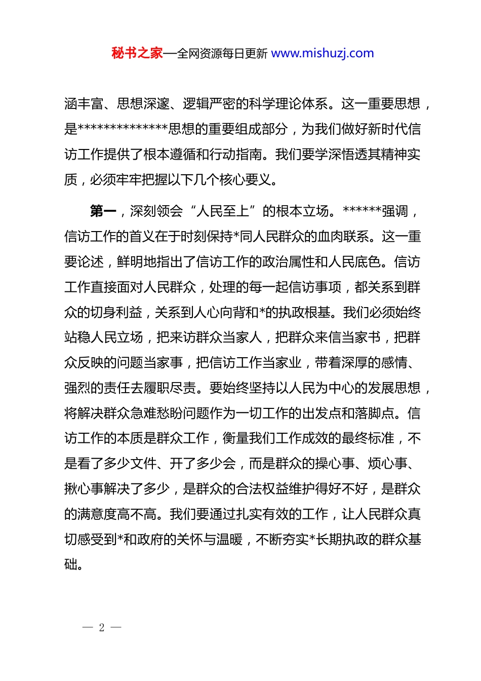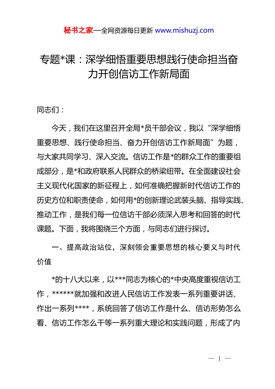 秘书之家—全网资源每日更新 www.mishuzj.com专题*课:深学细悟重要思想践行使命担当奋力开创信访工作新局面同志们:今天,我们在这里召开全局*员干部会议,我以“深学细悟重要思想、践行使命担当、奋力开创信访工作新局面”为题,与大家共同学习、深入交流。信访工作是*的群众工作的重要组成部分,是*和政府联系人民群众的桥梁纽带。在全面建设社会主义现代化国家的新征程上,如何准确把握新时代信访工作的历史方位和职责使命,如何用*的创新理论武装头脑、指导实践、推动工作,是我们每一位信访干部必须深入思考和回答的时代课题。下面,我将围绕三个方面,与同志们进行探讨。一、提高政治站位,深刻领会重要思想的核心要义与时代价值*的十八大以来,以***同志为核心的*中央高度重视信访工作,******就加强和改进人民信访工作发表一系列重要讲话、作出一系列****,系统回答了信访工作是什么、信访形势怎么看、信访工作怎么干等一系列重大理论和实践问题,形成了内— 1 —秘书之家—全网资源每日更新 www.mishuzj.com涵丰富、思想深邃、逻辑严密的科学理论体系。这一重要思想,是**************思想的重要组成部分,为我们做好新时代信访工作提供了根本遵循和行动指南。我们要学深悟透其精神实质,必须牢牢把握以下几个核心要义。第一,深刻领会“人民至上”的根本立场。******强调,信访工作的首义在于时刻保持*同人民群众的血肉联系。这一重要论述,鲜明地指出了信访工作的政治属性和人民底色。信访工作直接面对人民群众,处理的每一起信访事项,都关系到群众的切身利益,关系到人心向背和*的执政根基。我们必须始终站稳人民立场,把来访群众当家人,把群众来信当家书,把群众反映的问题当家事,把信访工作当家业,带着深厚的感情、强烈的责任去履职尽责。要始终坚持以人民为中心的发展思想,将解决群众急难愁盼问题作为一切工作的出发点和落脚点。信访工作的本质是群众工作,衡量我们工作成效的最终标准,不是看了多少文件、开了多少会,而是群众的操心事、烦心事、揪心事解决了多少,是群众的合法权益维护得好不好,是群众的满意度高不高。我们要通过扎实有效的工作,让人民群众真切感受到*和政府的关怀与温暖,不断夯实*长期执政的群众基础。— 2 —秘书之家—全网资源每日更新 www.mishuzj.com第二,深刻领会“*的领导”的根本保证。******强调,要加强*对信访工作的全面领导。这是做好新时代信访工作的最高原则和最大优势。信访工作政治性、政策性强,涉及面广,许多矛盾和问题成因复杂,单靠一个部门、一个单位往往难以有效解决,必须在*的统一领导下,构建起齐抓共管、协同联动的工作格局。我们要毫不动摇地坚持和加强*对信访工作的领导,自觉将信访工作置于*委政府的中心工作大局中去谋划和推进。要健全完善*领导信访工作的体制机制,严格落实信访工作责任制,确保中央关于信访工作的各项决策部署不折不扣地落到实处。我们局*组要切实担负起主体责任,班子成员要履行好“一岗双责”,全体*员干部要不断增强“四个意识”、坚定“四个自信”、做到“两个维护”,始终在思想上政治上行动上同以***同志为核心的*中央保持高度一致,确保信访工作始终沿着正确的政治方向前进。第三,深刻领会“法治轨道”的根本路径。******指出,要善于运用法治思维和法治方式解决涉及群众切身利益的矛盾和问题。这为我们推动信访工作高质量发展指明了正确方向。近年来,从中央到地方,信访工作的法治化建设步伐显著加快,特别是 2022 年 5 月 1 日起施行的《信访工作条例》,作为我国— 3 —秘书之家—全网资源每日更新 www.mishuzj.com第一部全面规范信访工作的*内法规,为信访工作提供了坚实的制度保障。它明确了信访工作的原则、职责、程序、监督和追责,标志着我国信访工作进入了全新的法治化阶段。我们必须带头尊法学法守法用法,将法治精神贯穿于信访工作全过程和各方面。在接待受理环节,要依法保障群众的信访权利;在办理处置环节,要严格依照法律法规和政策规定,做到事实清楚、证据确凿、定性准确、处理恰当、手续完备;在督查问责环节,要依法推动责任落实,确保...
