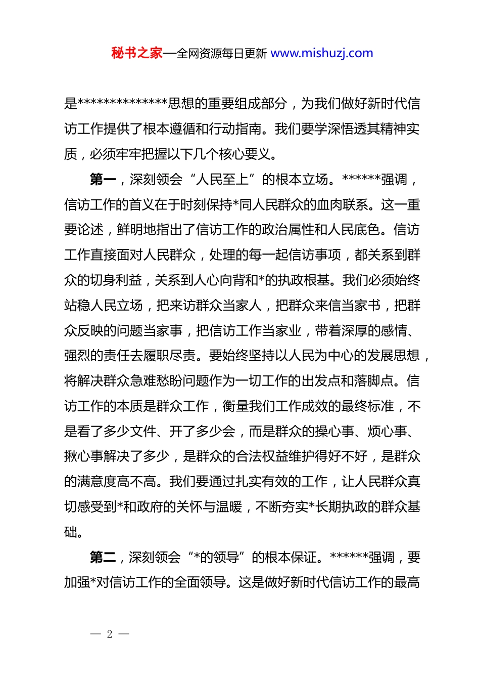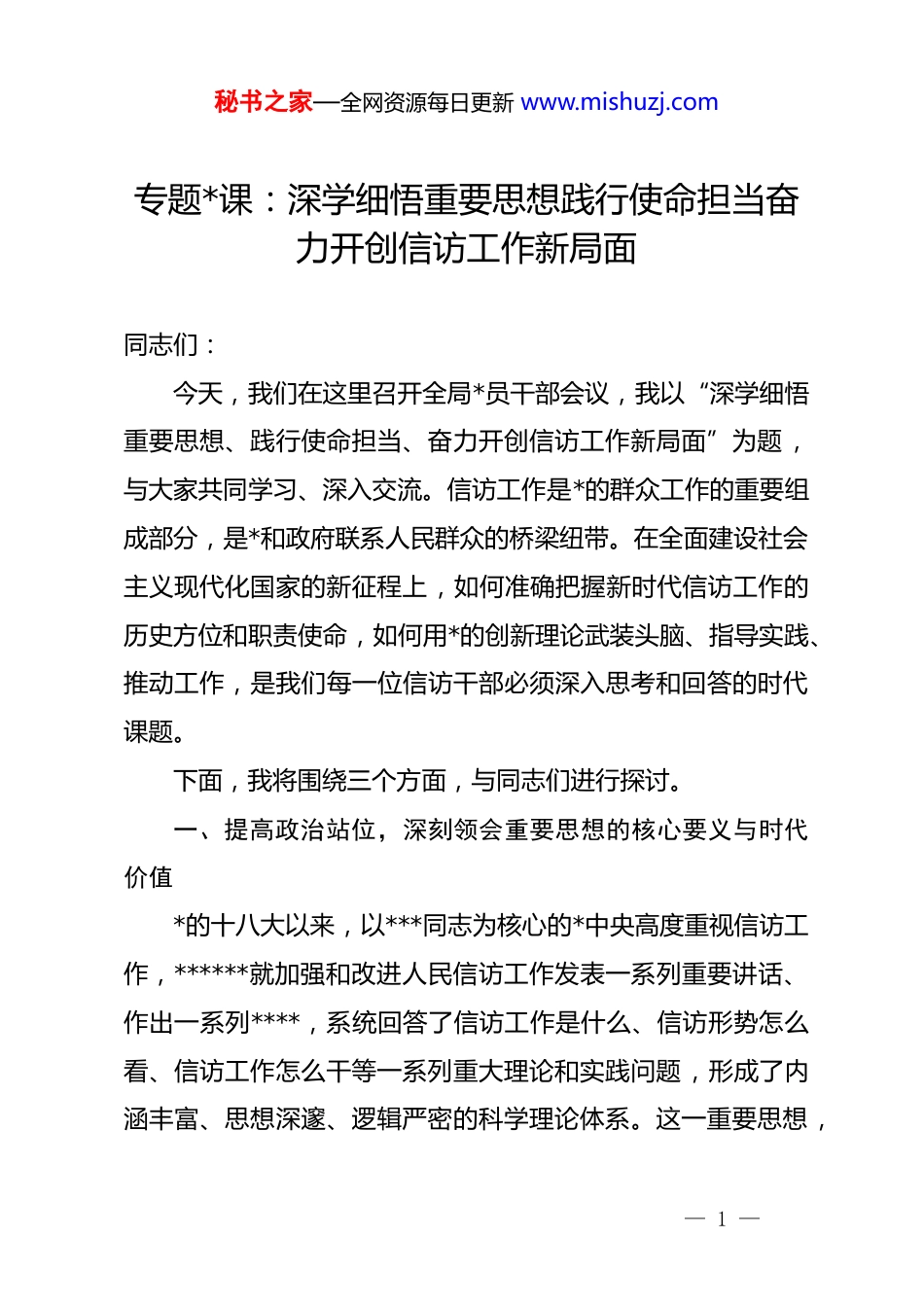 秘书之家—全网资源每日更新 www.mishuzj.com专题*课:深学细悟重要思想践行使命担当奋力开创信访工作新局面同志们:今天,我们在这里召开全局*员干部会议,我以“深学细悟重要思想、践行使命担当、奋力开创信访工作新局面”为题,与大家共同学习、深入交流。信访工作是*的群众工作的重要组成部分,是*和政府联系人民群众的桥梁纽带。在全面建设社会主义现代化国家的新征程上,如何准确把握新时代信访工作的历史方位和职责使命,如何用*的创新理论武装头脑、指导实践、推动工作,是我们每一位信访干部必须深入思考和回答的时代课题。下面,我将围绕三个方面,与同志们进行探讨。一、提高政治站位,深刻领会重要思想的核心要义与时代价值*的十八大以来,以***同志为核心的*中央高度重视信访工作,******就加强和改进人民信访工作发表一系列重要讲话、作出一系列****,系统回答了信访工作是什么、信访形势怎么看、信访工作怎么干等一系列重大理论和实践问题,形成了内涵丰富、思想深邃、逻辑严密的科学理论体系。这一重要思想,— 1 —秘书之家—全网资源每日更新 www.mishuzj.com是**************思想的重要组成部分,为我们做好新时代信访工作提供了根本遵循和行动指南。我们要学深悟透其精神实质,必须牢牢把握以下几个核心要义。第一,深刻领会“人民至上”的根本立场。******强调,信访工作的首义在于时刻保持*同人民群众的血肉联系。这一重要论述,鲜明地指出了信访工作的政治属性和人民底色。信访工作直接面对人民群众,处理的每一起信访事项,都关系到群众的切身利益,关系到人心向背和*的执政根基。我们必须始终站稳人民立场,把来访群众当家人,把群众来信当家书,把群众反映的问题当家事,把信访工作当家业,带着深厚的感情、强烈的责任去履职尽责。要始终坚持以人民为中心的发展思想,将解决群众急难愁盼问题作为一切工作的出发点和落脚点。信访工作的本质是群众工作,衡量我们工作成效的最终标准,不是看了多少文件、开了多少会,而是群众的操心事、烦心事、揪心事解决了多少,是群众的合法权益维护得好不好,是群众的满意度高不高。我们要通过扎实有效的工作,让人民群众真切感受到*和政府的关怀与温暖,不断夯实*长期执政的群众基础。第二,深刻领会“*的领导”的根本保证。******强调,要加强*对信访工作的全面领导。这是做好新时代信访工作的最高— 2 —秘书之家—全网资源每日更新 www.mishuzj.com原则和最大优势。信访工作政治性、政策性强,涉及面广,许多矛盾和问题成因复杂,单靠一个部门、一个单位往往难以有效解决,必须在*的统一领导下,构建起齐抓共管、协同联动的工作格局。我们要毫不动摇地坚持和加强*对信访工作的领导,自觉将信访工作置于*委政府的中心工作大局中去谋划和推进。要健全完善*领导信访工作的体制机制,严格落实信访工作责任制,确保中央关于信访工作的各项决策部署不折不扣地落到实处。我们局*组要切实担负起主体责任,班子成员要履行好“一岗双责”,全体*员干部要不断增强“四个意识”、坚定“四个自信”、做到“两个维护”,始终在思想上政治上行动上同以***同志为核心的*中央保持高度一致,确保信访工作始终沿着正确的政治方向前进。第三,深刻领会“法治轨道”的根本路径。******指出,要善于运用法治思维和法治方式解决涉及群众切身利益的矛盾和问题。这为我们推动信访工作高质量发展指明了正确方向。近年来,从中央到地方,信访工作的法治化建设步伐显著加快,特别是 2022 年 5 月 1 日起施行的《信访工作条例》,作为我国第一部全面规范信访工作的*内法规,为信访工作提供了坚实的制度保障。它明确了信访工作的原则、职责、程序、监督和追责,标志着我国信访工作进入了全新的法治化阶段。我们必须— 3 —秘书之家—全网资源每日更新 www.mishuzj.com带头尊法学法守法用法,将法治精神贯穿于信访工作全过程和各方面。在接待受理环节,要依法保障群众的信访权利;在办理处置环节,要严格依照法律法规和政策规定,做到事实清楚、证据确凿、定性准确、处理恰当、手续完备;在督查问责环节,要依法推动责任落实,确保...