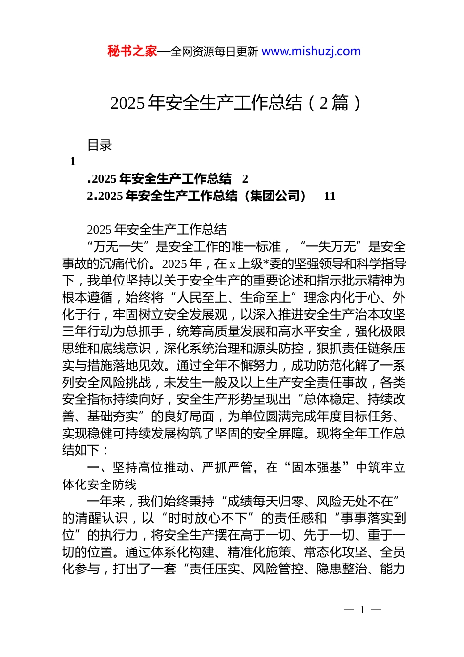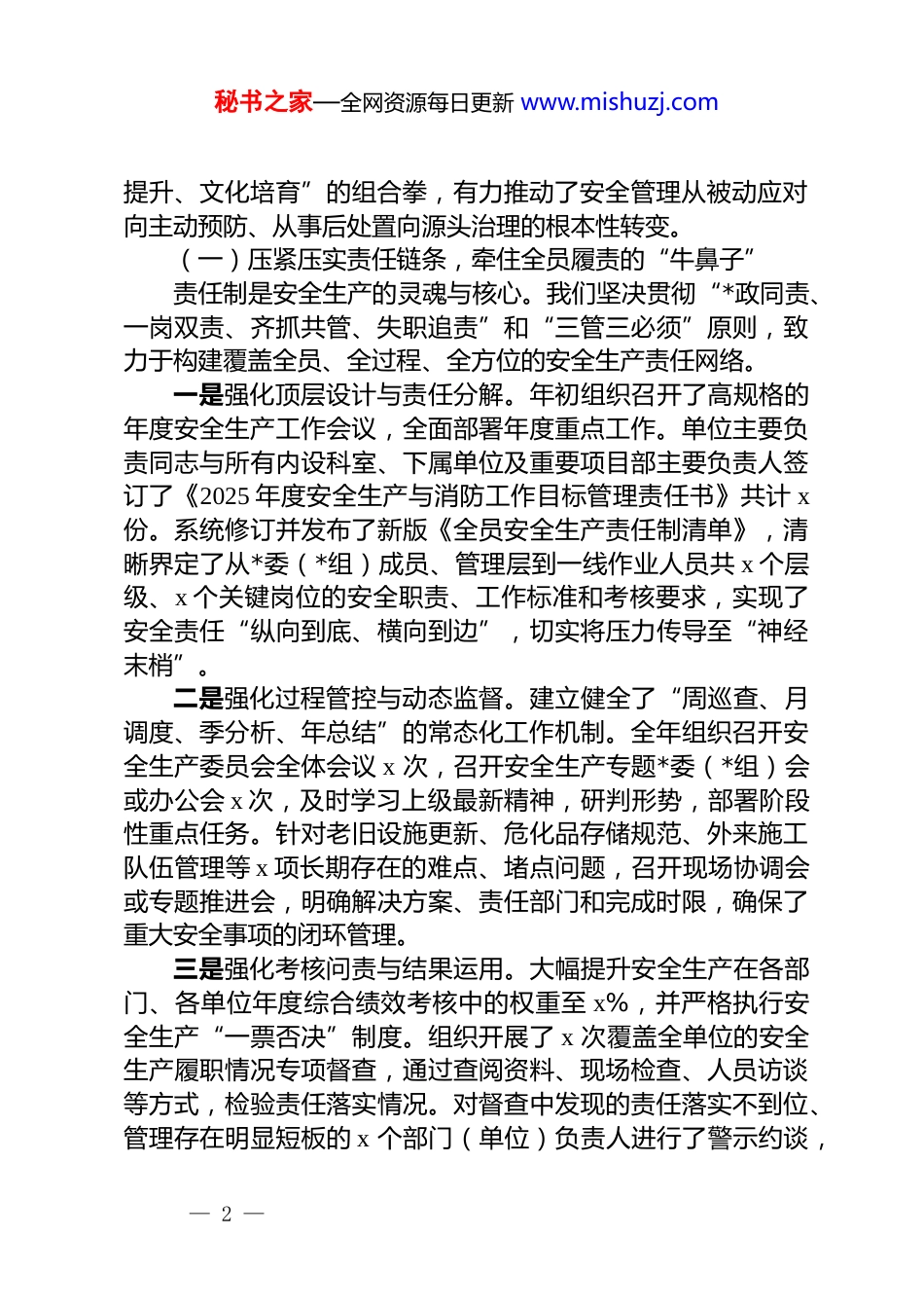 秘书之家—全网资源每日更新 www.mishuzj.com2025 年安全生产工作总结(2 篇)目录1.2025 年安全生产工作总结22.2025 年安全生产工作总结(集团公司)112025 年安全生产工作总结“万无一失”是安全工作的唯一标准,“一失万无”是安全事故的沉痛代价。2025 年,在 x 上级*委的坚强领导和科学指导下,我单位坚持以关于安全生产的重要论述和指示批示精神为根本遵循,始终将“人民至上、生命至上”理念内化于心、外化于行,牢固树立安全发展观,以深入推进安全生产治本攻坚三年行动为总抓手,统筹高质量发展和高水平安全,强化极限思维和底线意识,深化系统治理和源头防控,狠抓责任链条压实与措施落地见效。通过全年不懈努力,成功防范化解了一系列安全风险挑战,未发生一般及以上生产安全责任事故,各类安全指标持续向好,安全生产形势呈现出“总体稳定、持续改善、基础夯实”的良好局面,为单位圆满完成年度目标任务、实现稳健可持续发展构筑了坚固的安全屏障。现将全年工作总结如下:一、坚持高位推动、严抓严管,在“固本强基”中筑牢立体化安全防线一年来,我们始终秉持“成绩每天归零、风险无处不在”的清醒认识,以“时时放心不下”的责任感和“事事落实到位”的执行力,将安全生产摆在高于一切、先于一切、重于一切的位置。通过体系化构建、精准化施策、常态化攻坚、全员化参与,打出了一套“责任压实、风险管控、隐患整治、能力— 1 —秘书之家—全网资源每日更新 www.mishuzj.com提升、文化培育”的组合拳,有力推动了安全管理从被动应对向主动预防、从事后处置向源头治理的根本性转变。(一)压紧压实责任链条,牵住全员履责的“牛鼻子”责任制是安全生产的灵魂与核心。我们坚决贯彻“*政同责、一岗双责、齐抓共管、失职追责”和“三管三必须”原则,致力于构建覆盖全员、全过程、全方位的安全生产责任网络。一是强化顶层设计与责任分解。年初组织召开了高规格的年度安全生产工作会议,全面部署年度重点工作。单位主要负责同志与所有内设科室、下属单位及重要项目部主要负责人签订了《2025 年度安全生产与消防工作目标管理责任书》共计 x份。系统修订并发布了新版《全员安全生产责任制清单》,清晰界定了从*委(*组)成员、管理层到一线作业人员共 x 个层级、x 个关键岗位的安全职责、工作标准和考核要求,实现了安全责任“纵向到底、横向到边”,切实将压力传导至“神经末梢”。二是强化过程管控与动态监督。建立健全了“周巡查、月调度、季分析、年总结”的常态化工作机制。全年组织召开安全生产委员会全体会议 x 次,召开安全生产专题*委(*组)会或办公会 x 次,及时学习上级最新精神,研判形势,部署阶段性重点任务。针对老旧设施更新、危化品存储规范、外来施工队伍管理等 x 项长期存在的难点、堵点问题,召开现场协调会或专题推进会,明确解决方案、责任部门和完成时限,确保了重大安全事项的闭环管理。三是强化考核问责与结果运用。大幅提升安全生产在各部门、各单位年度综合绩效考核中的权重至 x%,并严格执行安全生产“一票否决”制度。组织开展了 x 次覆盖全单位的安全生产履职情况专项督查,通过查阅资料、现场检查、人员访谈等方式,检验责任落实情况。对督查中发现的责任落实不到位、管理存在明显短板的 x 个部门(单位)负责人进行了警示约谈,— 2 —秘书之家—全网资源每日更新 www.mishuzj.com并责令限期整改,形成了强有力的震慑效应,真正推动了各级人员将安全责任扛在肩上、抓在手中、落在实处。(二)落细落小防范措施,织密风险管控的“过滤网”坚持“预防为主、关口前移”,将安全风险分级管控和隐患排查治理双重预防机制建设作为遏制事故的治本之策。一是深化双重预防机制建设与运行。投入专项资金,引入高水平第三方安全技术服务机构,对单位所有作业场所、工艺流程、设备设施、人员活动等进行了一次全面、系统、深入的风险辨识与评估。科学绘制了全域“红、橙、黄、蓝”四色安全风险空间分布图,累计辨识出各类安全风险点 x 处,其中重大风险 x 处、较大风险 x 处。针对每一处风险点,制定了包含工程技...