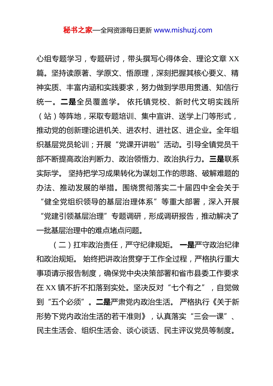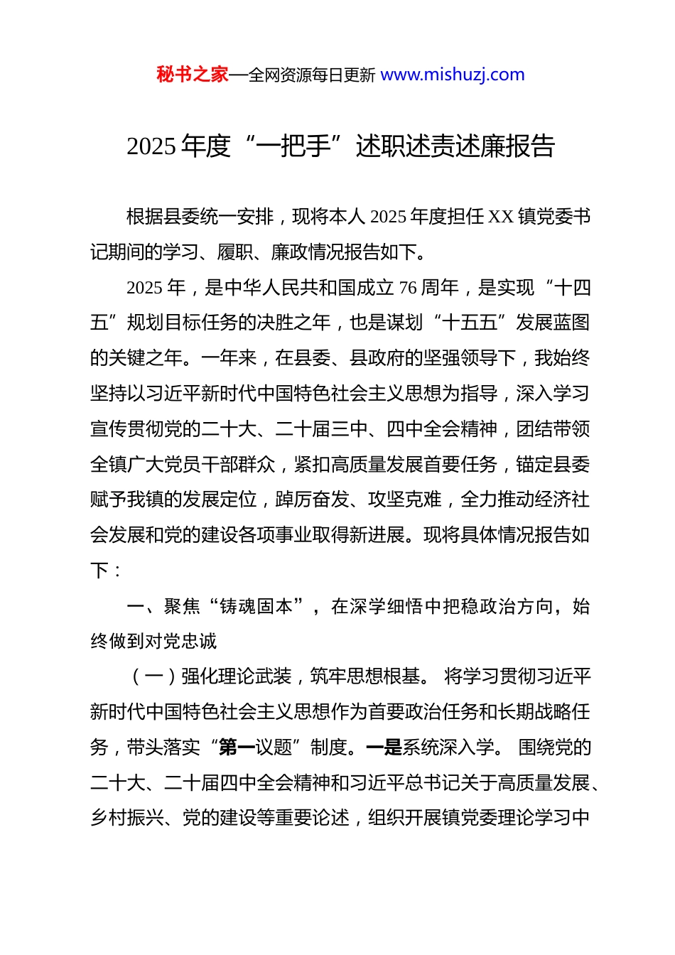 秘书之家—全网资源每日更新 www.mishuzj.com2025 年度“一把手”述职述责述廉报告 根据县委统一安排,现将本人 2025 年度担任 XX 镇党委书记期间的学习、履职、廉政情况报告如下。2025 年,是中华人民共和国成立 76 周年,是实现“十四五”规划目标任务的决胜之年,也是谋划“十五五”发展蓝图的关键之年。一年来,在县委、县政府的坚强领导下,我始终坚持以习近平新时代中国特色社会主义思想为指导,深入学习宣传贯彻党的二十大、二十届三中、四中全会精神,团结带领全镇广大党员干部群众,紧扣高质量发展首要任务,锚定县委赋予我镇的发展定位,踔厉奋发、攻坚克难,全力推动经济社会发展和党的建设各项事业取得新进展。现将具体情况报告如下:一、聚焦“铸魂固本”,在深学细悟中把稳政治方向,始终做到对党忠诚(一)强化理论武装,筑牢思想根基。 将学习贯彻习近平新时代中国特色社会主义思想作为首要政治任务和长期战略任务,带头落实“第一议题”制度。一是系统深入学。 围绕党的二十大、二十届四中全会精神和习近平总书记关于高质量发展、乡村振兴、党的建设等重要论述,组织开展镇党委理论学习中秘书之家—全网资源每日更新 www.mishuzj.com心组专题学习,专题研讨,带头撰写心得体会、理论文章 XX篇。坚持读原著、学原文、悟原理,深刻把握其核心要义、精神实质、丰富内涵和实践要求,努力做到学思用贯通、知信行统一。二是全员覆盖学。 依托镇党校、新时代文明实践所(站)等阵地,采取专题培训、集中宣讲、送学上门等形式,推动党的创新理论进机关、进农村、进社区、进企业。全年组织基层党员轮训;开展“党课开讲啦”活动。引导全镇党员干部不断提高政治判断力、政治领悟力、政治执行力。三是联系实际学。 坚持把学习成果转化为谋划工作的思路、破解难题的办法、推动发展的举措。围绕贯彻落实二十届四中全会关于“健全党组织领导的基层治理体系”等重大部署,深入开展“党建引领基层治理”专题调研,形成调研报告,推动解决了一批基层治理中的难点堵点问题。(二)扛牢政治责任,严守纪律规矩。 一是严守政治纪律和政治规矩。 始终把讲政治贯穿于工作全过程,严格执行重大事项请示报告制度,确保党中央决策部署和省市县委工作要求在 XX 镇不折不扣落到实处。坚决反对“七个有之”,自觉做到“五个必须”。二是严肃党内政治生活。 严格执行《关于新形势下党内政治生活的若干准则》,认真落实“三会一课”、民主生活会、组织生活会、谈心谈话、民主评议党员等制度。秘书之家—全网资源每日更新 www.mishuzj.com年内主持召开镇党委班子民主生活会,以普通党员身份参加所在支部组织生活会,带头开展批评与自我批评,营造了健康纯洁的党内政治生态。三是抓牢意识形态工作。 认真履行意识形态工作“第一责任人”职责,定期分析研判意识形态领域风险隐患,主持召开专题会议。加强宣传思想文化阵地建设和管理,密切关注网络舆情,妥善处置各类舆情 XX 起。大力弘扬社会主义核心价值观,开展各类群众性精神文明创建活动,牢牢掌握意识形态工作领导权主动权。(三)加强党的领导,凝聚发展合力。 始终坚持和加强党的全面领导,充分发挥镇党委总揽全局、协调各方的领导核心作用。一是完善领导机制。 修订完善《XX 镇党委议事规则》,规范“三重一大”事项决策程序,全年召开党委会 XX 次,研究决定重大事项 XX 项,确保科学决策、民主决策、依法决策。二是凝聚干事合力。 严格执行民主集中制,注重听取班子成员、人大代表、政协委员和基层干部群众的意见建议。支持镇人大、政府依法依章程履行职能,密切同各民主党派、工商联和无党派人士的联系,工会、共青团、妇联等群团组织作用得到有效发挥,形成了同心同德、团结奋斗的良好局面。二、聚焦“主责主业”,在担当实干中推动高质量发展,竭力增进民生福祉秘书之家—全网资源每日更新 www.mishuzj.com(一)全力以赴抓经济、促发展,综合实力稳步提升。 一是经济运行稳中有进。 面对复杂严峻的宏观经济形势,加强经济运行调度分析,主要经济指标保持在合理区间。二是产业发展提质增效。 坚...