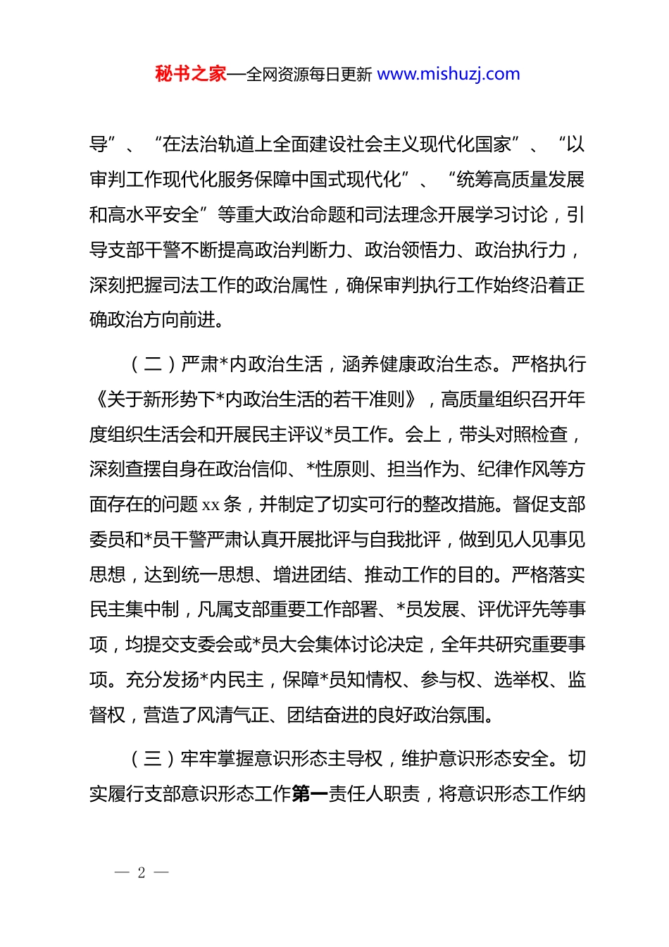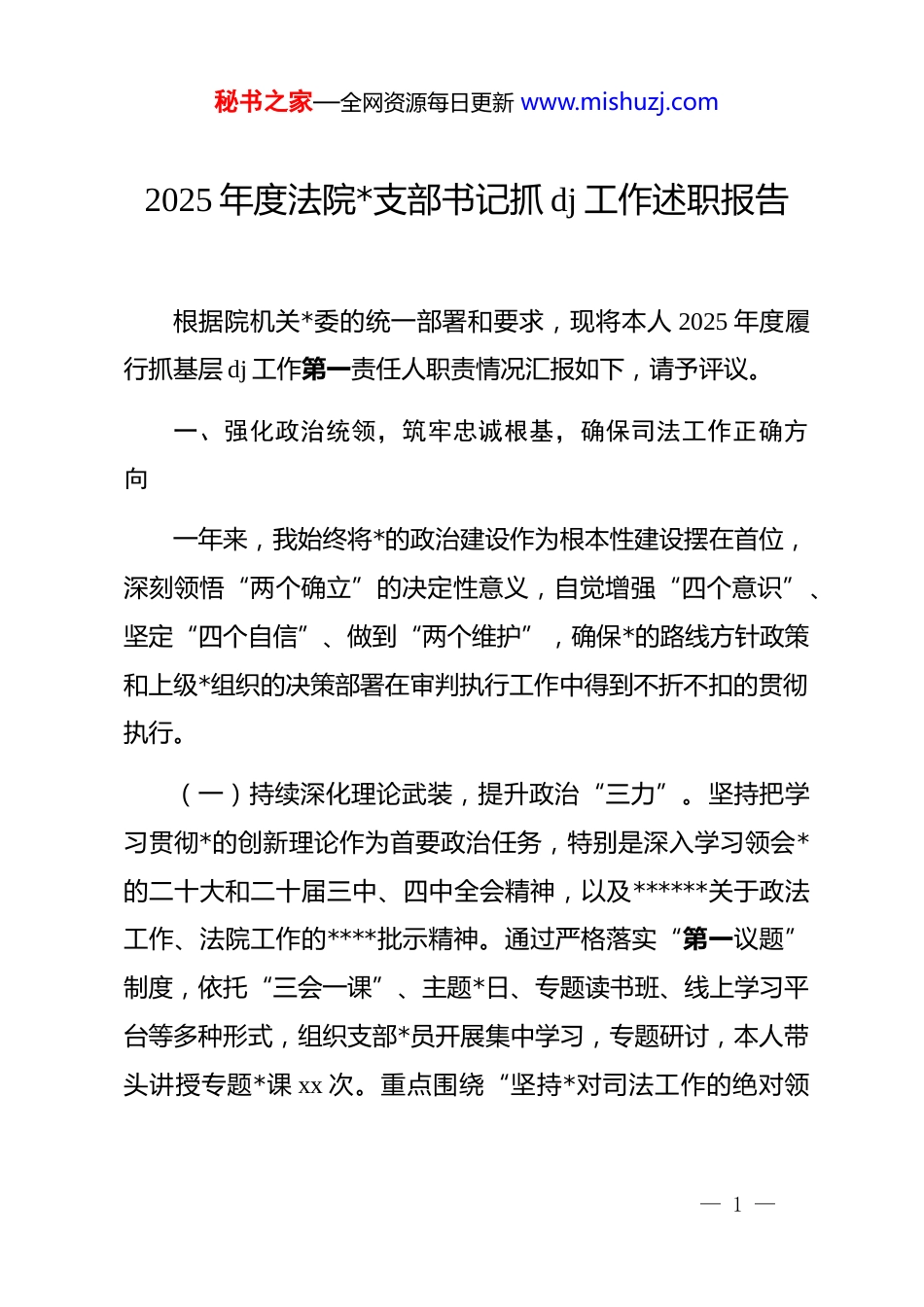 秘书之家—全网资源每日更新 www.mishuzj.com2025 年度法院*支部书记抓 dj 工作述职报告根据院机关*委的统一部署和要求,现将本人 2025 年度履行抓基层 dj 工作第一责任人职责情况汇报如下,请予评议。一、强化政治统领,筑牢忠诚根基,确保司法工作正确方向一年来,我始终将*的政治建设作为根本性建设摆在首位,深刻领悟“两个确立”的决定性意义,自觉增强“四个意识”、坚定“四个自信”、做到“两个维护”,确保*的路线方针政策和上级*组织的决策部署在审判执行工作中得到不折不扣的贯彻执行。(一)持续深化理论武装,提升政治“三力”。坚持把学习贯彻*的创新理论作为首要政治任务,特别是深入学习领会*的二十大和二十届三中、四中全会精神,以及******关于政法工作、法院工作的****批示精神。通过严格落实“第一议题”制度,依托“三会一课”、主题*日、专题读书班、线上学习平台等多种形式,组织支部*员开展集中学习,专题研讨,本人带头讲授专题*课 xx 次。重点围绕“坚持*对司法工作的绝对领— 1 —秘书之家—全网资源每日更新 www.mishuzj.com导”、“在法治轨道上全面建设社会主义现代化国家”、“以审判工作现代化服务保障中国式现代化”、“统筹高质量发展和高水平安全”等重大政治命题和司法理念开展学习讨论,引导支部干警不断提高政治判断力、政治领悟力、政治执行力,深刻把握司法工作的政治属性,确保审判执行工作始终沿着正确政治方向前进。(二)严肃*内政治生活,涵养健康政治生态。严格执行《关于新形势下*内政治生活的若干准则》,高质量组织召开年度组织生活会和开展民主评议*员工作。会上,带头对照检查,深刻查摆自身在政治信仰、*性原则、担当作为、纪律作风等方面存在的问题 xx 条,并制定了切实可行的整改措施。督促支部委员和*员干警严肃认真开展批评与自我批评,做到见人见事见思想,达到统一思想、增进团结、推动工作的目的。严格落实民主集中制,凡属支部重要工作部署、*员发展、评优评先等事项,均提交支委会或*员大会集体讨论决定,全年共研究重要事项。充分发扬*内民主,保障*员知情权、参与权、选举权、监督权,营造了风清气正、团结奋进的良好政治氛围。(三)牢牢掌握意识形态主导权,维护意识形态安全。切实履行支部意识形态工作第一责任人职责,将意识形态工作纳— 2 —秘书之家—全网资源每日更新 www.mishuzj.com入支部 dj 工作责任制,定期分析研判本部门、本条线意识形态领域风险隐患,特别是针对涉诉舆情、重大敏感案件审理、干警思想动态等加强分析引导。组织*员干警深入学习*的意识形态理论,旗帜鲜明反对和抵制各种错误思潮。利用法院内网、宣传栏、支部学习群等阵地,宣传*的政策主张、弘扬法治精神、讲好法院故事。密切关注网络舆情,对可能影响司法公信力的不当言论,及时报告、妥善应对。年内组织开展意识形态专题教育 xx 次,谈心谈话覆盖全体*员,及时化解思想疙瘩 xx 个,确保支部意识形态阵地守得住、管得好。二、聚焦主责主业,夯实组织基础,锻造坚强有力战斗堡垒(一)压紧压实 dj 责任链条。牢固树立“抓好 dj 是本职、不抓 dj 是失职、抓不好 dj 是不称职”的理念,认真研究制定年度支部 dj 工作计划和责任清单,明确支委分工,层层传导压力。定期召开支委会专题研究 dj 工作 xx 次,分析存在问题,部署重点任务。建立支部书记负总责、支部委员分工负责、*小组长具体落实、全体*员共同参与的责任体系,确保 dj 工作有人抓、有人管、能落实。年底对照责任清单进行述职评议考核,接受机关*委和*员群众的监督评价。— 3 —秘书之家—全网资源每日更新 www.mishuzj.com(二)扎实推进支部标准化规范化建设。严格对标《中国共产*支部工作条例(试行)》和上级*组织关于*支部建设的要求,持续巩固深化*支部标准化规范化建设成果。优化*小组设置,确保与审判团队、业务部门设置相协调,便于工作开展。规范*员发展程序,严把政治关、程序关,年内发展预备*员 xx名,转正 xx 名,确定入*积极分子 xx 名。加强*员日常教育管理监督,依托“人民法院 dj 云平台”、“学习强...