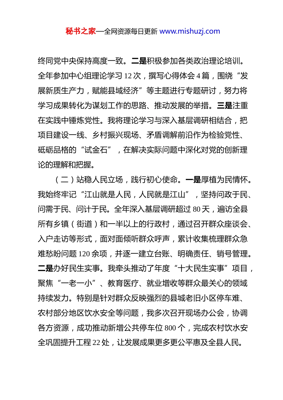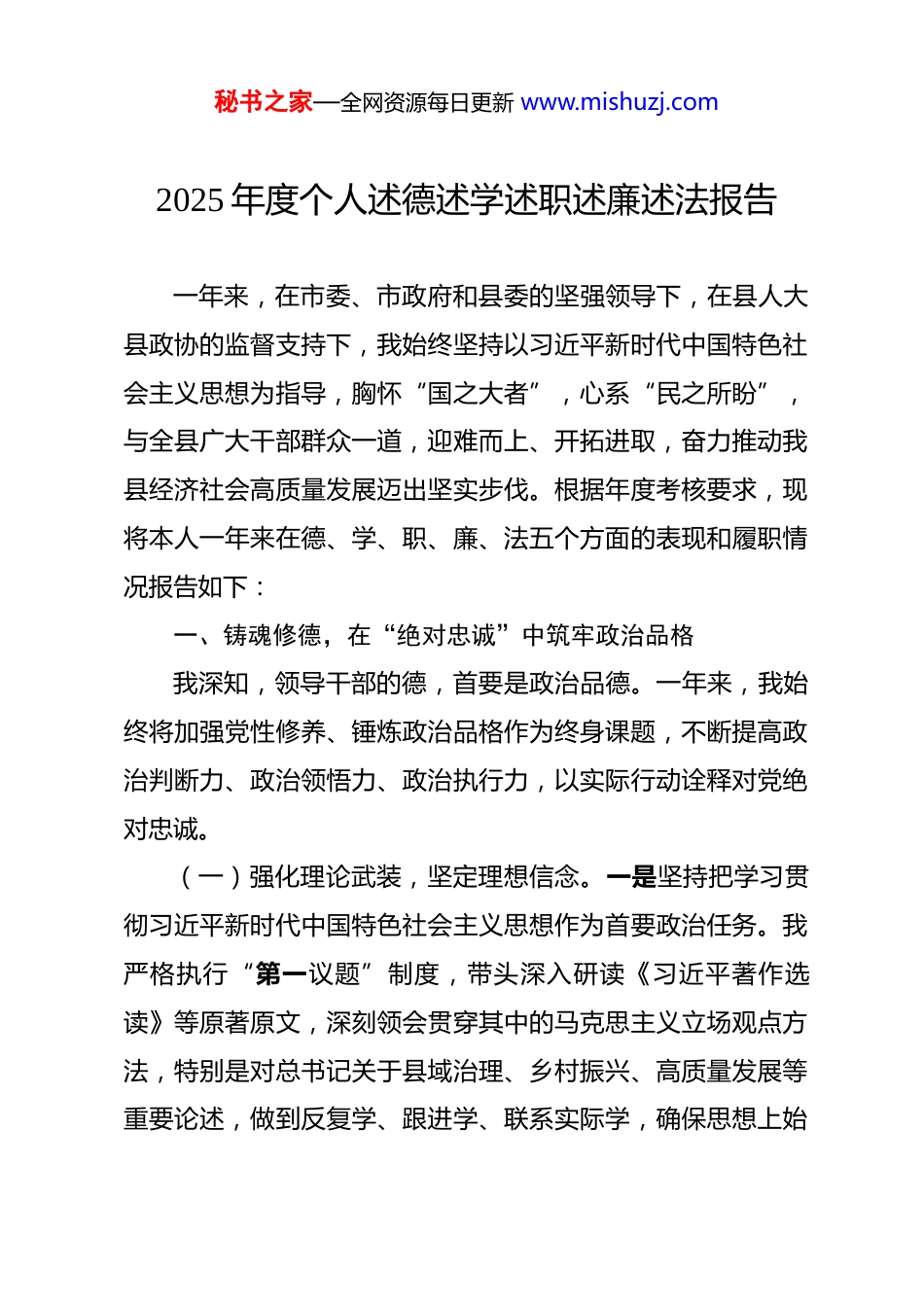 秘书之家—全网资源每日更新 www.mishuzj.com2025 年度个人述德述学述职述廉述法报告 一年来,在市委、市政府和县委的坚强领导下,在县人大县政协的监督支持下,我始终坚持以习近平新时代中国特色社会主义思想为指导,胸怀“国之大者”,心系“民之所盼”,与全县广大干部群众一道,迎难而上、开拓进取,奋力推动我县经济社会高质量发展迈出坚实步伐。根据年度考核要求,现将本人一年来在德、学、职、廉、法五个方面的表现和履职情况报告如下:一、铸魂修德,在“绝对忠诚”中筑牢政治品格我深知,领导干部的德,首要是政治品德。一年来,我始终将加强党性修养、锤炼政治品格作为终身课题,不断提高政治判断力、政治领悟力、政治执行力,以实际行动诠释对党绝对忠诚。(一)强化理论武装,坚定理想信念。一是坚持把学习贯彻习近平新时代中国特色社会主义思想作为首要政治任务。我严格执行“第一议题”制度,带头深入研读《习近平著作选读》等原著原文,深刻领会贯穿其中的马克思主义立场观点方法,特别是对总书记关于县域治理、乡村振兴、高质量发展等重要论述,做到反复学、跟进学、联系实际学,确保思想上始秘书之家—全网资源每日更新 www.mishuzj.com终同党中央保持高度一致。二是积极参加各类政治理论培训。全年参加中心组理论学习 12 次,撰写心得体会 4 篇,围绕“发展新质生产力,赋能县域经济”等主题进行专题研讨,努力将学习成果转化为谋划工作的思路、推动发展的举措。三是注重在实践中锤炼党性。我将理论学习与深入基层调研相结合,把项目建设一线、乡村振兴现场、矛盾调解前沿作为检验党性、砥砺品格的“试金石”,在解决实际问题中深化对党的创新理论的理解和把握。(二)站稳人民立场,践行初心使命。一是厚植为民情怀。我始终牢记“江山就是人民,人民就是江山”,坚持问政于民、问需于民、问计于民。全年深入基层调研超过 80 天,遍访全县所有乡镇(街道)和一半以上的行政村,通过召开群众座谈会、入户走访等形式,面对面倾听群众呼声,累计收集梳理群众急难愁盼问题 120 余项,并逐一建立台账、明确责任、销号管理。二是办好民生实事。我牵头推动了年度“十大民生实事”项目,聚焦“一老一小”、教育医疗、就业增收等群众最关心的领域持续发力。特别是针对群众反映强烈的县城老旧小区停车难、农村部分地区饮水安全等问题,我多次召开现场办公会,协调各方资源,成功推动新增公共停车位 800 个,完成农村饮水安全巩固提升工程 22 处,让发展成果更多更公平惠及全县人民。秘书之家—全网资源每日更新 www.mishuzj.com(三)锤炼党性修养,严守政治规矩。一是始终把党的政治纪律和政治规矩挺在前面。我深刻领悟“两个确立”的决定性意义,坚决做到“两个维护”,在任何时候、任何情况下都做到政治上站得稳、靠得住。二是严格执行民主集中制。在工作中,我充分发扬民主,善于听取各方面意见,特别是不同意见。在重大决策前,坚持深入调研、集体研究、科学决策,确保各项决策符合上级精神、切合我县实际、顺应群众期盼。三是严肃党内政治生活。我以普通党员身份积极参加所在党支部的组织生活会,带头开展批评与自我批评,主动查摆自身存在的不足,诚恳接受同志们的批评意见,营造了清清爽爽的同志关系、规规矩矩的上下级关系。二、笃学深思,在“能力提升”中练就过硬本领面对新形势、新任务、新挑战,我始终怀有“本领恐慌”的危机感,坚持把学习作为一种政治责任、一种精神追求,努力在学思践悟中增长才干,在知行合一中提升履职能力。(一)向书本学,持续优化知识结构。我深知,做好领导工作,必须具备宽广的知识视野。一年来,我系统学习了经济、金融、科技、法律、文化、生态等各方面知识,特别是围绕中央提出的发展新质生产力、推动区域协调发展等重大战略,重点研读了相关政策文件和专业书籍。通过学习,我对宏观经济秘书之家—全网资源每日更新 www.mishuzj.com形势的把握更加精准,对现代产业发展的规律认识更加深刻,知识储备和理论素养得到了有效提升。(二)向实践学,不断增强工作实效。我坚持理论联系实际的马克思主义学风,把学...