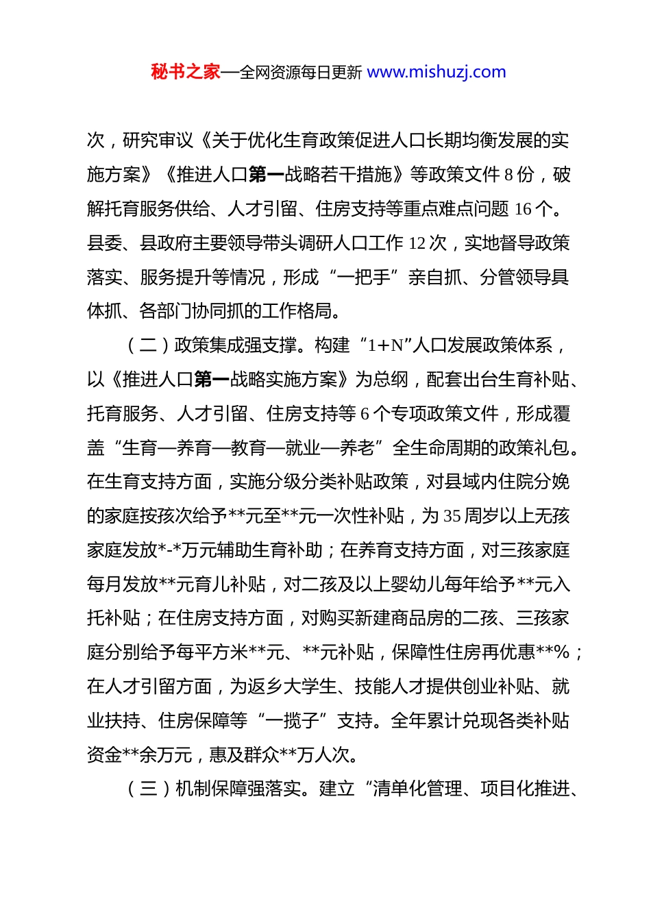 秘书之家—全网资源每日更新 www.mishuzj.com2025 年度县发改委关于人口高质量发展工作报告 2025 年,县委、县政府深入贯彻落实党中央、国务院关于人口高质量发展的决策部署及省委、市委工作要求,坚持以人民为中心的发展思想,锚定“生育支持有力度、人口集聚有成效、服务保障有温度、结构优化有进展”的工作目标,统筹推进生育友好型社会建设、人口集聚引流、公共服务提质、老龄化应对等重点任务,全县人口规模稳步提升、结构持续优化、素质不断提高,人口发展与经济社会高质量发展协同共进。现将全年工作情况报告如下:一、聚焦协同推进,构建人口发展“四梁八柱”县委、县政府始终把人口工作摆在全局性、战略性位置,坚持系统谋划、协同发力,推动人口工作从“被动应对”向“主动塑造”转变。(一)高位推动强引领。成立由县委书记、县长任双组长,县委副书记任副组长,发改、卫健、教育、人社等 23 个部门主要负责同志为成员的人口高质量发展工作领导小组,建立“党委领导、政府负责、部门协同、社会参与”的工作机制。全年召开县委常委会会议 4 次、县政府常务会议 5 次、专题推进会 3秘书之家—全网资源每日更新 www.mishuzj.com次,研究审议《关于优化生育政策促进人口长期均衡发展的实施方案》《推进人口第一战略若干措施》等政策文件 8 份,破解托育服务供给、人才引留、住房支持等重点难点问题 16 个。县委、县政府主要领导带头调研人口工作 12 次,实地督导政策落实、服务提升等情况,形成“一把手”亲自抓、分管领导具体抓、各部门协同抓的工作格局。(二)政策集成强支撑。构建“1+N”人口发展政策体系,以《推进人口第一战略实施方案》为总纲,配套出台生育补贴、托育服务、人才引留、住房支持等 6 个专项政策文件,形成覆盖“生育—养育—教育—就业—养老”全生命周期的政策礼包。在生育支持方面,实施分级分类补贴政策,对县域内住院分娩的家庭按孩次给予**元至**元一次性补贴,为 35 周岁以上无孩家庭发放*-*万元辅助生育补助;在养育支持方面,对三孩家庭每月发放**元育儿补贴,对二孩及以上婴幼儿每年给予**元入托补贴;在住房支持方面,对购买新建商品房的二孩、三孩家庭分别给予每平方米**元、**元补贴,保障性住房再优惠**%;在人才引留方面,为返乡大学生、技能人才提供创业补贴、就业扶持、住房保障等“一揽子”支持。全年累计兑现各类补贴资金**余万元,惠及群众**万人次。(三)机制保障强落实。建立“清单化管理、项目化推进、秘书之家—全网资源每日更新 www.mishuzj.com常态化督查”工作机制,将人口工作任务分解为 4 大类 28 项具体指标,明确责任单位、完成时限和量化标准,形成“任务书”“路线图”“时间表”。每月召开部门联席会,调度政策落实进度,研判人口发展形势;每季度开展专项督查,通过查阅资料、实地走访、座谈访谈等方式,督促整改政策兑现不及时、服务不到位等问题 23 个。将人口工作纳入各乡镇、相关部门年度绩效考核体系,设置**分权重,考核结果与评先评优、干部任用挂钩,层层压实工作责任,确保各项任务落地见效。(四)数据赋能强研判。整合公安、卫健、教育、民政、人社等部门数据资源,建成县域人口动态监测平台,建立涵盖人口规模、结构、流动、就业、生育等多维度的数据库,实现人口信息“一网通查、动态更新”。建立人口发展季度分析、年度评估机制,重点监测出生人口、流动人口、老龄化程度等核心指标,全年形成人口发展分析报告 4 份,为政策调整、服务优化提供精准数据支撑。创新“大数据+政策推送”模式,通过数据比对识别符合条件的群众,实现育儿补贴、社保优惠等政策“免申即享”,全年精准推送政策红利**万人次。二、聚焦生育友好,激活人口增长“内生动力”坚持把优化生育支持政策、降低生育养育教育成本作为重中之重,全方位营造生育友好的社会环境,着力提升群众生育秘书之家—全网资源每日更新 www.mishuzj.com意愿。(一)抓优生优育。强化妇幼健康服务供给,投入**万元改扩建县妇幼保健院,新增产科、儿科床位**张,配备先进诊疗设备**台(套),创建省级示范妇幼保健...