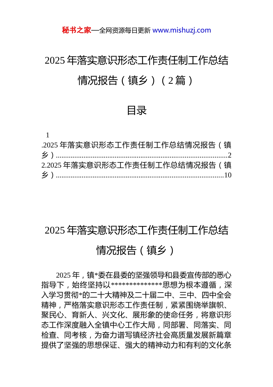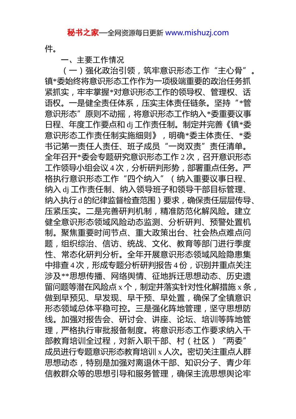 秘书之家—全网资源每日更新 www.mishuzj.com2025 年落实意识形态工作责任制工作总结情况报告(镇乡)(2 篇)目录1.2025 年落实意识形态工作责任制工作总结情况报告(镇乡).............................................................................................22.2025 年落实意识形态工作责任制工作总结情况报告(镇乡)...........................................................................................102025 年落实意识形态工作责任制工作总结情况报告(镇乡)2025 年,镇*委在县委的坚强领导和县委宣传部的悉心指导下,始终坚持以**************思想为根本遵循,深入学习贯彻*的二十大精神及二十届二中、三中、四中全会精神,严格落实意识形态工作责任制,紧紧围绕举旗帜、聚民心、育新人、兴文化、展形象的使命任务,将意识形态工作深度融入全镇中心工作大局,同部署、同落实、同检查、同考核,为奋力谱写镇经济社会高质量发展新篇章提供了坚强的思想保证、强大的精神动力和有利的文化条秘书之家—全网资源每日更新 www.mishuzj.com件。一、主要工作情况(一)强化政治引领,筑牢意识形态工作“主心骨”。镇*委始终将意识形态工作作为一项极端重要的政治任务抓紧抓实,牢牢掌握*对意识形态工作的领导权、管理权、话语权。一是健全责任体系,压实主体责任链条。坚持“*管意识形态”原则不动摇,将意识形态工作纳入*委重要议事日程、年度工作要点和 dj 工作责任制。制定并完善《镇*委意识形态工作责任制实施细则》,明确*委主体责任、*委书记第一责任人责任、班子成员“一岗双责”责任清单。全年召开*委会专题研究意识形态工作 2 次,召开意识形态工作领导小组会议 4 次,分析研判形势,部署重点任务。严格执行意识形态工作“四个纳入”(纳入重要议事日程、纳入 dj 工作责任制、纳入领导班子和领导干部目标管理、纳入执行 d 的纪律监督检查范围)要求,确保责任层层传导、压紧压实。二是完善研判机制,精准防范化解风险。建立健全意识形态领域风险动态监测、分析研判、预警处置机制。聚焦重要时间节点、重大政策出台、社会热点难点问题,组织综治、信访、统战、文化、教育等部门进行季度性、常态化研判分析。全年开展意识形态领域风险隐患集中排查 4 次,形成专题分析研判报告 4 份,识别并重点关注涉及**思想传播、网络舆情、征地拆迁思想动态、历史遗留问题等潜在风险点 x 个,制定并落实针对性化解措施 x 条,做到早预见、早发现、早干预、早处置,确保了全镇意识形态领域总体平稳可控。三是强化阵地管理,坚守思想防线。加强对报告会、研讨会、讲座、论坛、培训等阵地管理,严格执行审批报备制度。将意识形态工作要求纳入干部教育培训全过程,对新入职干部、村(社区)“两委”成员进行专题意识形态教育培训 x 人次。密切关注重点人群思想动态,特别是加强对离退休干部、知识分子、青少年信教群众等的思想引导和服务管理,确保主流思想舆论牢秘书之家—全网资源每日更新 www.mishuzj.com牢占据主导地位。(二)深化理论武装,夯实思想根基“压舱石”。坚持用*的创新理论凝心铸魂,推动**************思想在镇落地生根、深入人心。一是发挥“头雁效应”,强化中心组学习。突出镇*委理论学习中心组示范引领作用,科学制定年度学习计划,将意识形态相关内容作为重点学习专题创新学习形式,采取“集中研学+个人自学”、“专家辅导+现场教学”、“主题发言+交流研讨”相结合的模式。全年组织中心组集中学习研讨 12 次,其中专题学习研讨意识形态工作 4 次,中心组成员撰写学习心得、调研报告 x 篇,有效提升了班子成员的政治判断力、政治领悟力、政治执行力。二是创新理论宣讲,推动“飞入寻常百姓家”。精心打造“x 之声”理论宣讲品牌,组建由镇班子成员、优秀村支书、退休教师、青年*员、先进模范等构成的“理论宣传二人讲”特色宣讲团 x 支。紧密结合镇产业发展、乡村振兴、基层治理、乡风文明等实际,将“大道理”转化为“小故事”、“普通话”翻译成“地方话”。宣讲团成员深入田间地头、农家院落、企...
