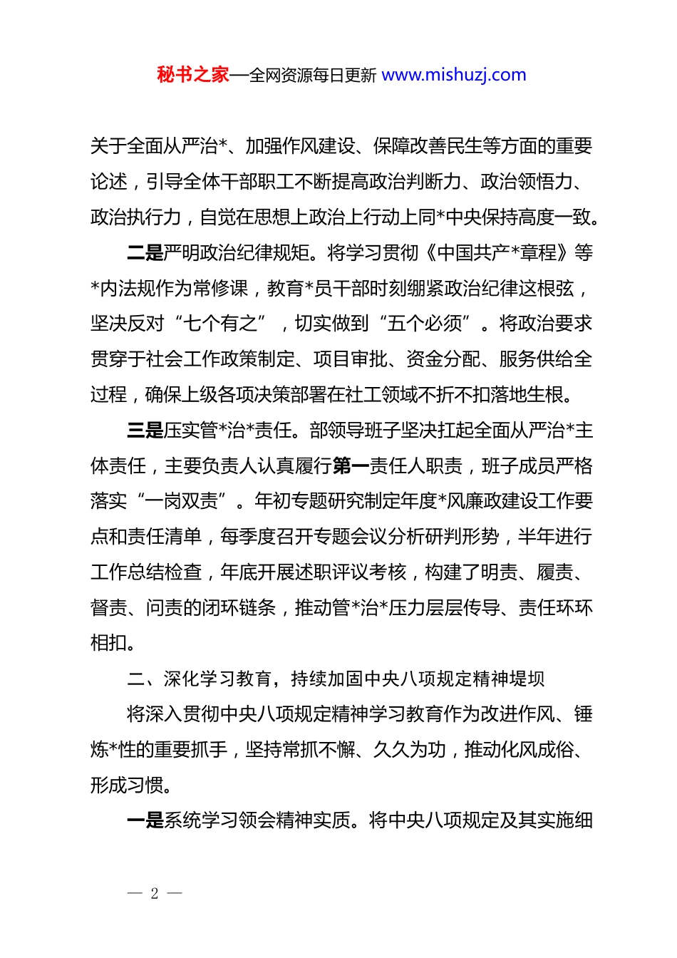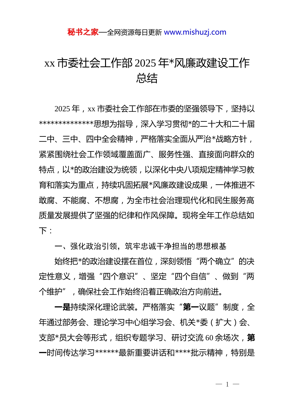 秘书之家—全网资源每日更新 www.mishuzj.comxx 市委社会工作部 2025 年*风廉政建设工作总结2025 年,xx 市委社会工作部在市委的坚强领导下,坚持以**************思想为指导,深入学习贯彻*的二十大和二十届二中、三中、四中全会精神,严格落实全面从严治*战略方针,紧紧围绕社会工作领域覆盖面广、服务性强、直接面向群众的特点,以*的政治建设为统领,以深化中央八项规定精神学习教育和落实为重点,持续巩固拓展*风廉政建设成果,一体推进不敢腐、不能腐、不想腐,为全市社会治理现代化和民生服务高质量发展提供了坚强的纪律和作风保障。现将全年工作总结如下:一、强化政治引领,筑牢忠诚干净担当的思想根基始终把*的政治建设摆在首位,深刻领悟“两个确立”的决定性意义,增强“四个意识”、坚定“四个自信”、做到“两个维护”,确保社会工作始终沿着正确政治方向前进。一是持续深化理论武装。严格落实“第一议题”制度,全年通过部务会、理论学习中心组学习会、机关*委(扩大)会、支部*员大会等形式,组织专题学习、研讨交流 60 余场次,第一时间传达学习******最新重要讲话和****批示精神,特别是— 1 —秘书之家—全网资源每日更新 www.mishuzj.com关于全面从严治*、加强作风建设、保障改善民生等方面的重要论述,引导全体干部职工不断提高政治判断力、政治领悟力、政治执行力,自觉在思想上政治上行动上同*中央保持高度一致。二是严明政治纪律规矩。将学习贯彻《中国共产*章程》等*内法规作为常修课,教育*员干部时刻绷紧政治纪律这根弦,坚决反对“七个有之”,切实做到“五个必须”。将政治要求贯穿于社会工作政策制定、项目审批、资金分配、服务供给全过程,确保上级各项决策部署在社工领域不折不扣落地生根。三是压实管*治*责任。部领导班子坚决扛起全面从严治*主体责任,主要负责人认真履行第一责任人职责,班子成员严格落实“一岗双责”。年初专题研究制定年度*风廉政建设工作要点和责任清单,每季度召开专题会议分析研判形势,半年进行工作总结检查,年底开展述职评议考核,构建了明责、履责、督责、问责的闭环链条,推动管*治*压力层层传导、责任环环相扣。二、深化学习教育,持续加固中央八项规定精神堤坝将深入贯彻中央八项规定精神学习教育作为改进作风、锤炼*性的重要抓手,坚持常抓不懈、久久为功,推动化风成俗、形成习惯。一是系统学习领会精神实质。将中央八项规定及其实施细— 2 —秘书之家—全网资源每日更新 www.mishuzj.com则精神作为*员干部教育培训的必修内容。全年组织开展专题学习会、辅导报告会 12 次,原原本本、逐条逐句学习相关规定,深刻领会其核心要义和实践要求,引导*员干部准确把握新形势下反“四风”的规律特点和工作重点,充分认识中央八项规定是长期有效的铁规矩、硬杠杠。二是深入开展警示教育。坚持正面引导与反面警示相结合。年内组织召开全市社工系统警示教育大会 3 次,选取近年来查处的违反中央八项规定精神典型问题,特别是涉及民生服务、社会治理领域的形式主义、官僚主义、享乐主义、奢靡之风案例,进行深入剖析通报。组织集中观看《作风之鉴》《破“网”祛“魅”》等警示教育片,用“身边事”教育“身边人”,让*员干部受警醒、明底线、知敬畏。部机关各支部书记结合工作实际讲授作风建设专题*课共计 15 次。三是丰富学习教育载体。结合社会工作贴近基层、贴近群众的实际,创新教育形式。利用“好德行”线上平台开设“清风社工”专栏,定期推送廉洁文化、作风纪律相关知识解读和案例警示。依托“滨河热线”、基层观察点等载体,收集群众反映强烈的作风问题,作为学习教育和整改落实的鲜活教材。组织*员干部赴红色教育基地、廉洁文化示范基地开展现场教学、主题*日活动 8 场,在沉浸式体验中强化宗旨意识和纪律观念。— 3 —秘书之家—全网资源每日更新 www.mishuzj.com四是对照检视促整改。要求全体干部职工,特别是领导干部,对照中央八项规定精神要求,深入查摆在调查研究、会议活动、文件简报、出访出差、公务接待、办公用房、公车使用、津补贴发放、联系服务群众等方面存在的差距和不足。...