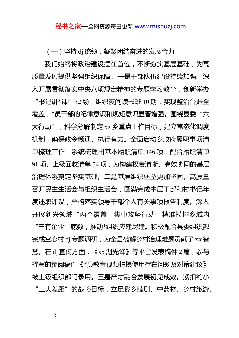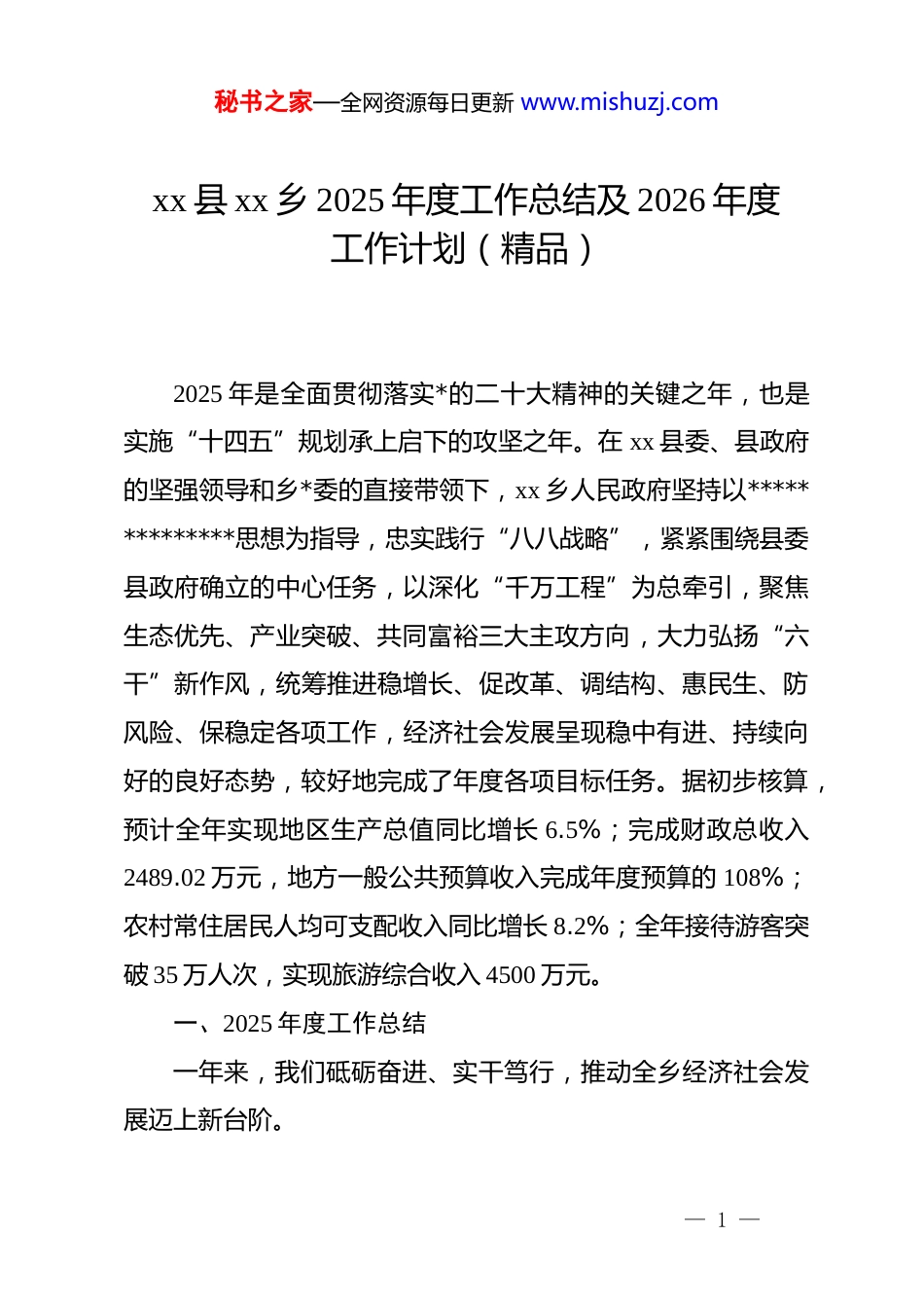秘书之家—全网资源每日更新 www.mishuzj.comxx 县 xx 乡 2025 年度工作总结及 2026 年度工作计划(精品)2025 年是全面贯彻落实*的二十大精神的关键之年,也是实施“十四五”规划承上启下的攻坚之年。在 xx 县委、县政府的坚强领导和乡*委的直接带领下,xx 乡人民政府坚持以**************思想为指导,忠实践行“八八战略”,紧紧围绕县委县政府确立的中心任务,以深化“千万工程”为总牵引,聚焦生态优先、产业突破、共同富裕三大主攻方向,大力弘扬“六干”新作风,统筹推进稳增长、促改革、调结构、惠民生、防风险、保稳定各项工作,经济社会发展呈现稳中有进、持续向好的良好态势,较好地完成了年度各项目标任务。据初步核算,预计全年实现地区生产总值同比增长 6.5%;完成财政总收入2489.02 万元,地方一般公共预算收入完成年度预算的 108%;农村常住居民人均可支配收入同比增长 8.2%;全年接待游客突破 35 万人次,实现旅游综合收入 4500 万元。一、2025 年度工作总结一年来,我们砥砺奋进、实干笃行,推动全乡经济社会发展迈上新台阶。— 1 —秘书之家—全网资源每日更新 www.mishuzj.com(一)坚持 dj 统领,凝聚团结奋进的发展合力我们始终将政治建设摆在首位,不断夯实基层基础,为高质量发展提供坚强组织保障。一是干部队伍建设持续加强。深入开展贯彻落实中央八项规定精神的专题学习教育,创新举办“书记讲*课”32 场,组织夜间读书班 10 期,实现整治台账全覆盖,*员干部的纪律意识和规矩意识显著增强。围绕县委“六大行动”,科学分解制定 xx 乡重点工作目标,建立常态化调度机制,确保政令畅通、执行有力。全面启动乡政府履职事项清单梳理工作,系统梳理出基本履职清单 146 项、配合履职清单91 项、上级回收清单 54 项,为构建权责清晰、高效协同的基层治理体系奠定坚实基础。二是基层组织堡垒更加坚固。高质量召开民主生活会与组织生活会,圆满完成中层干部和村书记年度述职评议,严格落实领导干部个人有关事项报告制度。深入开展新兴领域“两个覆盖”集中攻坚行动,精准摸排乡域内“三有企业”底数,推动*组织应建尽建。积极配合县委组织部完成空心村 dj 专题调研,为全县破解乡村治理难题贡献了 xx 智慧。在 dj 宣传方面,《xx 湖先锋》等平台发表稿件 2 篇,参与撰写的参阅稿件《*员教育视频拍摄使用存在问题及对策建议》被上级组织部门录用。三是产才融合发展初见成效。紧扣缩小“三大差距”的战略目标,立足我乡睦剧、中药材、乡村旅游、— 2 —秘书之家—全网资源每日更新 www.mishuzj.com实验动物等特色产业资源,靶向引才、精准育才。成功引育国家级高层次人才 1 名;与享受国务院津贴的 xx 教授团队深化“xxxx”课题合作;与省内知名植物研究所的 xx 教授团队在覆盆子标准化育苗和种植领域建立合作关系;与省林科院联合开展“山核桃生物防治和土壤改良”等关键技术攻关,为产业发展注入了强劲的科技动力。(二)聚焦产业升级,增强三产融合的经济动能我们坚持把发展经济的着力点放在实体经济上,推动农文旅深度融合,加快构建现代化产业体系。一是农林产业实现提质增效。大力推进农业全产业链发展,农业增加值同比增长4.2%。粮食生产安全基础稳固,完成小麦种植 150 亩、晚稻种植 280 亩。特色农业蓬勃发展,新建 xx 村、xx 村等高山蔬菜基地 20 亩,生猪、走地鸡、稻田鱼、稻蛙等生态养殖规模持续扩大,浙贝母、夏秋茶等优势产业稳定增长。与龙头企业合作,完成高山红花油茶花瓣收购 20 吨,有效带动农户增收。农业现代化步伐加快,农作物耕种收综合机械化水平提升至 60%,农产品质量安全监测合格率保持在 99.99%以上。创新实施“一季稻+浙贝母”综合轮种模式,建成“稻+药”轮种基地 110 余亩,2025 年该模式产生直接经济效益超 160 万元,新增季节性就业岗位 50 余个,带动周边农户增收 20 万余元。二是工业发展动— 3 —秘书之家—全网资源每日更新 www.mishuzj.com能持续增强。重点项目建设取得新进展,xx 县 xx 建材有限公司新建厂房项目总投资约 2500 万元...