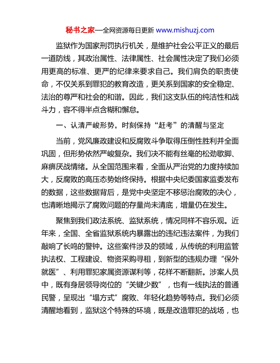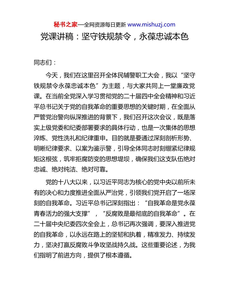 秘书之家—全网资源每日更新 www.mishuzj.com党课讲稿:坚守铁规禁令,永葆忠诚本色同志们:今天,我们在这里召开全体民辅警职工大会,我以“坚守铁规禁令永葆忠诚本色”为主题,与大家共同上一堂廉政党课。在当前全党深入学习贯彻党的二十届四中全会精神和习近平总书记关于党的自我革命的重要思想的关键时期,在全面从严管党治警向纵深推进的背景下,我们召开这次会议,既是落实上级党委和纪委部署要求的具体行动,也是一次集体的思想淬炼、党性洗礼和纪律重申。目的就是要通过深刻剖析形势、明晰纪律要求、以案为鉴示警,引导全体同志时刻绷紧纪律规矩这根弦,筑牢拒腐防变的思想堤坝,确保我们这支队伍绝对忠诚、绝对纯洁、绝对可靠。党的十八大以来,以习近平同志为核心的党中央以前所未有的决心和力度推进全面从严治党,引领我们党开启了一场深刻的自我革命。习近平总书记深刻指出:“自我革命是党永葆青春活力的强大支撑”,“反腐败是最彻底的自我革命”。在二十届中央纪委四次全会上,总书记再次强调,要深入推进党的自我革命,以永远在路上的坚韧和执着,精准发力、持续发力,坚决打赢反腐败斗争攻坚战持久战。这些重要论述,为我们指明了前进方向,提供了根本遵循。秘书之家—全网资源每日更新 www.mishuzj.com监狱作为国家刑罚执行机关,是维护社会公平正义的最后一道防线,其政治属性、法律属性、社会属性决定了我们必须用更高的标准、更严的纪律来要求自己。我们肩负的职责使命,不仅关系到罪犯的教育改造,更关系到国家的安全稳定、法治的尊严和社会的和谐。因此,我们这支队伍的纯洁性和战斗力,容不得半点含糊和懈怠。一、认清严峻形势,时刻保持“赶考”的清醒与坚定当前,党风廉政建设和反腐败斗争取得压倒性胜利并全面巩固,但形势依然严峻复杂。我们决不能有丝毫的松劲歇脚、麻痹厌战情绪。从全国范围来看,全面从严治党的力度持续加大,反腐败的高压态势始终保持。根据中央纪委国家监委发布的数据,这些数据背后,是党中央坚定不移惩治腐败的决心,也清晰地揭示了腐败问题的存量尚未清底,增量仍在发生。聚焦到我们政法系统、监狱系统,情况同样不容乐观。近年来,全国、全省监狱系统内暴露出的违纪违法案件,为我们敲响了长鸣的警钟。这些案件涉及的领域,从传统的利用监管执法权、工程建设、物资采购寻租,到新型的违规办理“保外就医”、利用罪犯家属资源谋利等,花样不断翻新。涉案人员中,既有身居领导岗位的“关键少数”,也有一线执法的普通民警,呈现出“塌方式”腐败、年轻化趋势等特点。我们必须清醒地看到,监狱这个特殊的环境,既是改造罪犯的战场,也秘书之家—全网资源每日更新 www.mishuzj.com是考验我们民警职工队伍定力的考场。我们每天面对的是形形色色的罪犯及其背后的复杂社会关系,长期处于高墙之内,容易产生职业倦怠和思想松懈。一些不法分子和社会势力,总是千方百计地对我们进行拉拢、腐蚀和“围猎”。稍有不慎,就可能被拖下水,成为金钱、人情、关系的俘虏。我们监狱的整体情况是好的,绝大多数同志能够恪尽职守、廉洁奉公,为监狱的安全稳定和发展作出了重要贡献。但我们也要正视自身存在的问题和风险。从近两年的内部监督检查和执纪情况来看,一些苗头性、倾向性问题依然存在。比如,有的同志纪律意识淡薄,对制度规定置若罔闻,执行打折扣、搞变通;有的同志“八小时之外”自我约束不严,与社会人员交往过密,存在廉政风险;有的同志对“微腐败”的危害认识不足,认为吃点、拿点、占点是小事,无伤大雅;还有的同志面对歪风邪气不敢斗争,信奉“好人主义”,监督责任虚化弱化。这些问题虽然发生在少数人身上,但其产生的负面影响不可低估,必须引起我们全体同志的高度警惕。我们必须深刻认识到,党风廉政建设永远在路上,反腐败斗争是一场输不起也决不能输的重大政治斗争。每一名同志都要把自己摆进去、把工作摆进去、把思想摆进去,深刻汲取“身边人”“身边事”的教训,时刻保持如履薄冰的谨慎、如临深渊的警醒,以“赶考”的心态答好廉洁从警这份时代答卷。二、严守纪律规矩,筑牢不可逾越的“四道防线”秘书之家—全网...