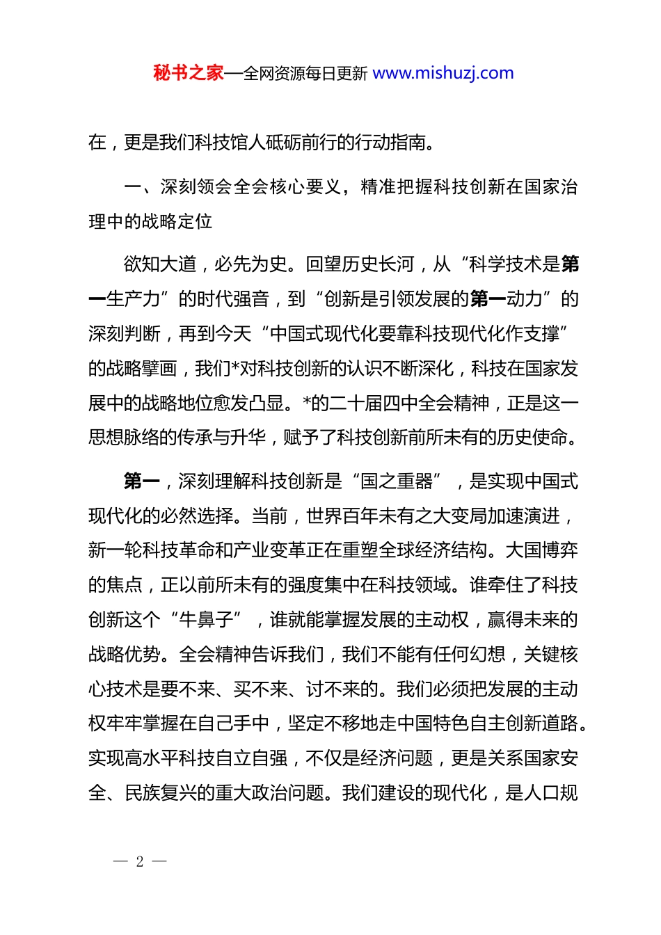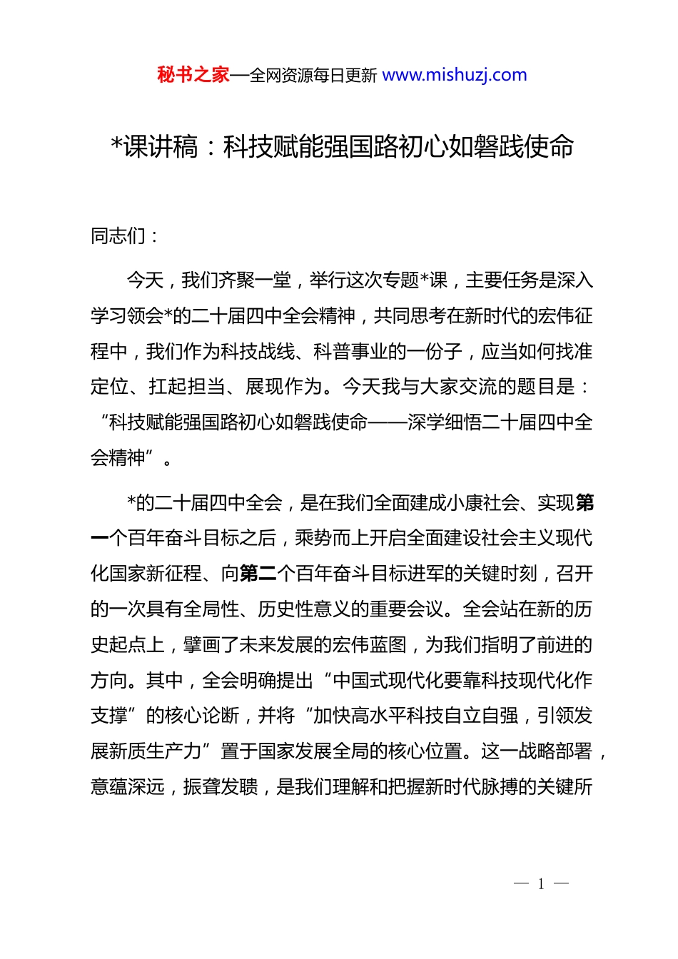 秘书之家—全网资源每日更新 www.mishuzj.com*课讲稿:科技赋能强国路初心如磐践使命同志们:今天,我们齐聚一堂,举行这次专题*课,主要任务是深入学习领会*的二十届四中全会精神,共同思考在新时代的宏伟征程中,我们作为科技战线、科普事业的一份子,应当如何找准定位、扛起担当、展现作为。今天我与大家交流的题目是:“科技赋能强国路初心如磐践使命——深学细悟二十届四中全会精神”。*的二十届四中全会,是在我们全面建成小康社会、实现第一个百年奋斗目标之后,乘势而上开启全面建设社会主义现代化国家新征程、向第二个百年奋斗目标进军的关键时刻,召开的一次具有全局性、历史性意义的重要会议。全会站在新的历史起点上,擘画了未来发展的宏伟蓝图,为我们指明了前进的方向。其中,全会明确提出“中国式现代化要靠科技现代化作支撑”的核心论断,并将“加快高水平科技自立自强,引领发展新质生产力”置于国家发展全局的核心位置。这一战略部署,意蕴深远,振聋发聩,是我们理解和把握新时代脉搏的关键所— 1 —秘书之家—全网资源每日更新 www.mishuzj.com在,更是我们科技馆人砥砺前行的行动指南。一、深刻领会全会核心要义,精准把握科技创新在国家治理中的战略定位欲知大道,必先为史。回望历史长河,从“科学技术是第一生产力”的时代强音,到“创新是引领发展的第一动力”的深刻判断,再到今天“中国式现代化要靠科技现代化作支撑”的战略擘画,我们*对科技创新的认识不断深化,科技在国家发展中的战略地位愈发凸显。*的二十届四中全会精神,正是这一思想脉络的传承与升华,赋予了科技创新前所未有的历史使命。第一,深刻理解科技创新是“国之重器”,是实现中国式现代化的必然选择。当前,世界百年未有之大变局加速演进,新一轮科技革命和产业变革正在重塑全球经济结构。大国博弈的焦点,正以前所未有的强度集中在科技领域。谁牵住了科技创新这个“牛鼻子”,谁就能掌握发展的主动权,赢得未来的战略优势。全会精神告诉我们,我们不能有任何幻想,关键核心技术是要不来、买不来、讨不来的。我们必须把发展的主动权牢牢掌握在自己手中,坚定不移地走中国特色自主创新道路。实现高水平科技自立自强,不仅是经济问题,更是关系国家安全、民族复兴的重大政治问题。我们建设的现代化,是人口规— 2 —秘书之家—全网资源每日更新 www.mishuzj.com模巨大的现代化,是全体人民共同富裕的现代化,是物质文明和精神文明相协调的现代化,是人与自然和谐共生的现代化,是走和平发展道路的现代化。这五大特征,无一不依赖于强大的科技实力作为支撑。没有科技的现代化,就没有高质量发展的坚实基础,就没有国家治理体系和治理能力现代化的有力保障。第二,深刻理解新质生产力是“核心引擎”,是推动高质量发展的内在要求。全会强调“引领发展新质生产力”,这是一个具有划时代意义的重大理论创新。新质生产力,其特点是创新,关键在质优,本质是先进生产力。它摆脱了传统经济增长方式、生产力发展路径,是由技术革命性突破、生产要素创新性配置、产业深度转型升级而催生的。从人工智能、量子信息,到生物制造、商业航天,再到低空经济、新材料等战略性新兴产业和未来产业,这些都是新质生产力的具体体现。发展新质生产力,就是要摆脱对传统要素投入的依赖,转向依靠科技创新驱动,实现发展动能的根本转换。这要求我们必须加强基础研究,打好关键核心技术攻坚战,促进科技成果加快转化为现实生产力,为经济社会发展注入源源不断的新动能。第三,深刻理解“三位一体”是“战略基石”,是建设科— 3 —秘书之家—全网资源每日更新 www.mishuzj.com技强国的系统布局。全会精神与*的二十大报告一脉相承,持续强调了将教育、科技、人才作为一个有机整体统筹推进的极端重要性。教育是基础,为科技创新提供源源不断的人才供给;科技是核心,是推动经济社会发展的根本动力;人才是第一资源,是科技创新的主体和决定性力量。三者相互依存、相互促进,共同构成了支撑国家现代化的战略基石。我们必须坚持教育优先发展、科技自立自强、人才引领驱动,一体化部署,一体化推进。这不仅...