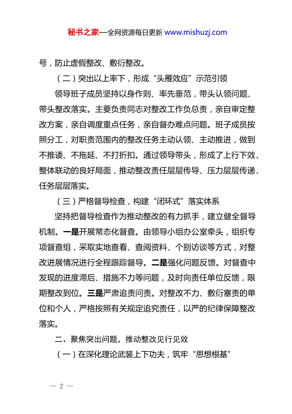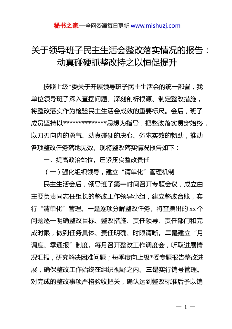 秘书之家—全网资源每日更新 www.mishuzj.com关于领导班子民主生活会整改落实情况的报告:动真碰硬抓整改持之以恒促提升按照上级*委关于开展领导班子民主生活会的统一部署,我单位领导班子深入查摆问题、深刻剖析根源、制定整改措施,将整改落实作为检验民主生活会成效的重要标尺。会后,班子成员坚持以**************思想为指导,把整改落实贯穿始终,以刀刃向内的勇气、动真碰硬的决心、务求实效的韧劲,推动各项整改任务落地见效。现将整改落实情况报告如下:一、提高政治站位,压紧压实整改责任(一)强化组织领导,建立“清单化”管理机制民主生活会后,领导班子第一时间召开专题会议,成立由主要负责同志任组长的整改工作领导小组,建立整改台账,实行“清单化”管理。一是逐项分解整改任务。将查摆出的 xx 个问题逐一明确整改目标、整改措施、责任领导、责任部门和完成时限,做到任务具体、责任明确、时限清晰。二是建立“月调度、季通报”制度。每月召开整改工作调度会,听取进展情况汇报,研究解决困难问题;每季度向上级*委专题报告整改进展,确保整改工作始终在组织视野之内。三是实行销号管理。对完成的整改事项严格验收把关,确认达到整改标准后予以销— 1 —秘书之家—全网资源每日更新 www.mishuzj.com号,防止虚假整改、敷衍整改。(二)突出以上率下,形成“头雁效应”示范引领领导班子成员坚持以身作则、率先垂范,带头认领问题、带头整改落实。主要负责同志对整改工作负总责,亲自审定整改方案,亲自调度重点任务,亲自督办难点问题。班子成员按照分工,对职责范围内的整改任务主动认领、主动推进,做到不推诿、不拖延、不打折扣。通过领导带头,形成了上行下效、整体联动的良好局面,推动整改责任层层传导、压力层层传递、任务层层落实。(三)严格督导检查,构建“闭环式”落实体系坚持把督导检查作为推动整改的有力抓手,建立健全督导机制。一是开展常态化督查。由领导小组办公室牵头,组织专项督查组,采取实地查看、查阅资料、个别访谈等方式,对整改进展情况进行全程跟踪督导。二是强化问题反馈。对督查中发现的进度滞后、措施不力等问题,及时向责任单位反馈,限期整改到位。三是严肃追责问责。对整改不力、敷衍塞责的单位和个人,严格按照有关规定追究责任,以严的纪律保障整改落实。二、聚焦突出问题,推动整改见行见效(一)在深化理论武装上下功夫,筑牢“思想根基”— 2 —秘书之家—全网资源每日更新 www.mishuzj.com针对理论学习不够深入、学用结合不够紧密的问题,领导班子把强化理论武装作为整改的首要任务。一是完善学习制度。修订*委理论学习中心组学习规则,明确学习内容、学习形式和学习要求,确保集中学习每月不少于 1 次、全年不少于 xx 次。二是创新学习方式。采取专题辅导、研讨交流、实地调研等多种形式,增强学习的针对性和实效性。邀请专家学者作专题辅导 xx 场次,组织班子成员围绕重点课题开展调研 xx 次。三是深化成果转化。建立学习成果转化机制,要求班子成员每季度至少撰写 1 篇调研报告或理论文章,推动理论学习与指导实践、推动工作有机结合。(二)在改进工作作风上求突破,密切“鱼水关系”针对深入基层不够、联系群众不够紧密的问题,领导班子大力改进工作作风。一是建立定期下基层制度。要求班子成员每月至少到基层一线调研 xx 天,面对面听取群众意见建议,实打实解决实际困难。整改以来,班子成员累计深入基层 xx 次,走访群众 xx 人次。二是畅通诉求表达渠道。开通“领导信箱”“民生热线”,设立固定接访日,完善信访办理机制,确保群众诉求件件有着落、事事有回音。共受理群众诉求 xx 件,办结率达 xx%,满意率达 xx%。三是办好民生实事。聚焦群众“急难愁盼”问题,梳理形成年度民生实事清单,建立工作台账,— 3 —秘书之家—全网资源每日更新 www.mishuzj.com实行挂图作战。目前,xx 项民生实事已完成 xx 项,其余正在加快推进。(三)在推动事业发展上见实效,激发“内生动力”针对担当作为不够、攻坚克难魄力不足的问题,领导班子强化使命担当。一是聚焦主责主业攻坚克难...
